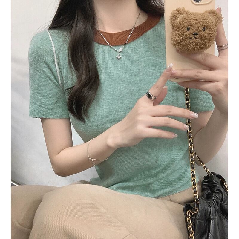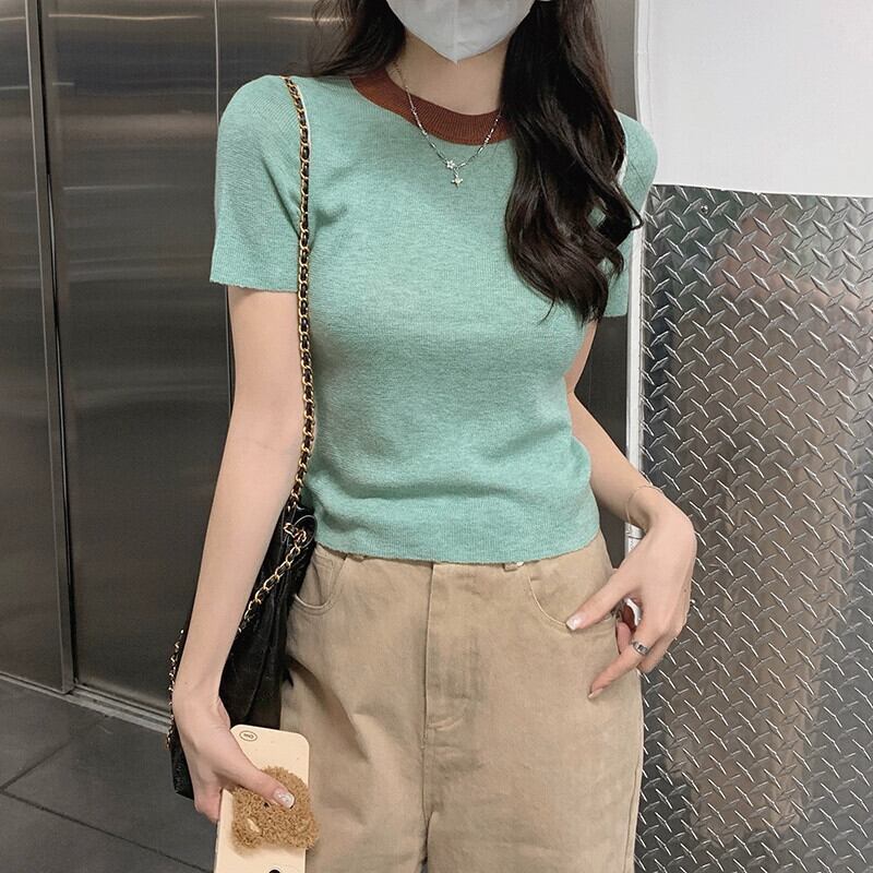 夏の薄いアイスシルクニット半袖Tシャツの女性、ファッショナブルでスリム、ショートカラーブロックラウンドネックトップグリーン サマー 夏物 Oネック 7460070906812808 | framboise21