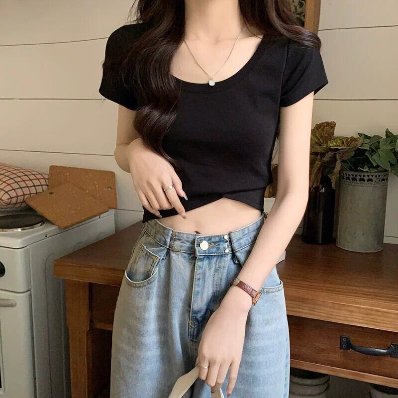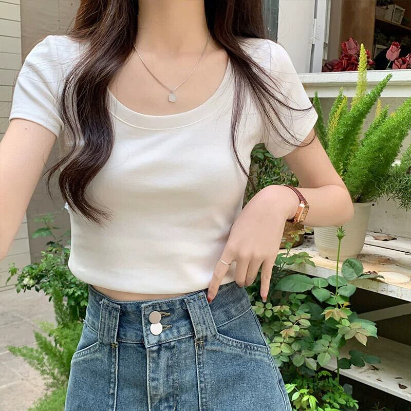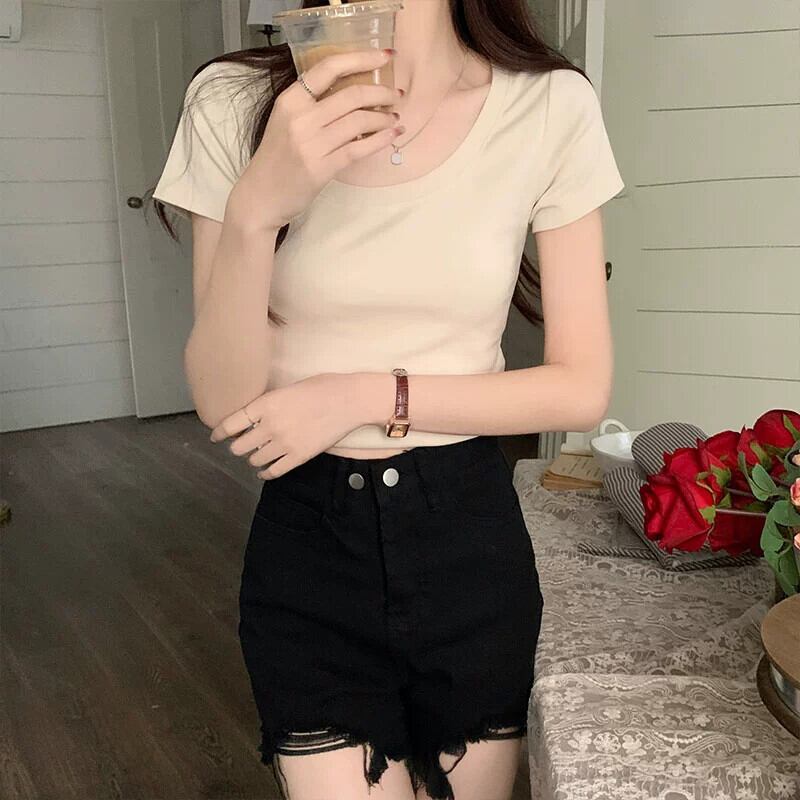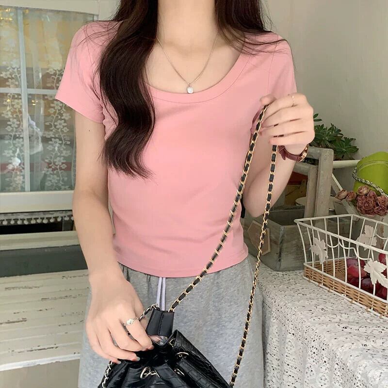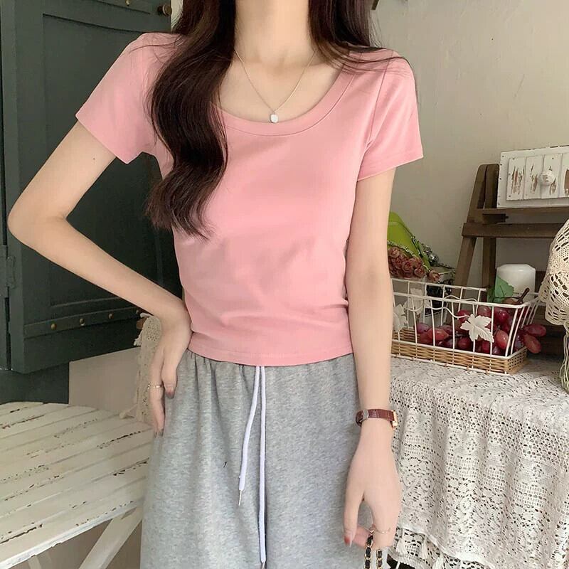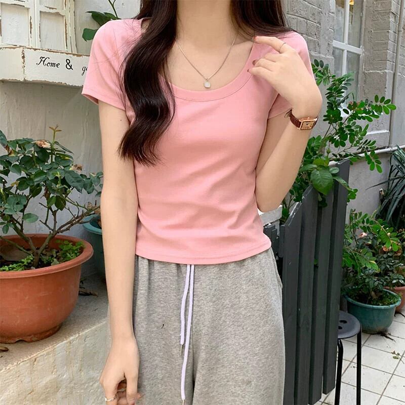 ピンクショルダー純粋な綿半袖 tシャツ女性の夏のファッションスリムフィット小さなハイウエストショートラウンドネックトップ ハイウェスト コットン サマー 夏物 Oネック ピュア 7460016046058797 | framboise21