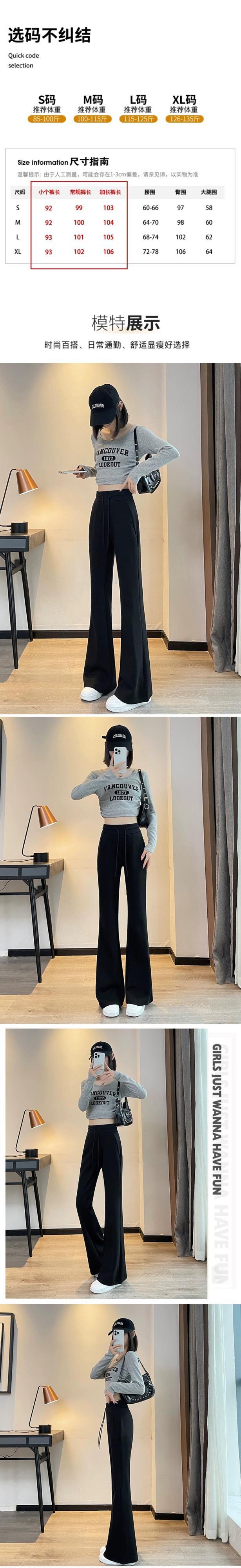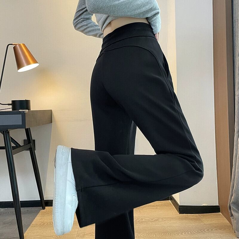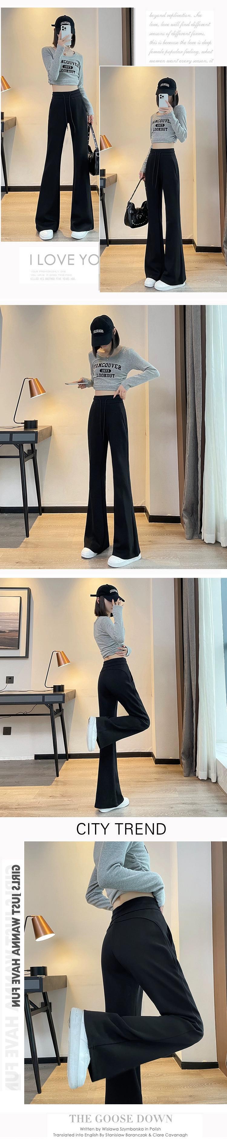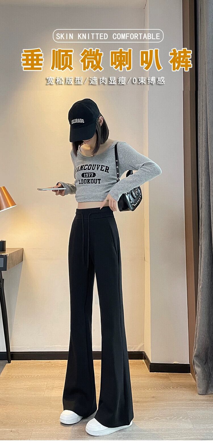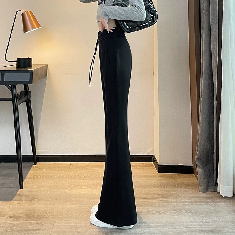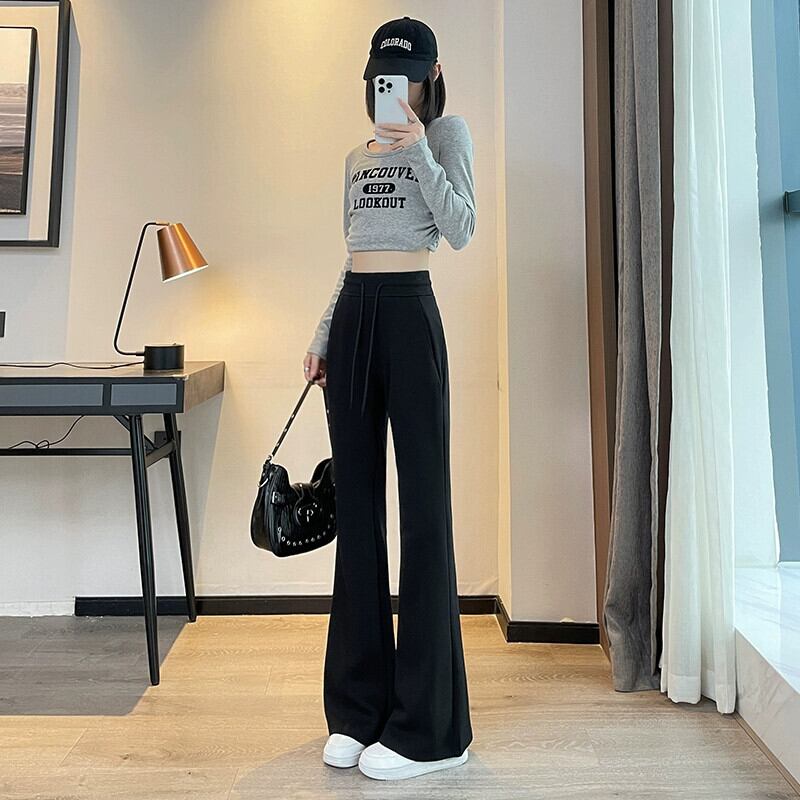黒のストレートレッグマイクロフレアパンツレディース、春と秋のカジュアルスポーツパンツ、ハイウエスト、スリム、汎用性の高いフロアレングスのナローワイドレッグパンツ ブラック スプリング 春物 オータム 秋物 7460026299770923 | framboise21
