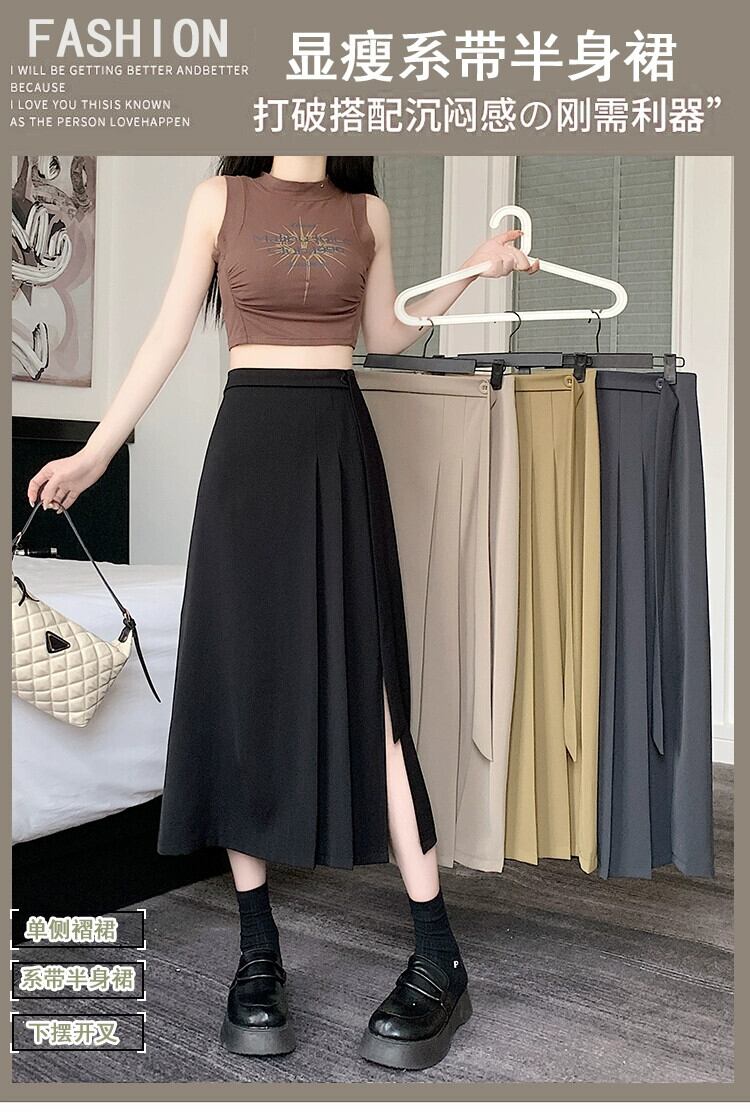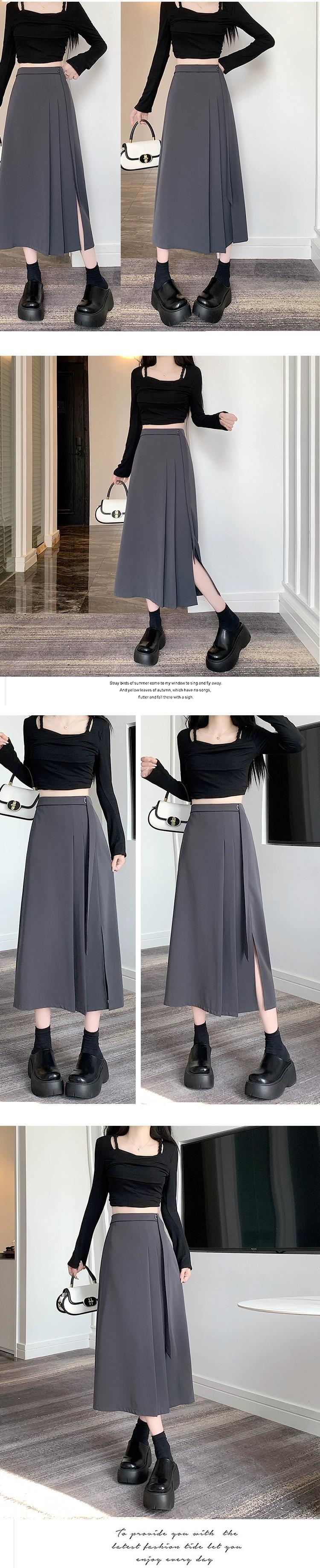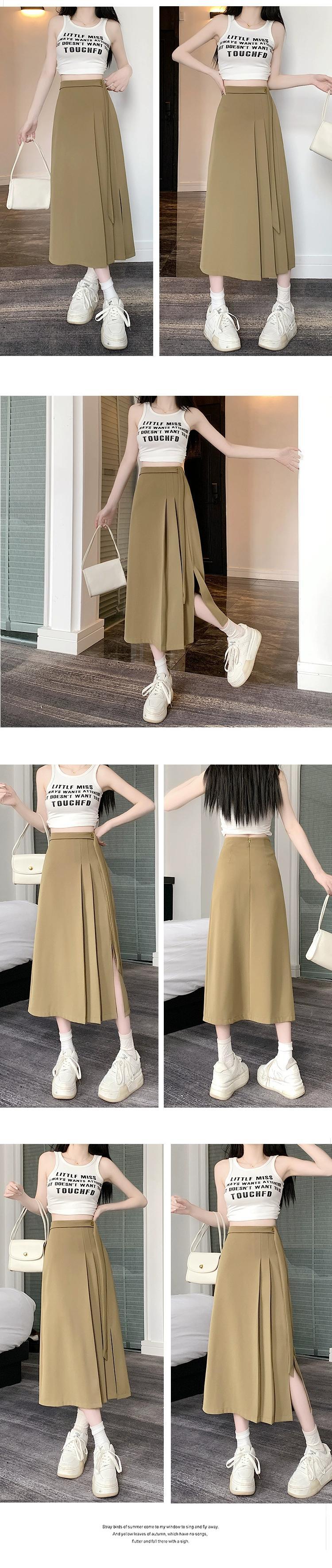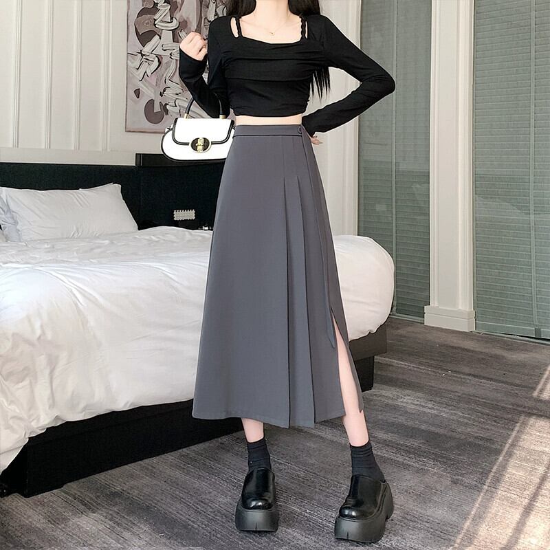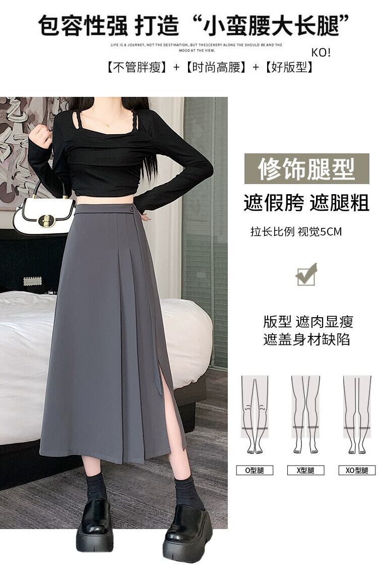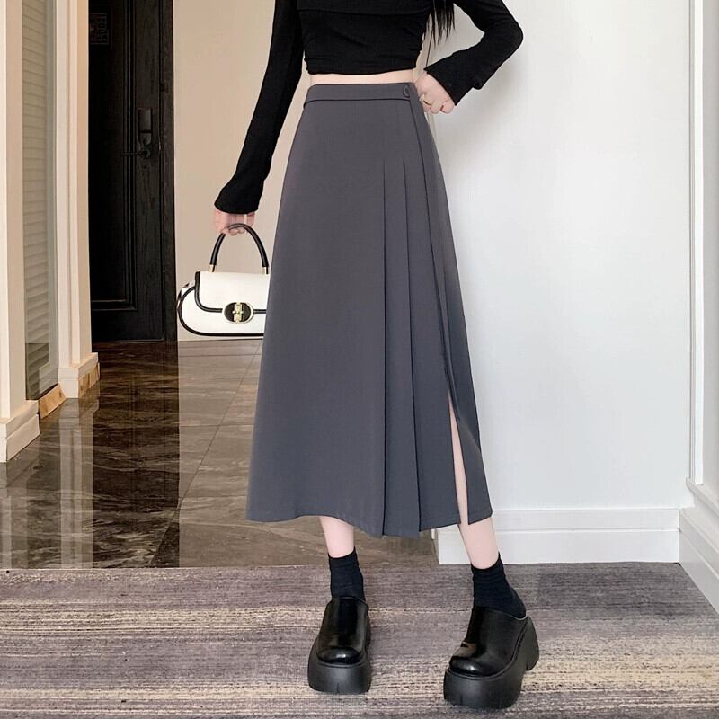 -エンドグレープリーツスカートレディース、春夏ハイウエストスーツスカート股間をカバーしてスリムに見せてくれるミモレ丈のスリットAラインスカート スプリング 春物 サマー 夏物 74600757706452 | framboise21