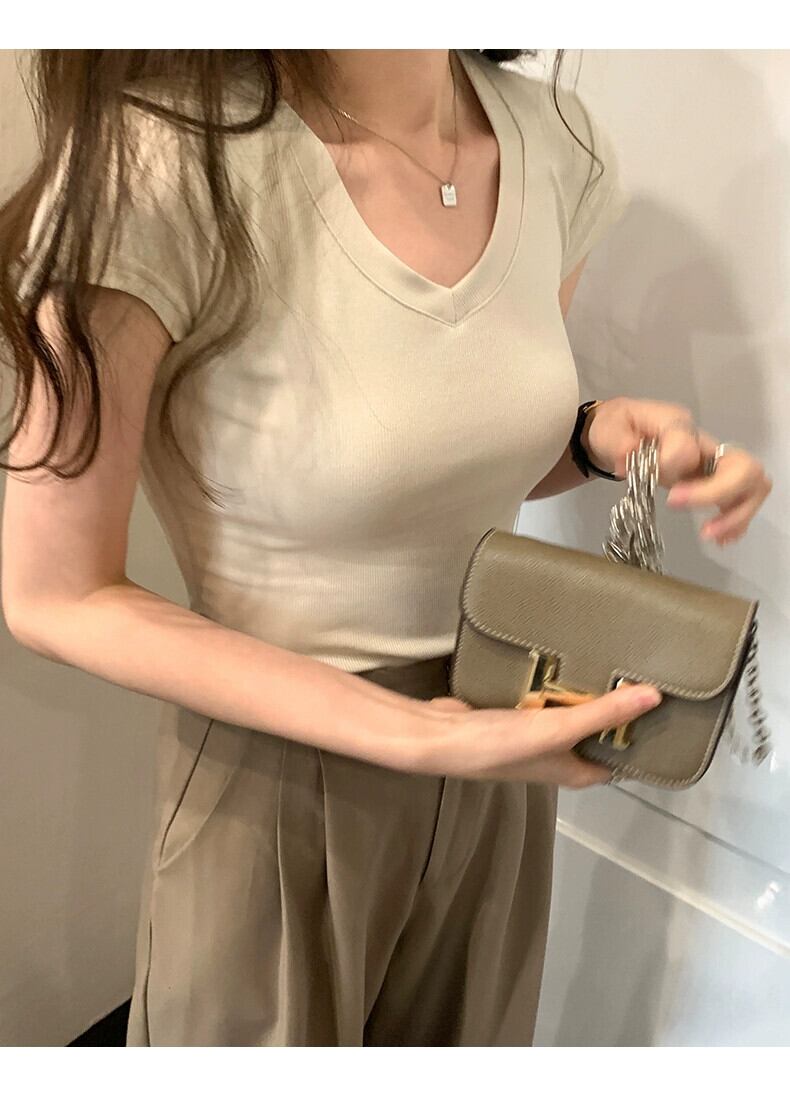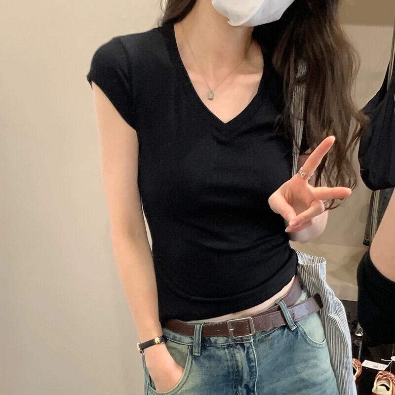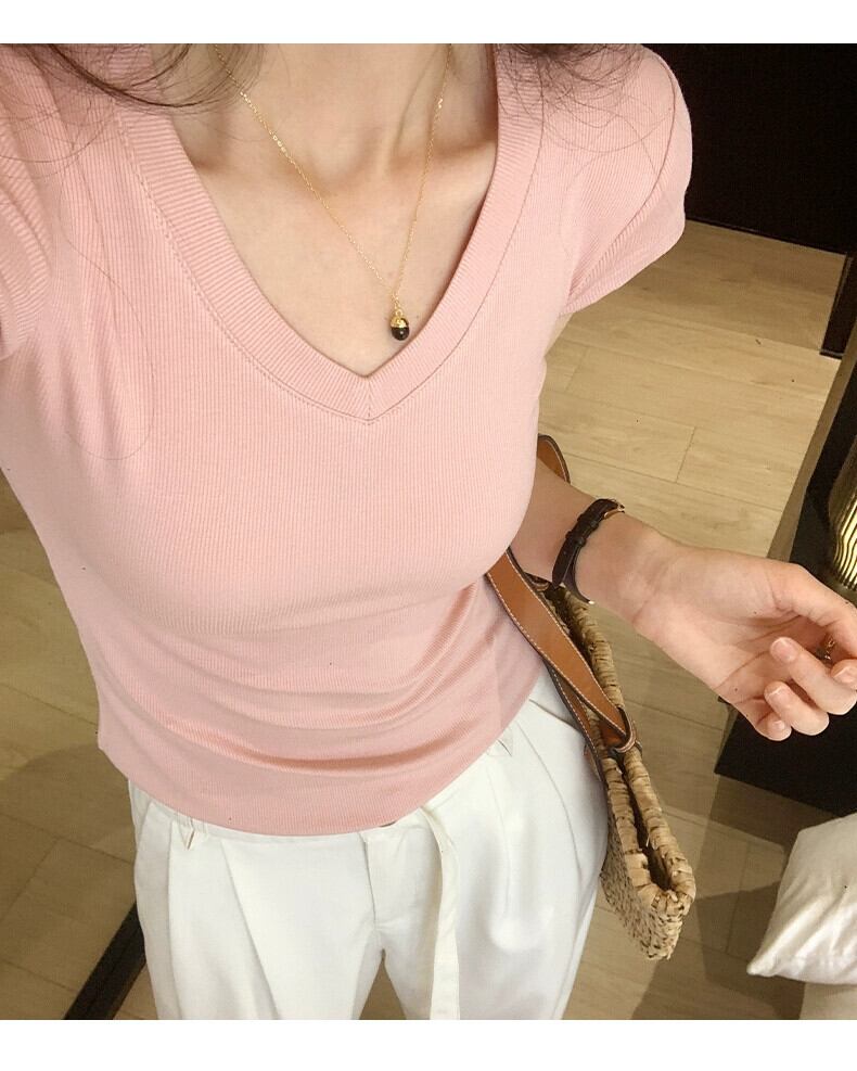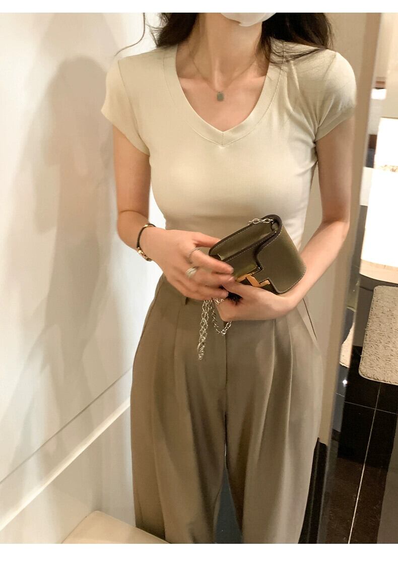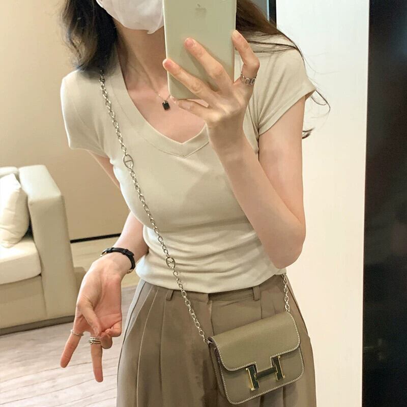 アプリコット右肩半袖 Tシャツ女性 2024 夏の新作スリム、ファッショナブルで多用途な露出鎖骨低 V ネックショートトップ サマー 夏物 Vネック 7460045081407759 | framboise21