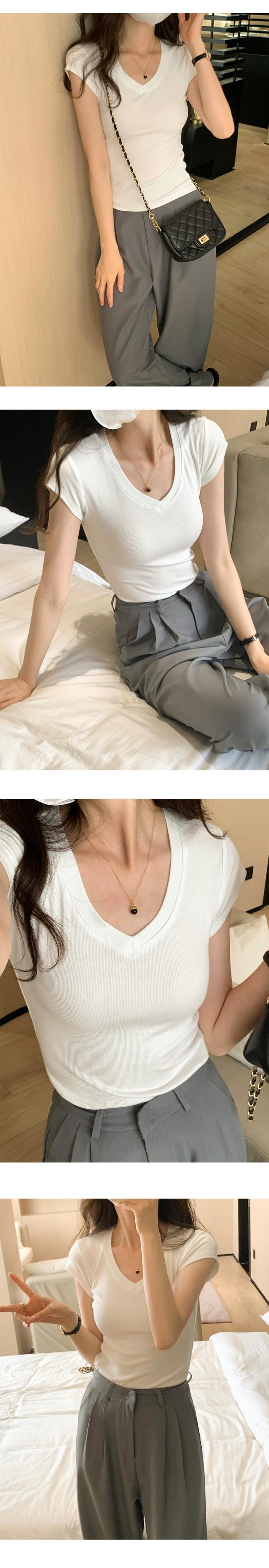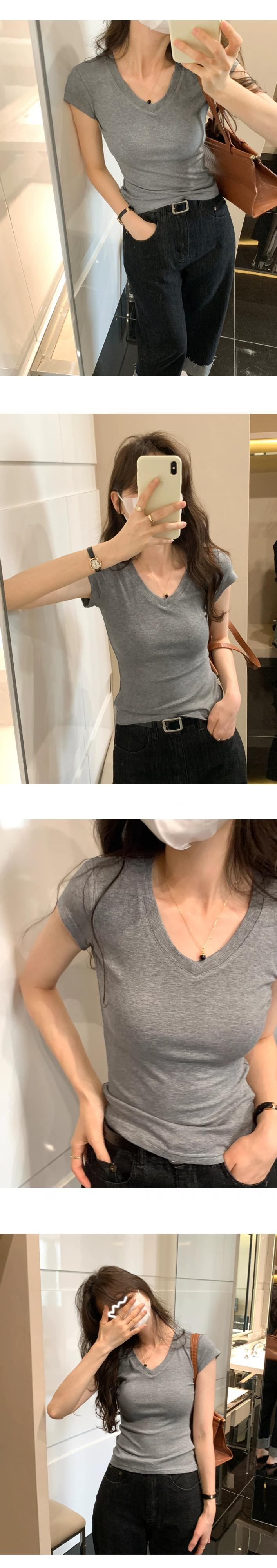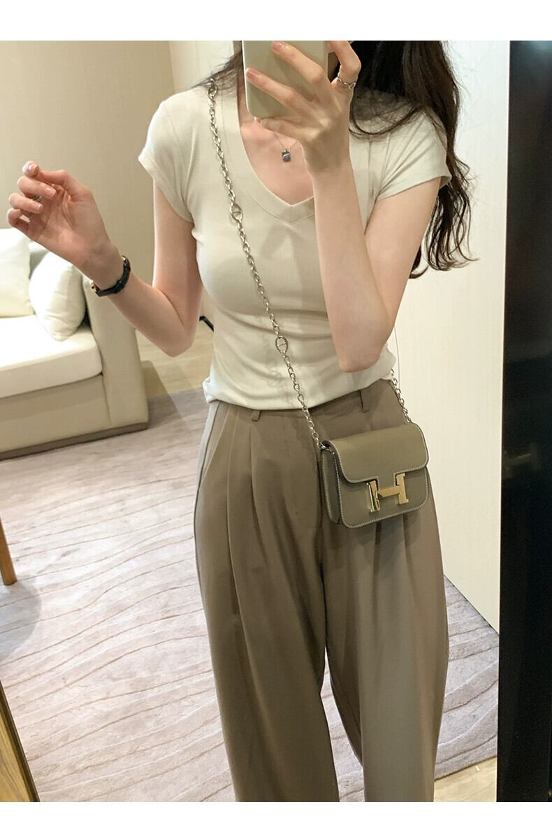 アプリコット右肩半袖 Tシャツ女性 2024 夏の新作スリム、ファッショナブルで多用途な露出鎖骨低 V ネックショートトップ サマー 夏物 Vネック 7460045081407759 | framboise21