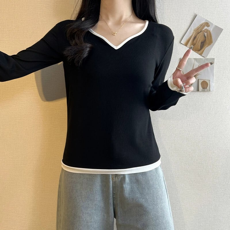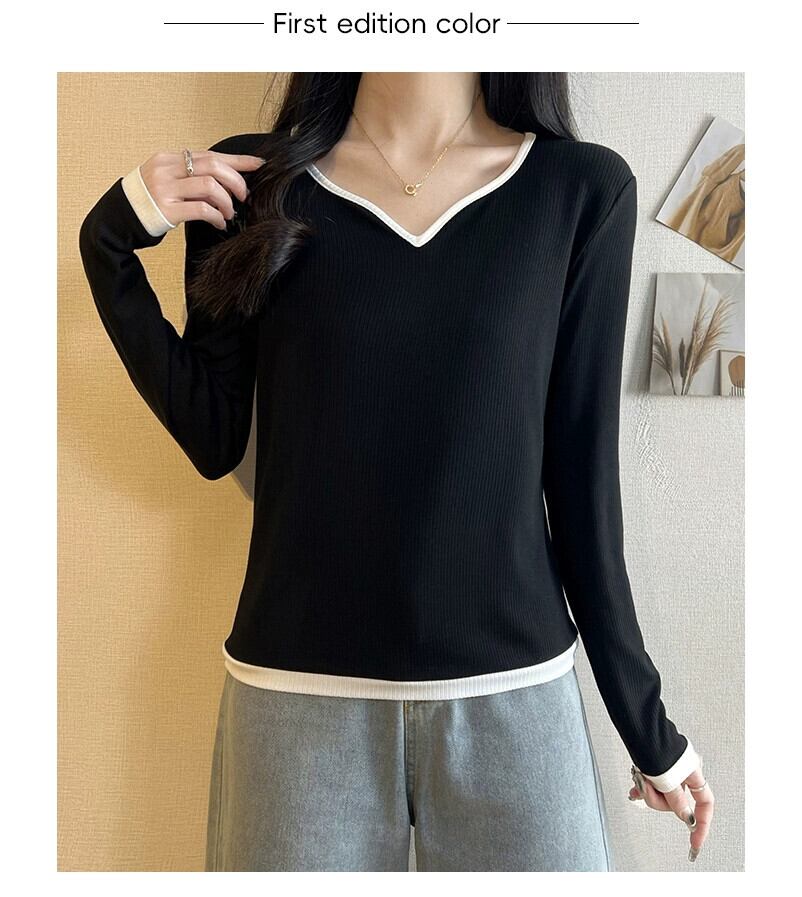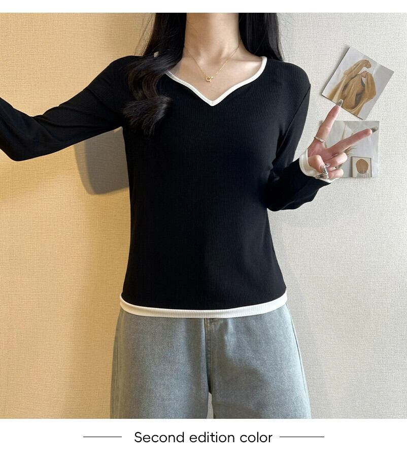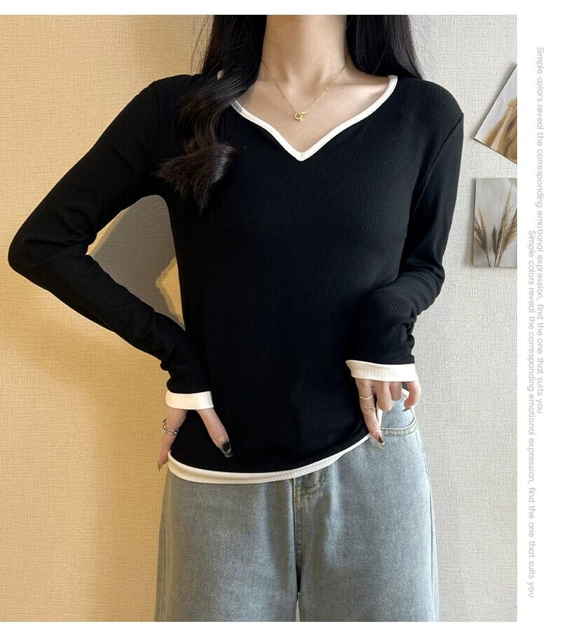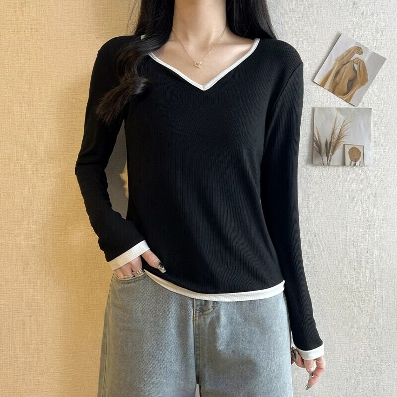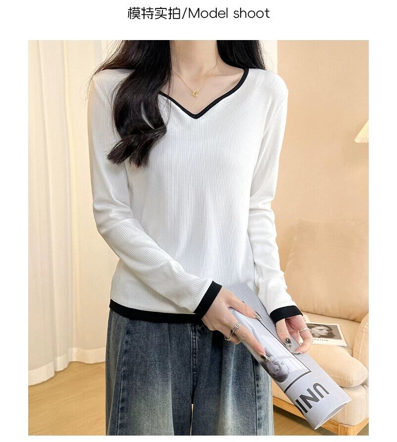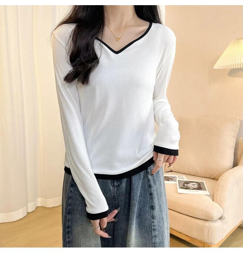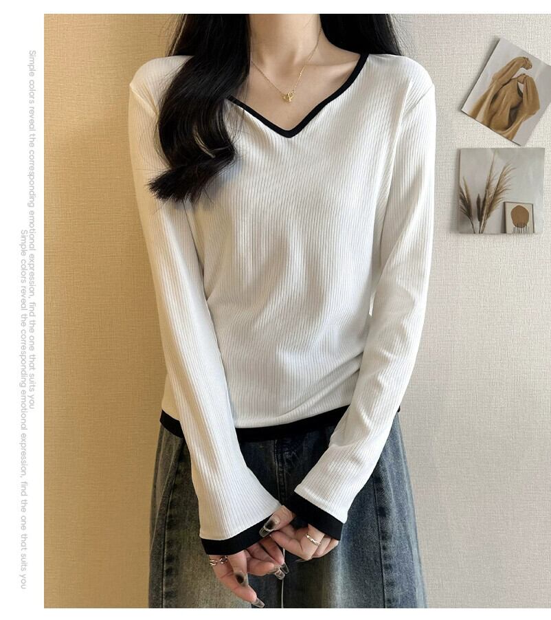 春と秋の白いリブ右肩長袖ボトムTシャツレディース、ファッショナブルでスタイリッシュなデザイン、スリムフィットインナーVネックトップ ロング ホワイト スプリング 春物 オータム 秋物 7460055587998287 | framboise21