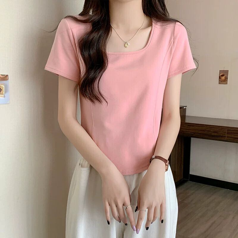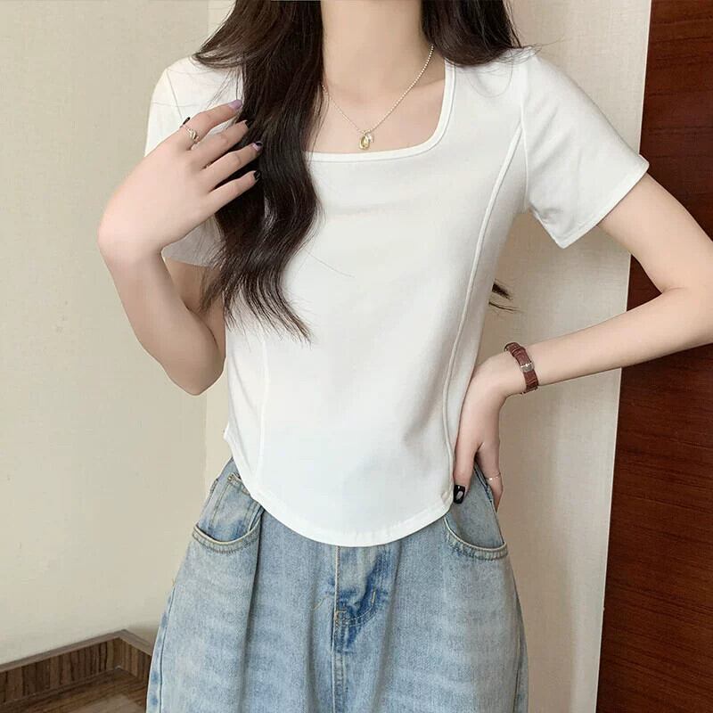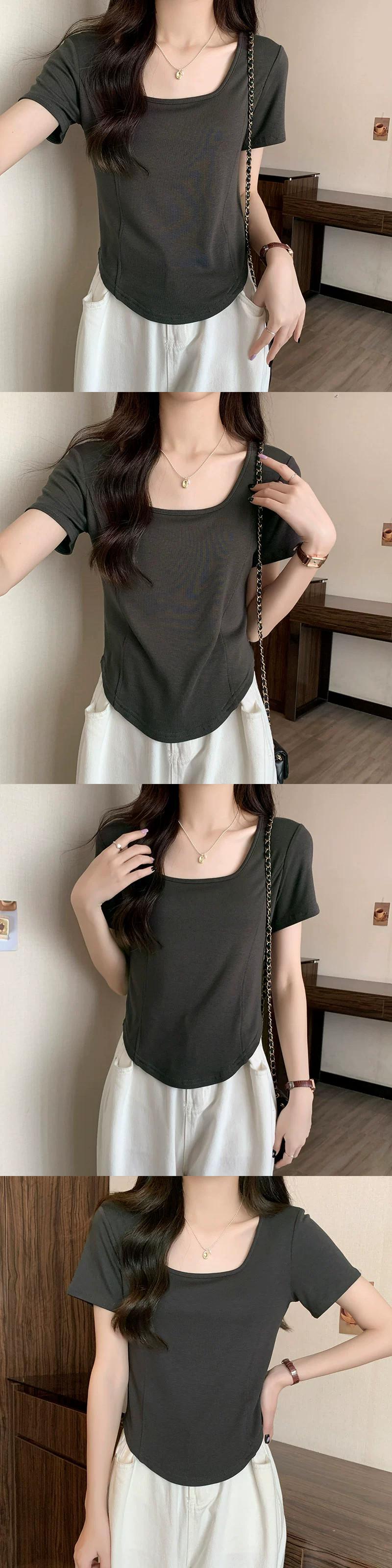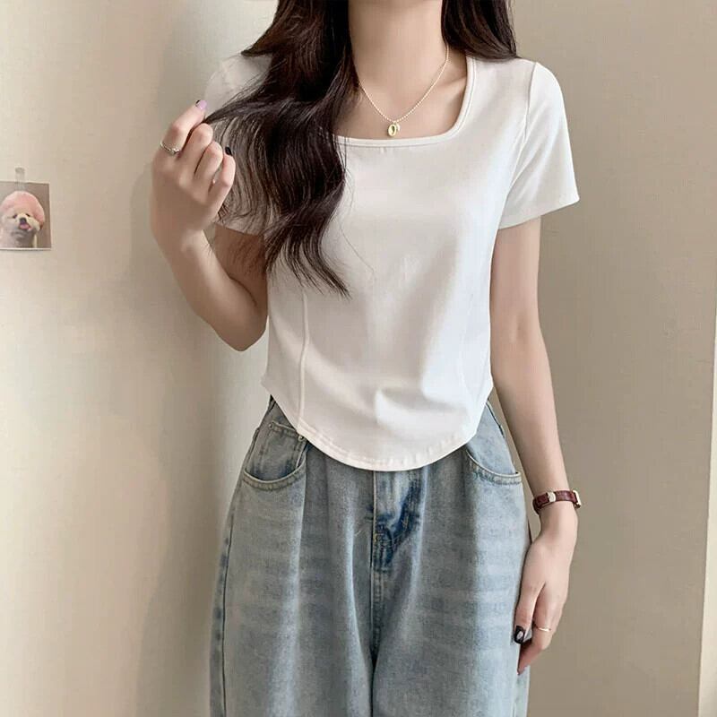 イレギュラーショルダー半袖 Tシャツ女性の夏のハイエンドファッション気質カーブ裾スクエアネックショートトップブラック サマー 夏物 スクウェア 7460064625619755 | framboise21