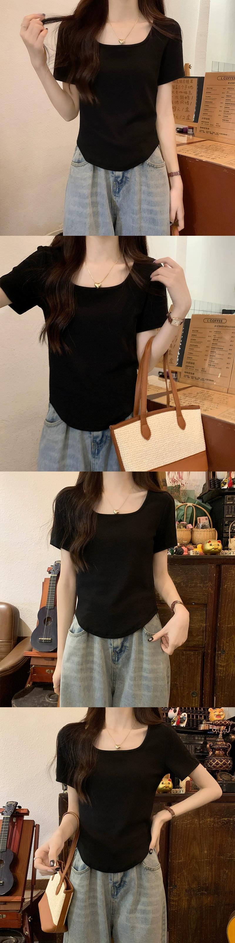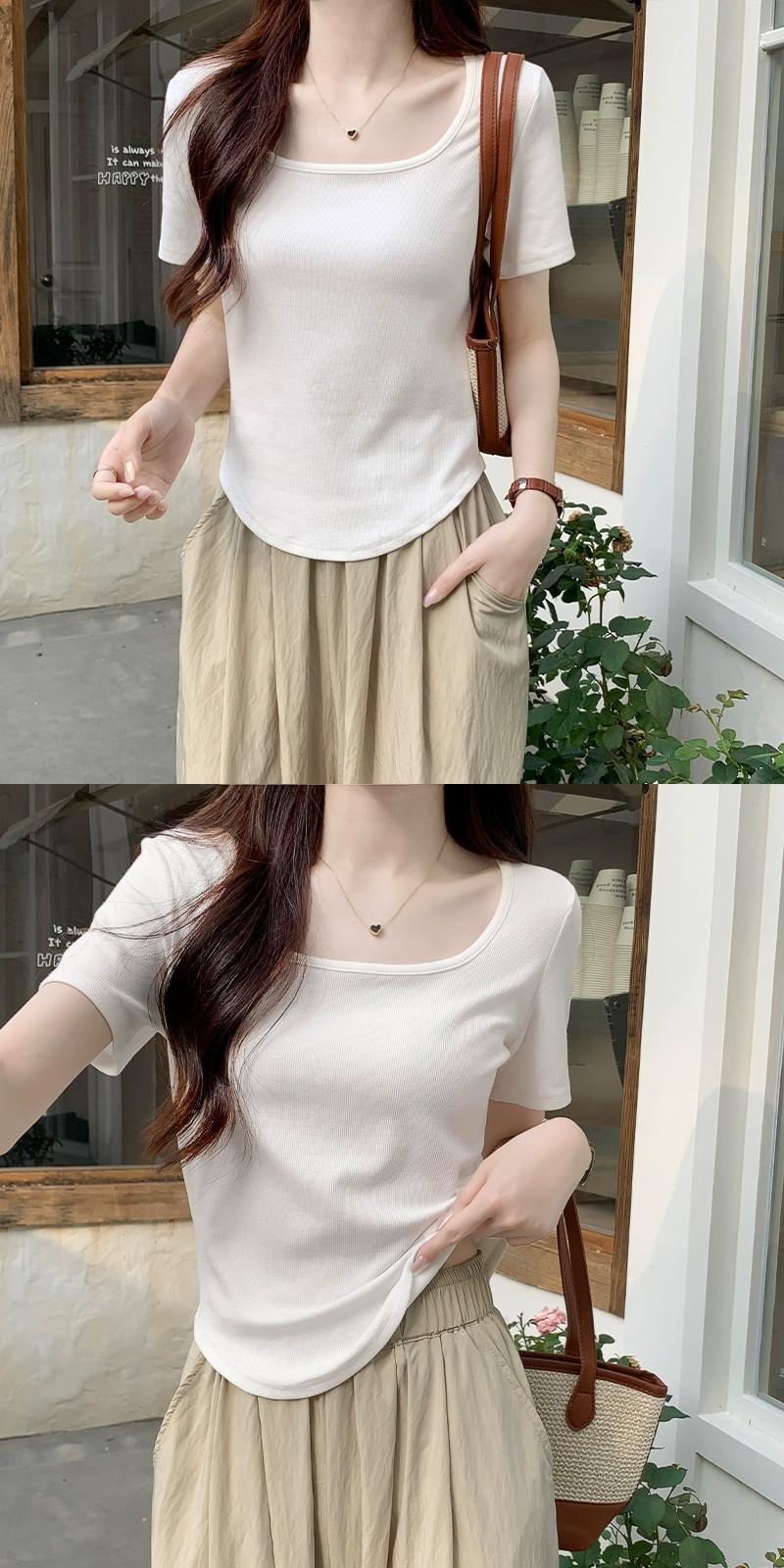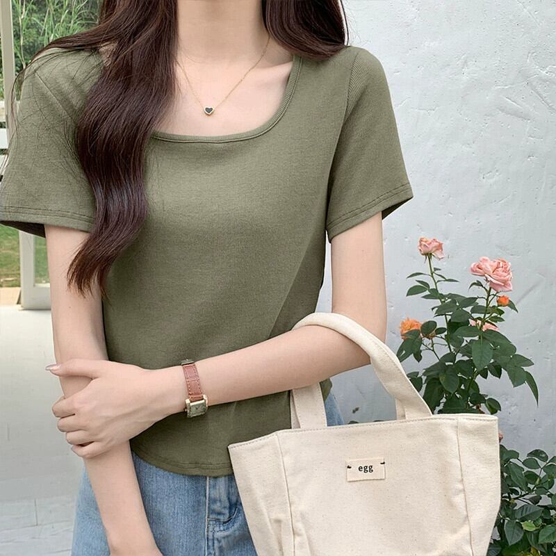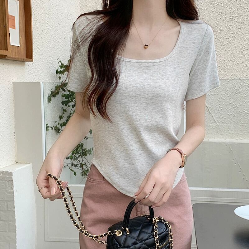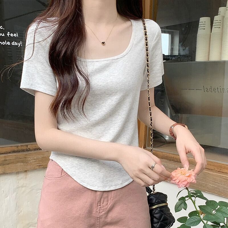 夏のイレギュラーショルダー半袖Tシャツレディース。スリムでファッショナブルになるために。鎖骨露出のスクエアネックショートトップス。 サマー 夏物 スクウェア 7460081873783090 | framboise21