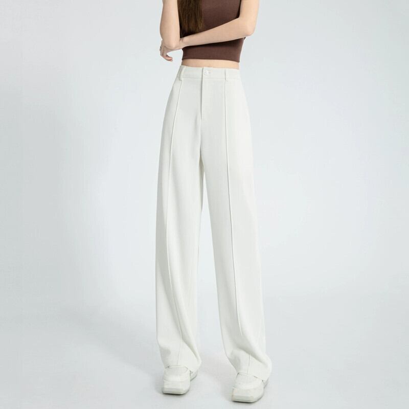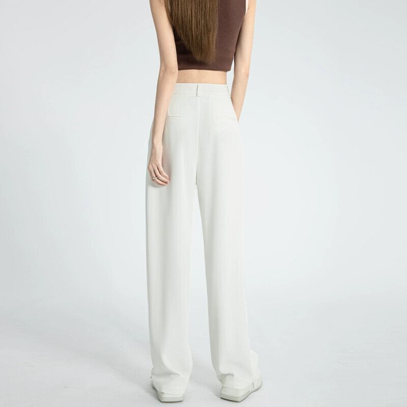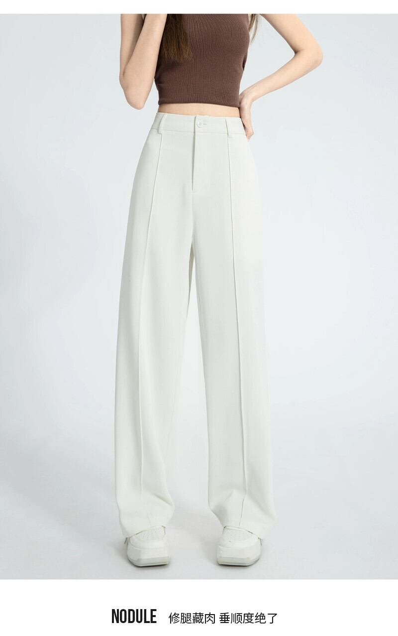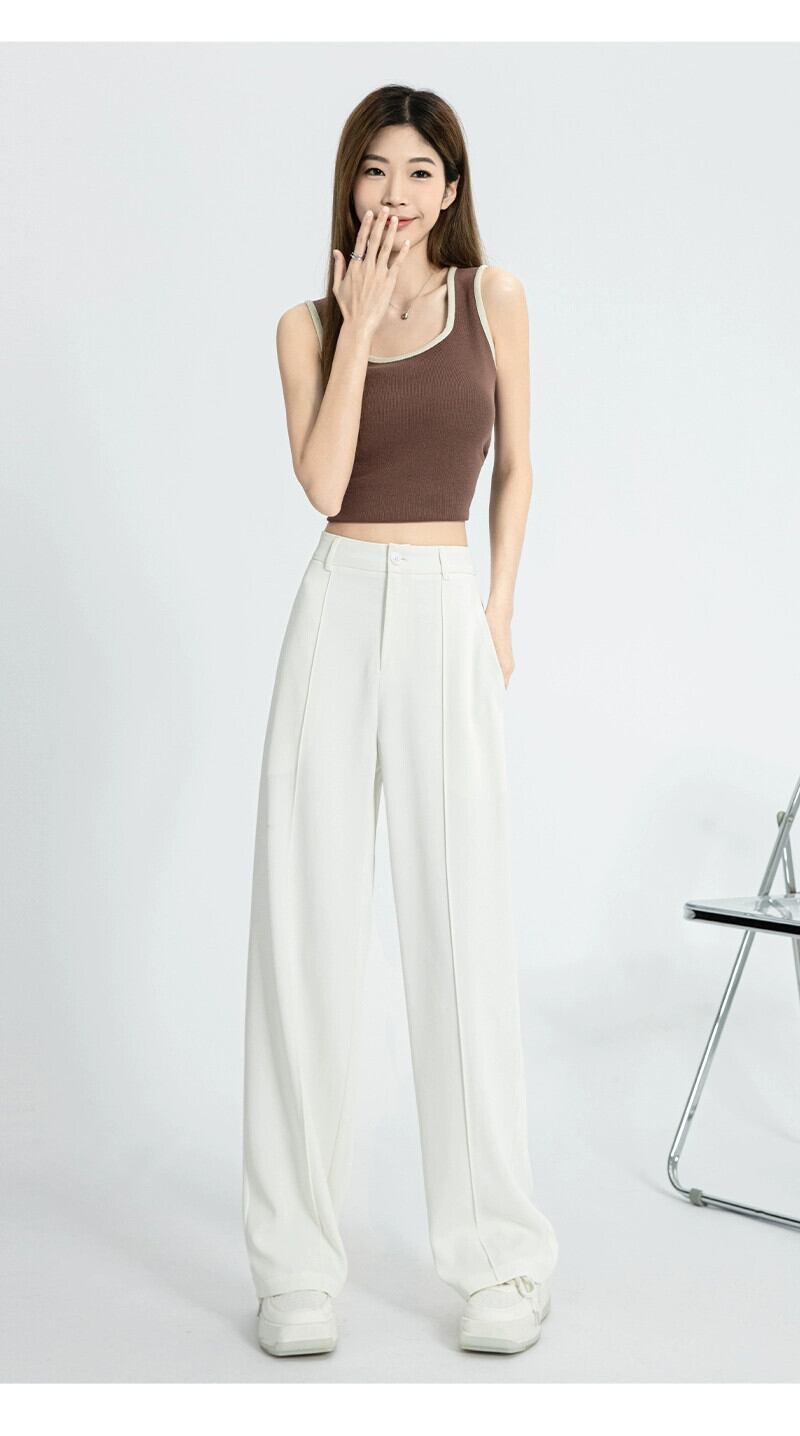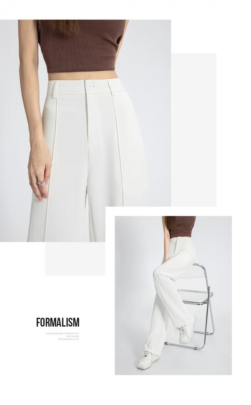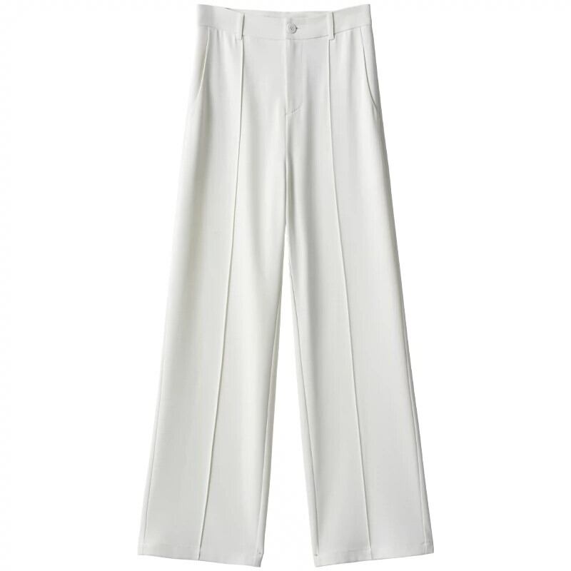 夏用の白いストレートレッグスーツパンツ、ハイエンドのドレープワイドレッグパンツ、ハイウエスト、スリム、汎用性の高いフロアレングスのカジュアルパンツ ホワイト サマー 夏物 7460075412052026 | framboise21