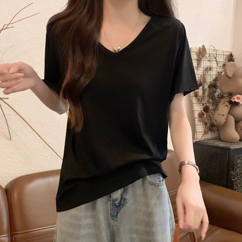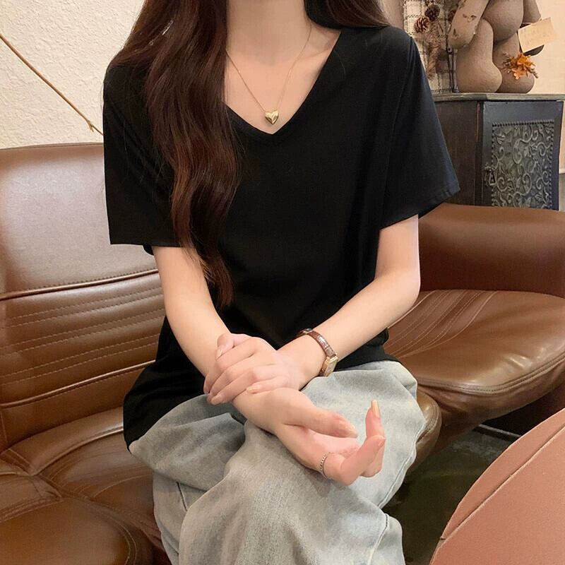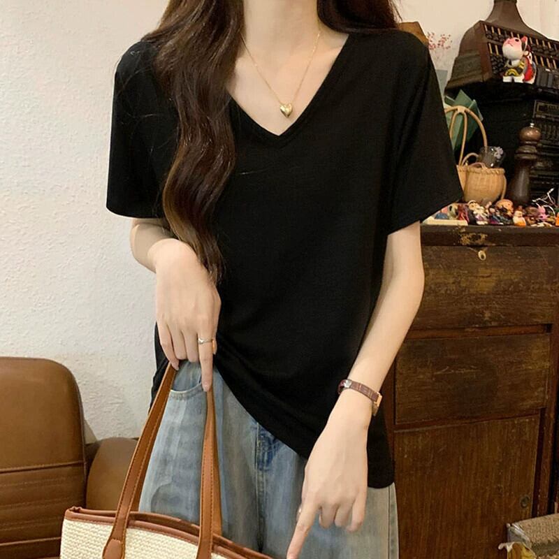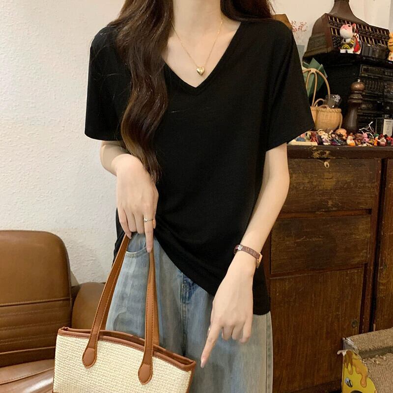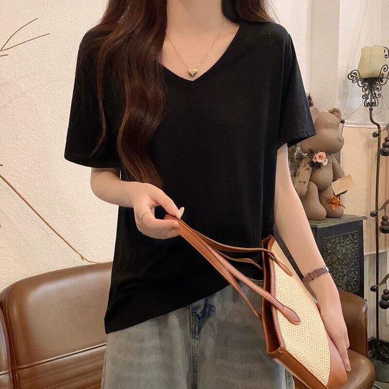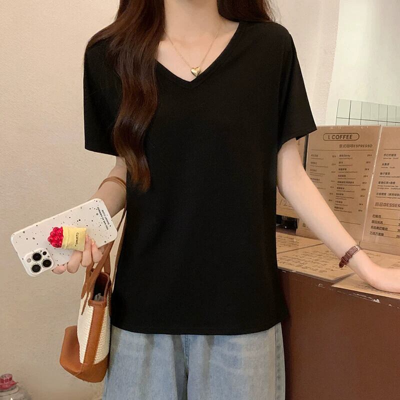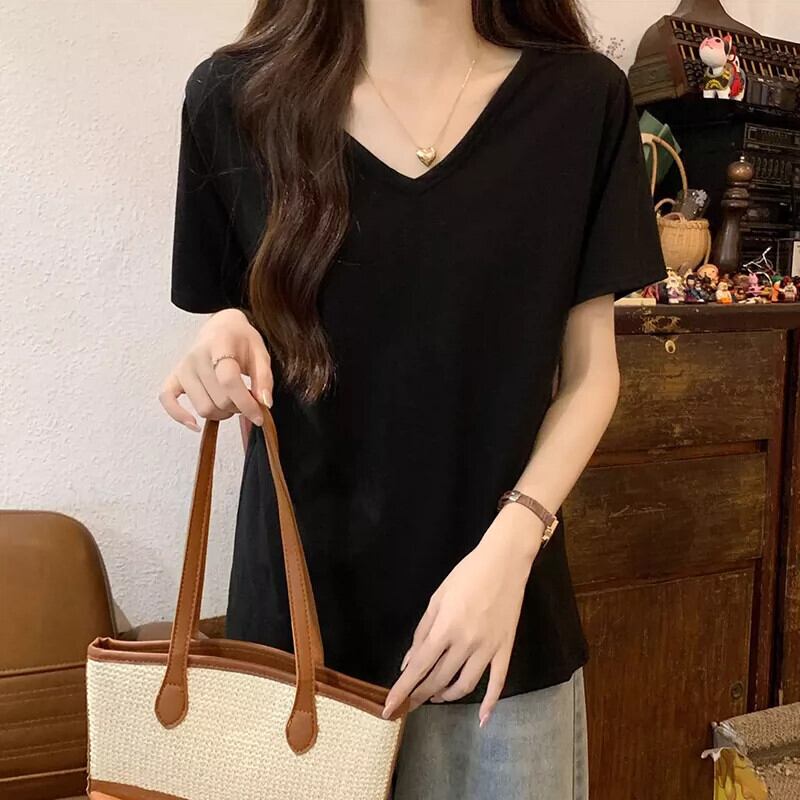 黒竹綿半袖 tシャツ女性 2024 新しい夏のルーズバージョン痩身ファッショナブルな v ネックトップ ブラック コットン サマー 夏物 Vネック 7460070248409779 | framboise21