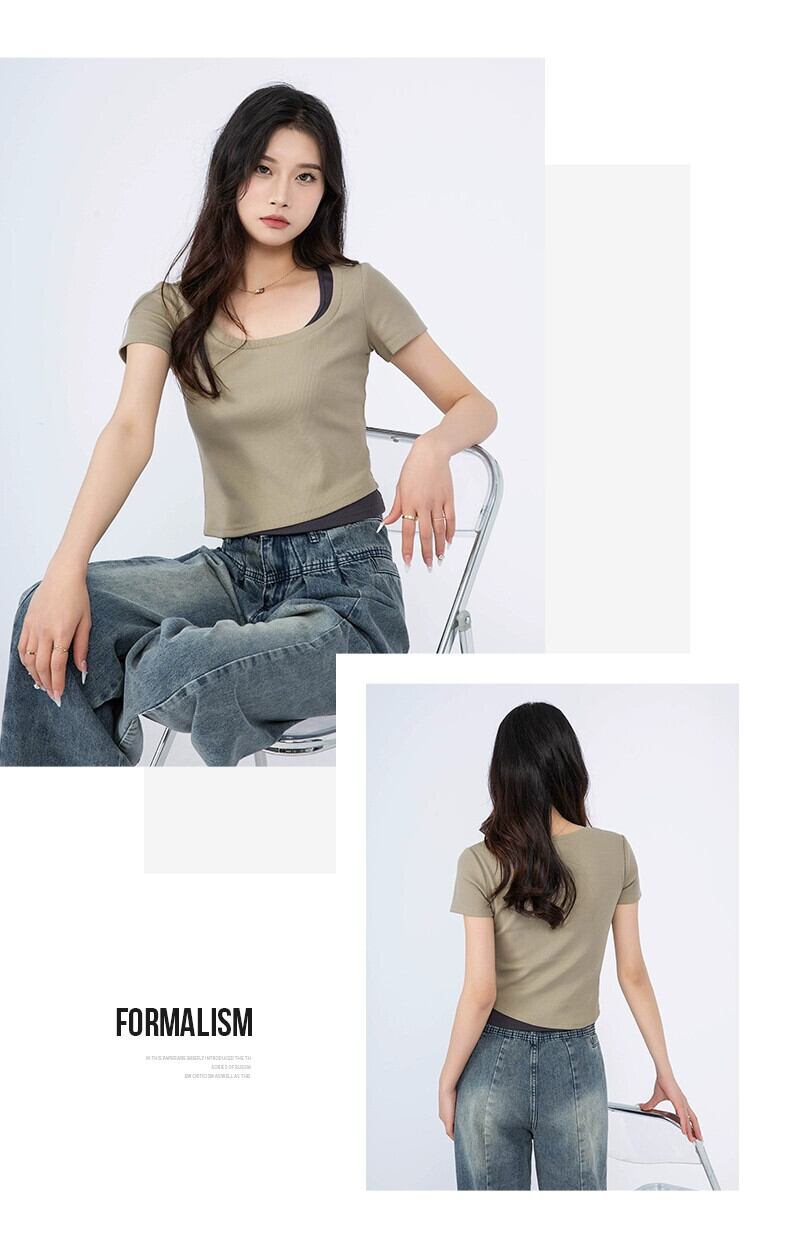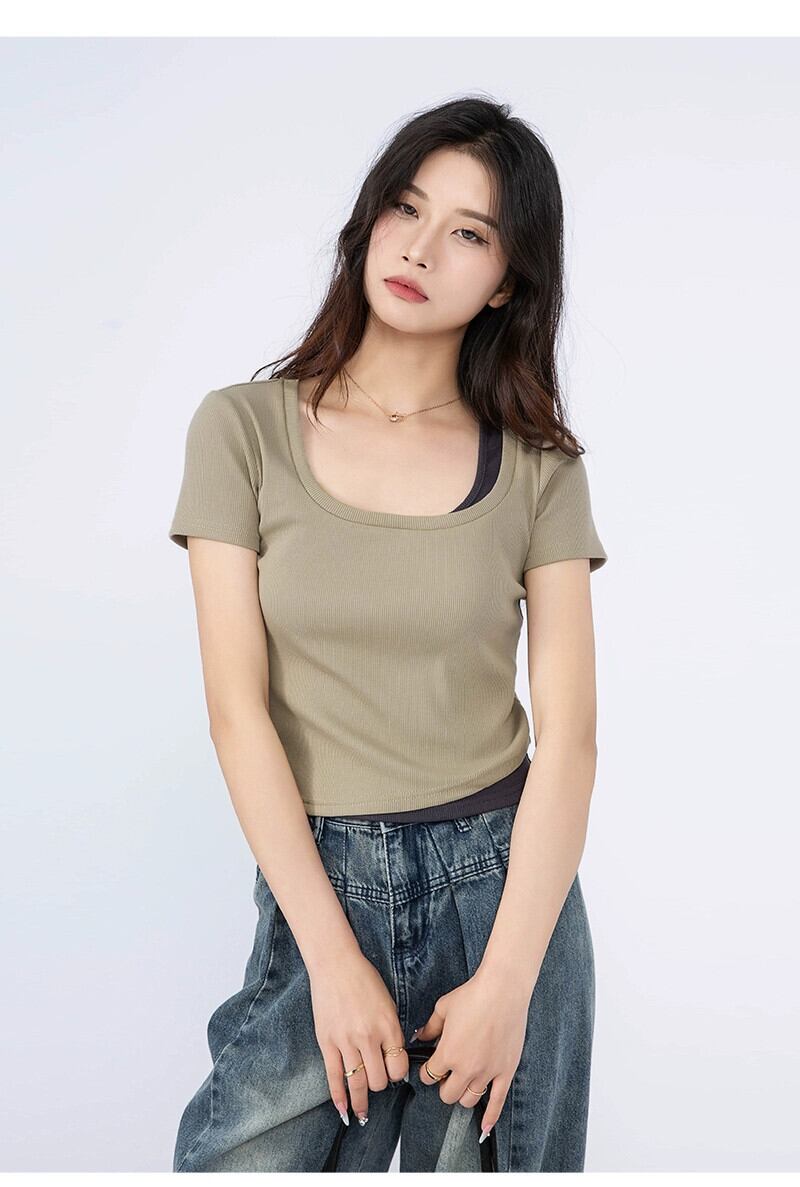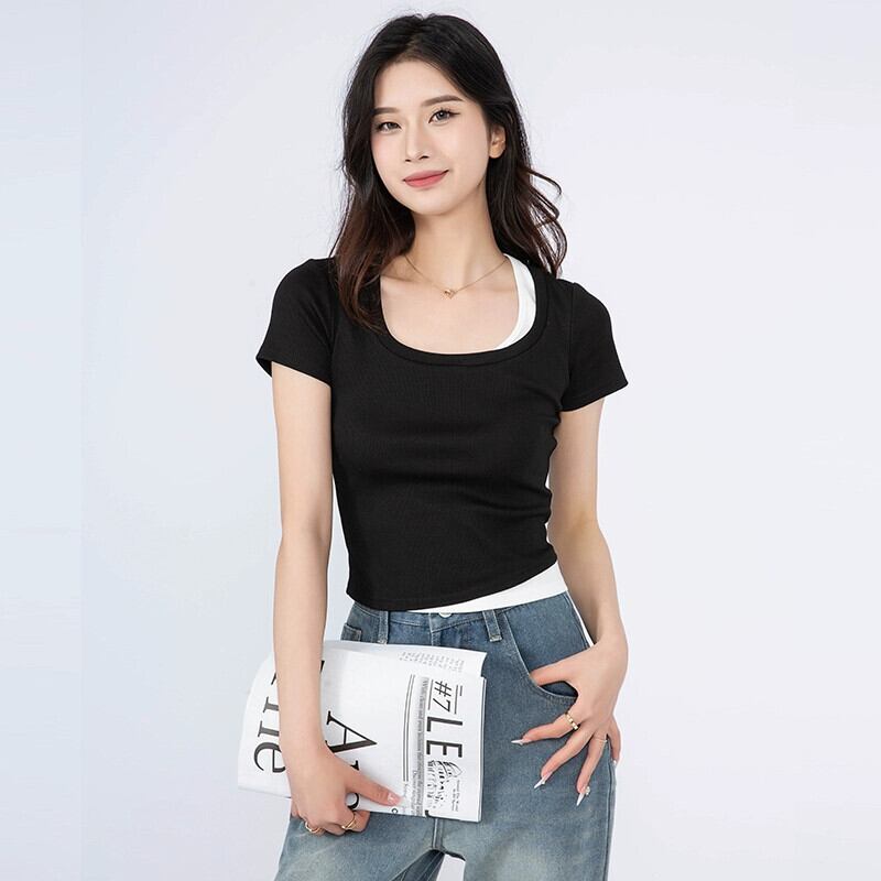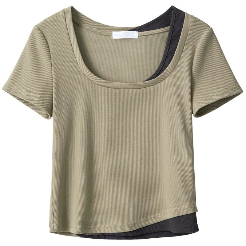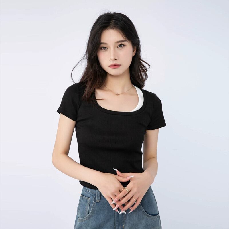 夏のフェイクツーピース右肩半袖Tシャツレディース、ファッショナブルでスタイリッシュ、スリムで多用途、ショートスクエアネックトップ、トレンディ。 サマー 夏物 スクウェア 7460064100479657 | framboise21