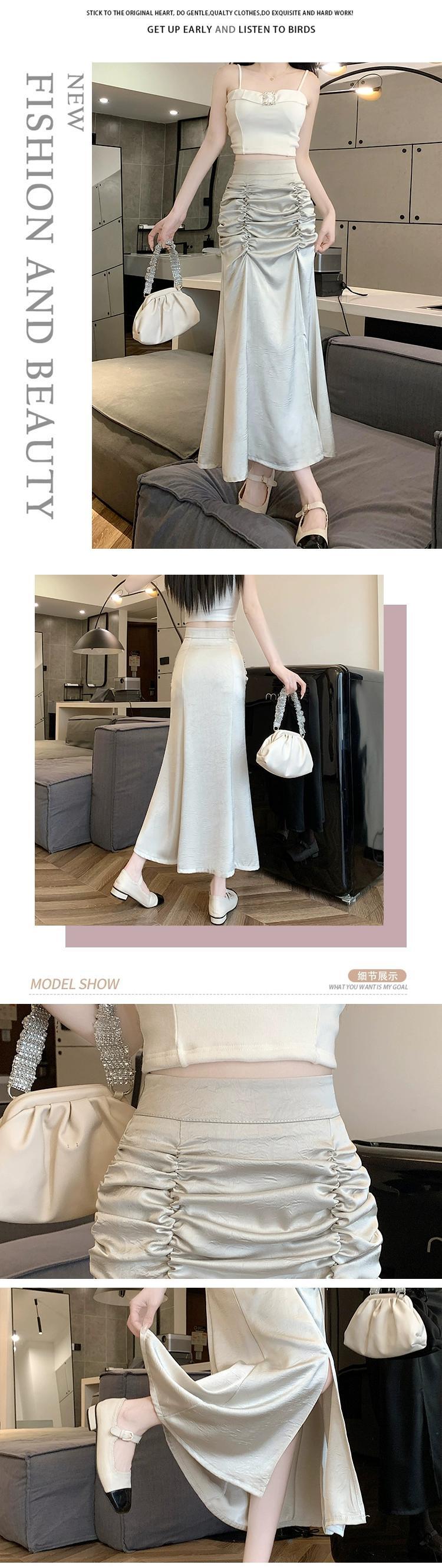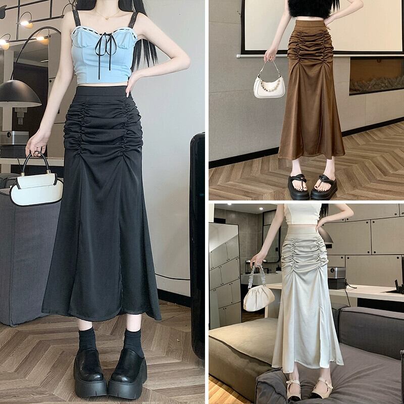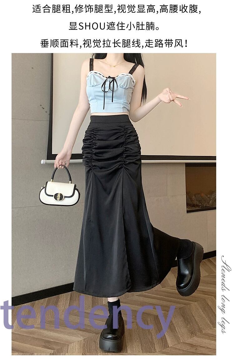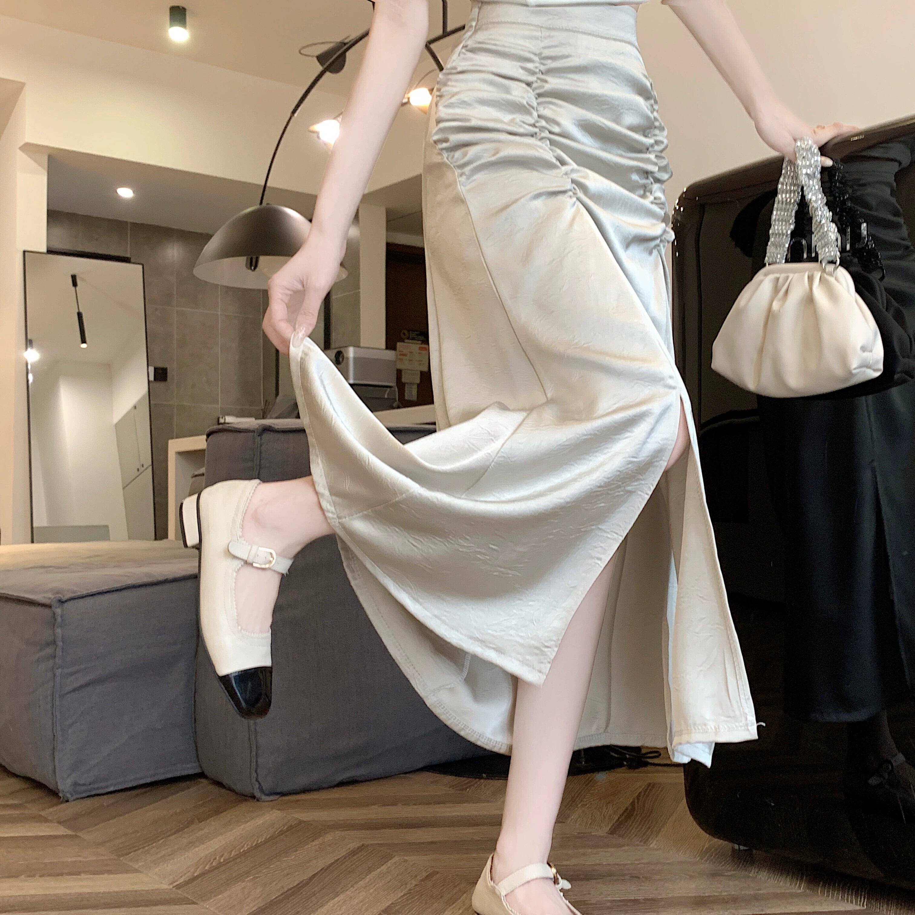 中国風のシルクフィッシュテールスカート女性の夏のハイウエスト痩身デザイン A ラインプリーツスリットヒップカバーロングスカート ハイウェスト サマー 夏物 Aライン 7460087872885917 | framboise21