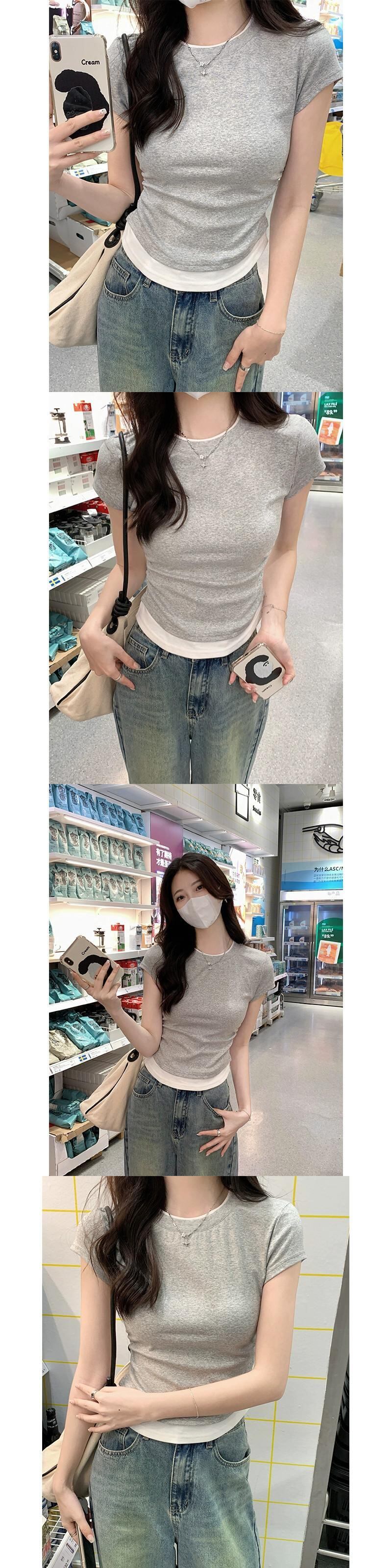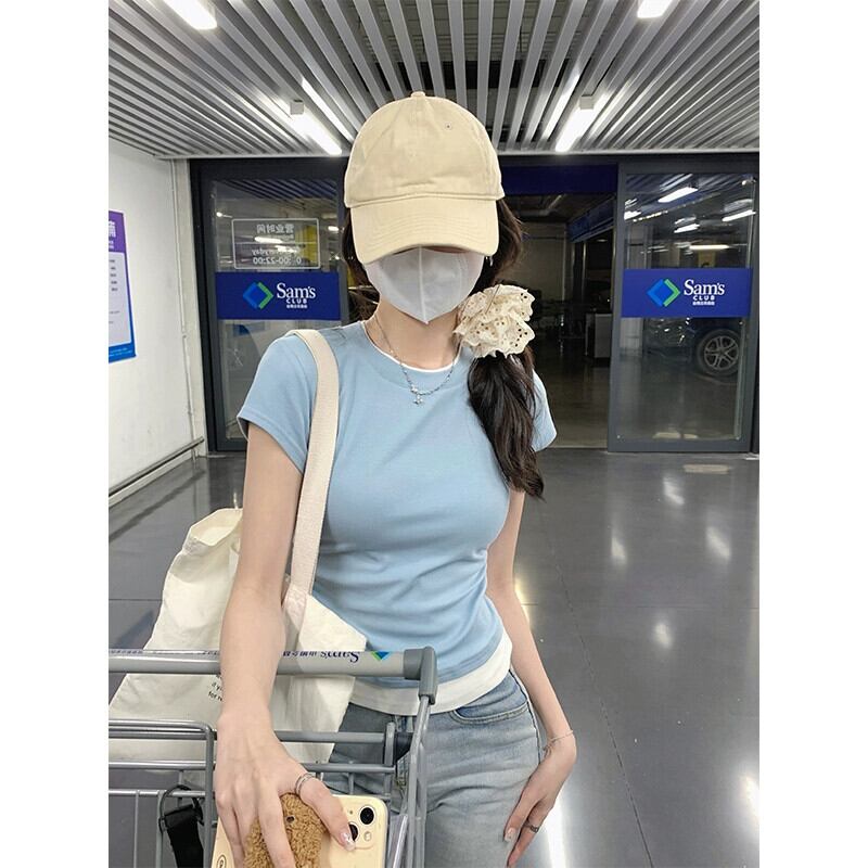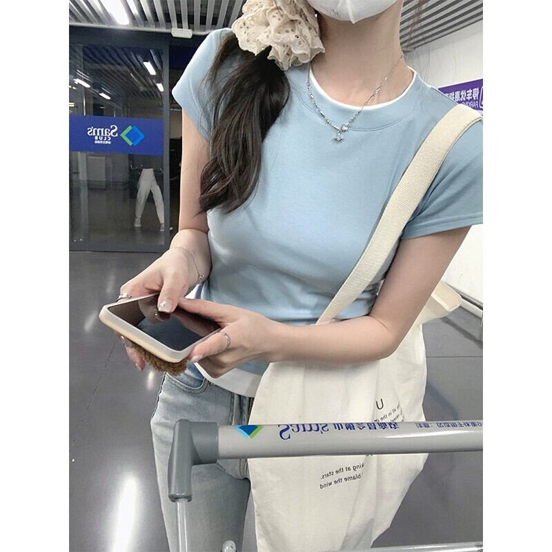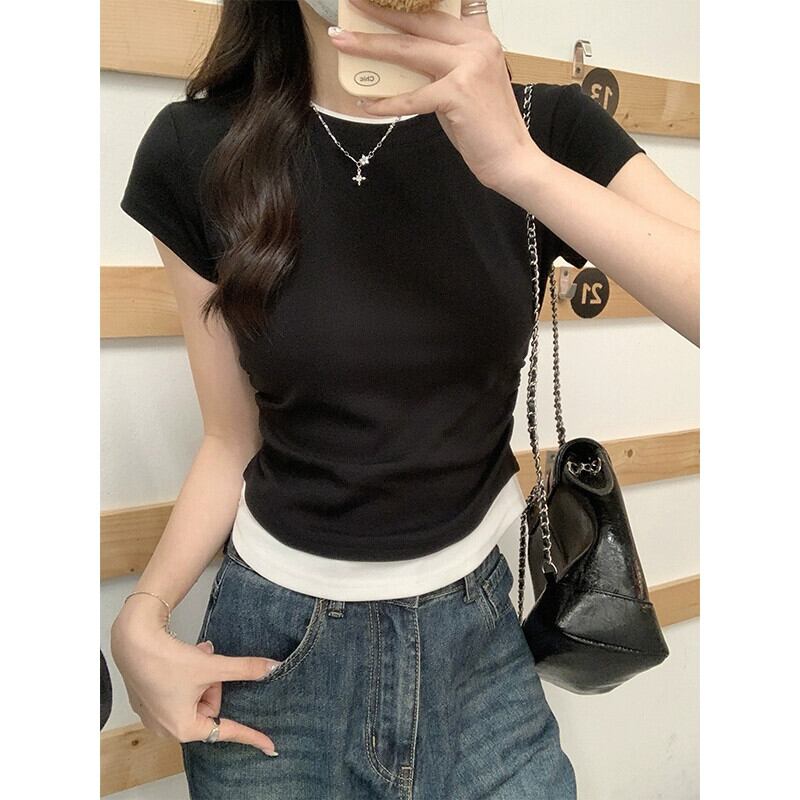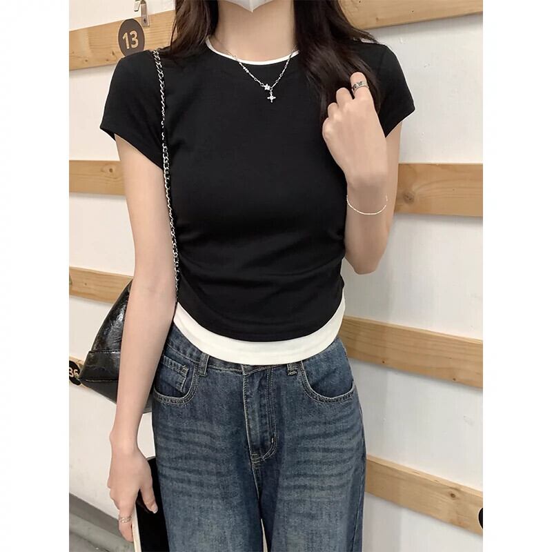右肩純綿半袖 T シャツの女性の夏、ファッショナブルなデザイン、Eign スタイル、不規則なフェイク ツーピース ショート トップ コットン サマー 夏物 Tシャツ ピュア 7460083870595752 | framboise21