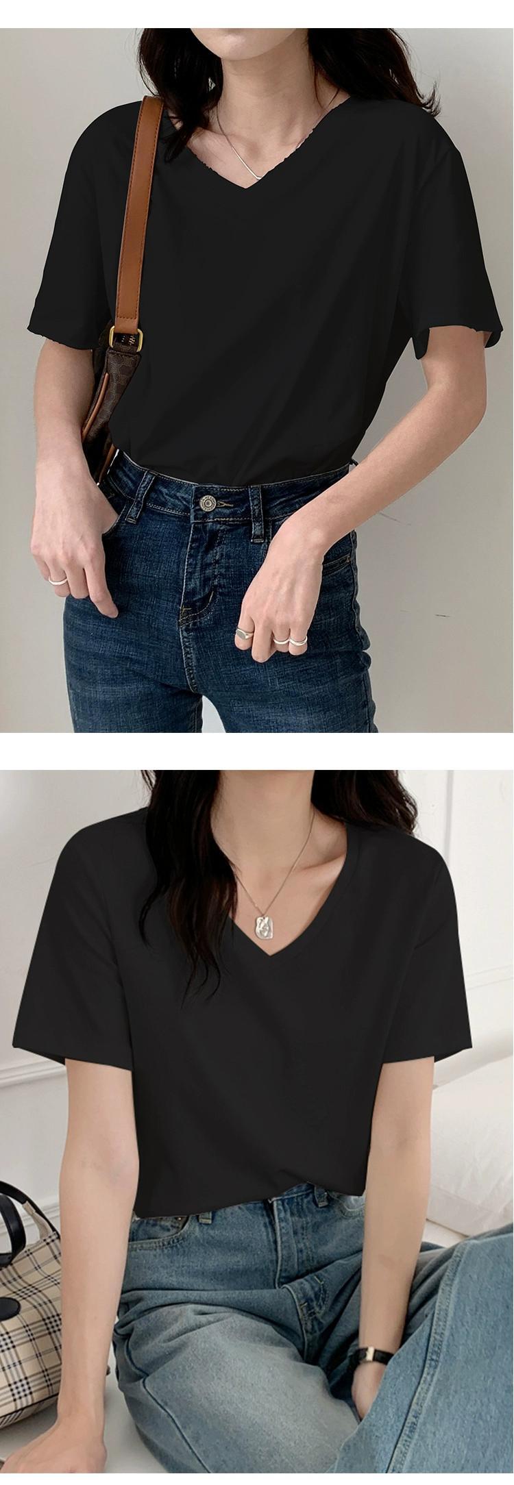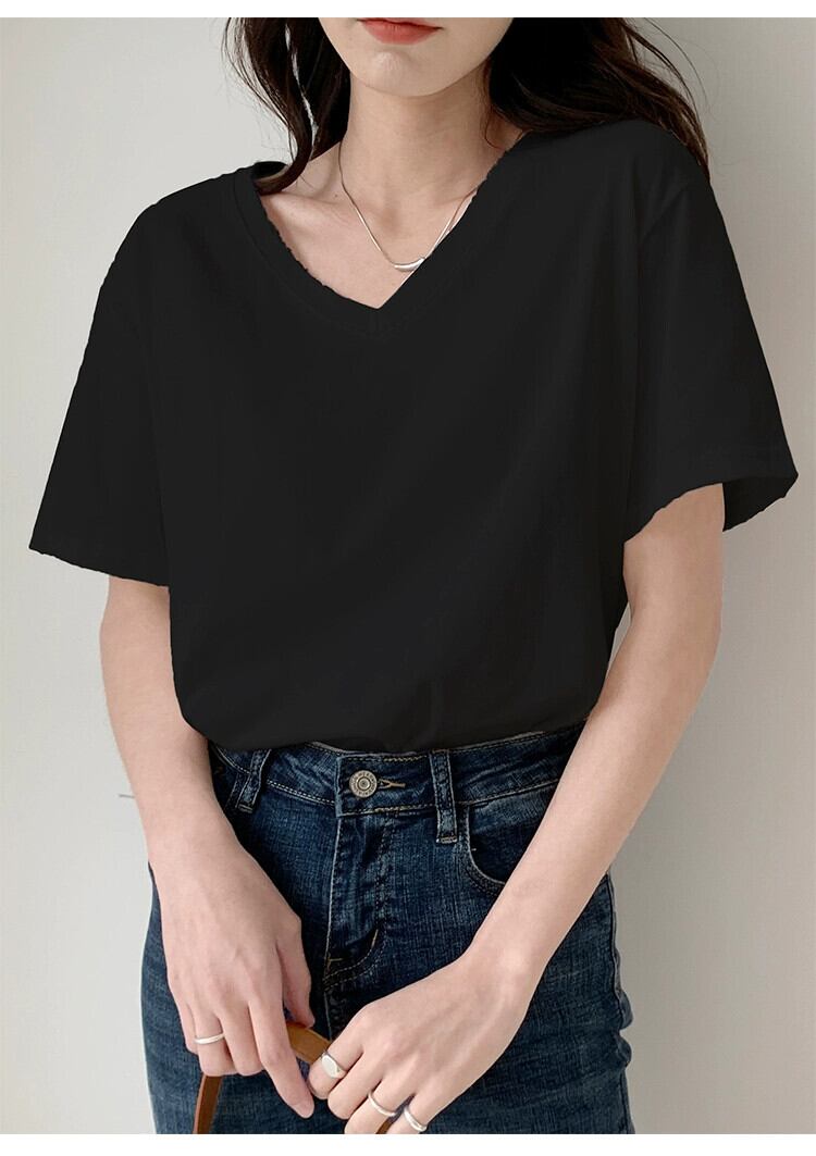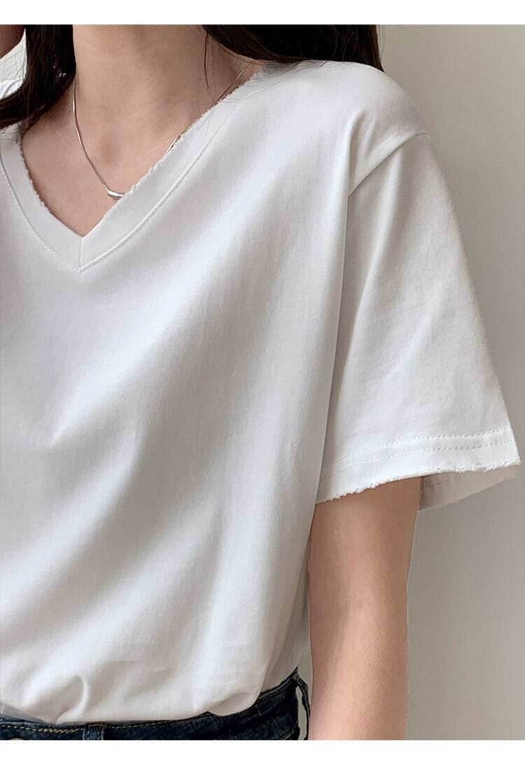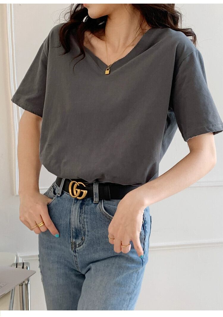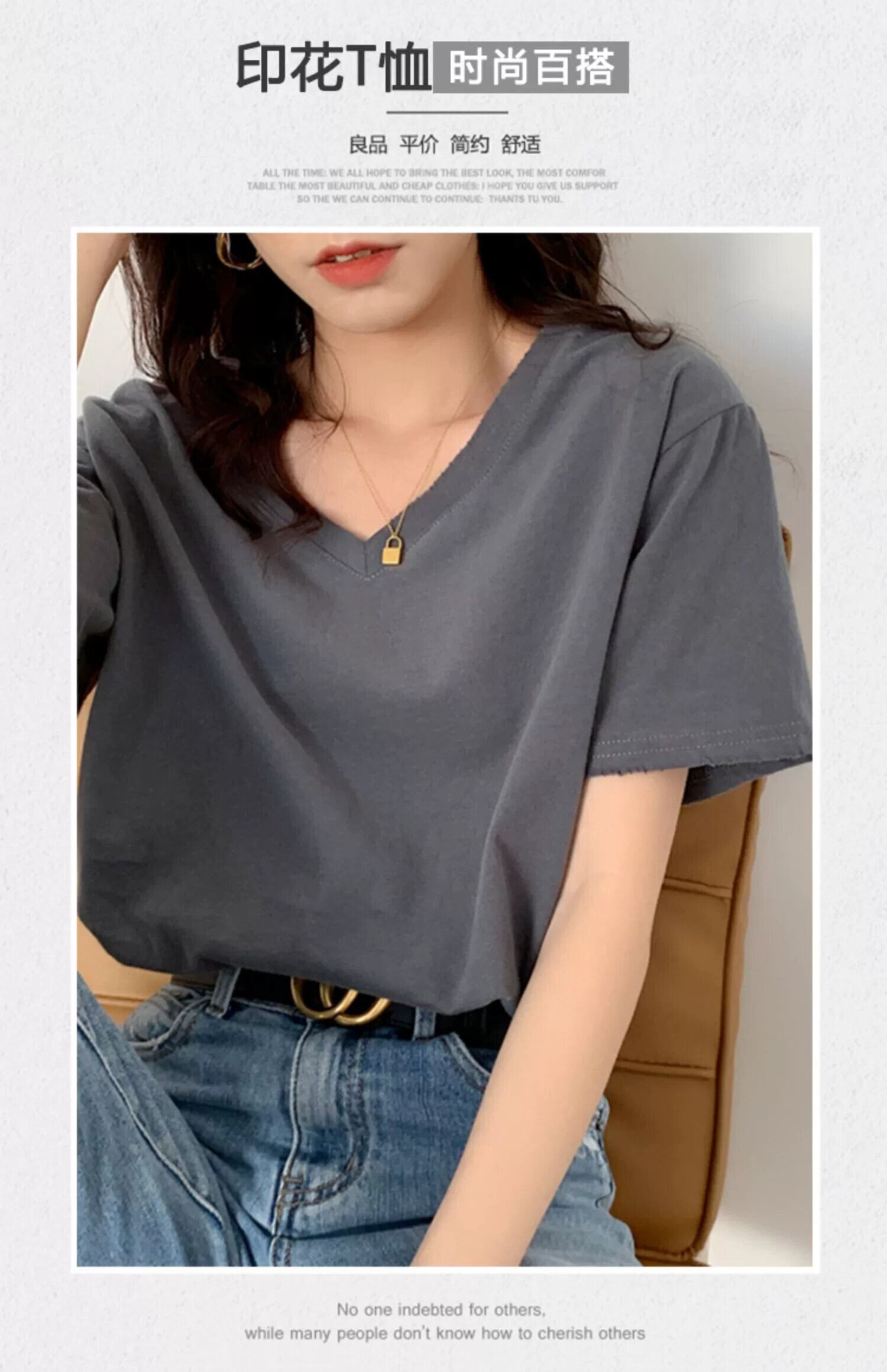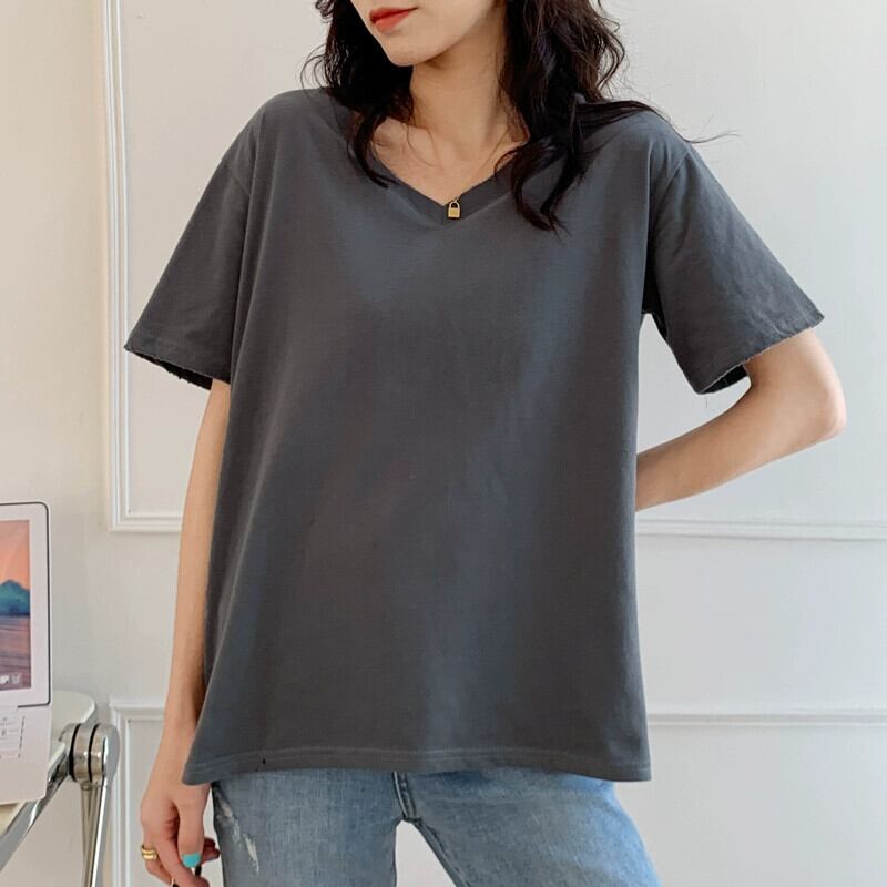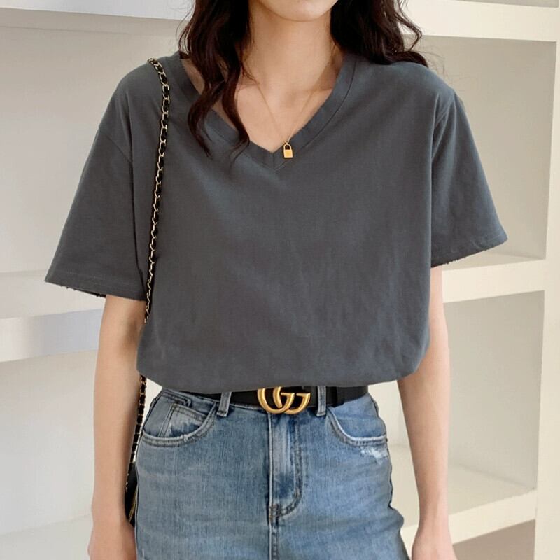 グレーコットン半袖 tシャツ女性 2024 新しい夏のハイエンドルーズスリムファッショナブルなショルダー v ネックトップトレンディ サマー 夏物 Vネック 746002649999361 | framboise21