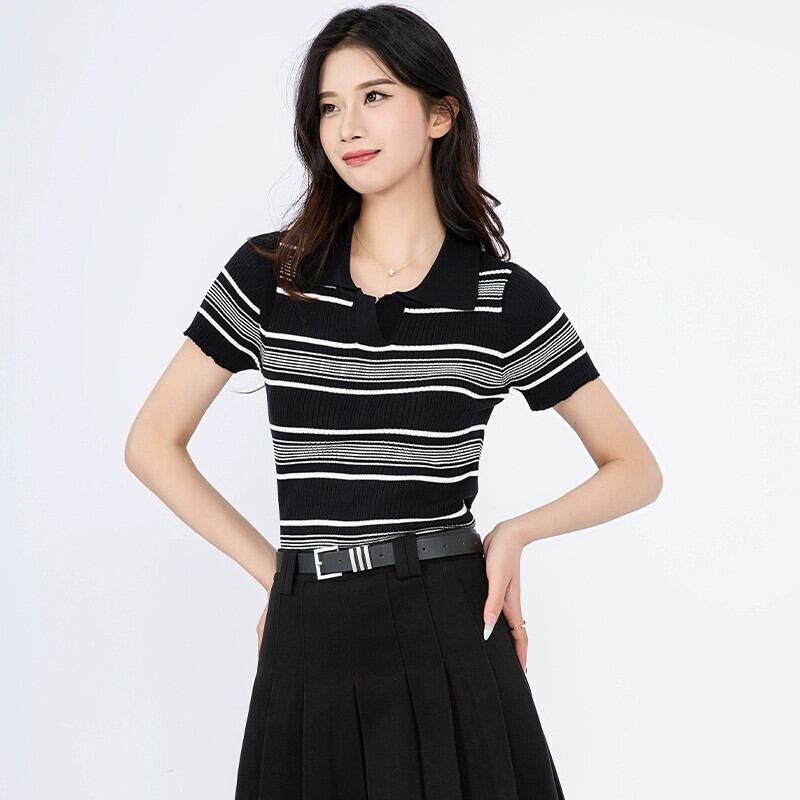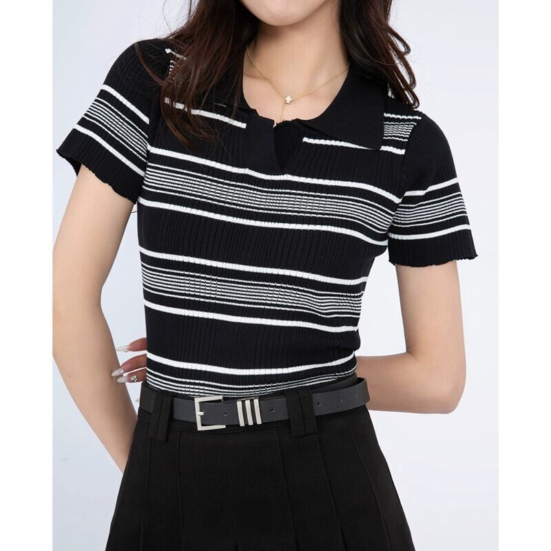 夏の黒と白のストライプの半袖 T シャツの女性、ハイエンド、スリムで多用途、右肩ポロカラー ニット トップ ホワイト ブラック サマー 夏物 Tシャツ 7460090958724112 | framboise21