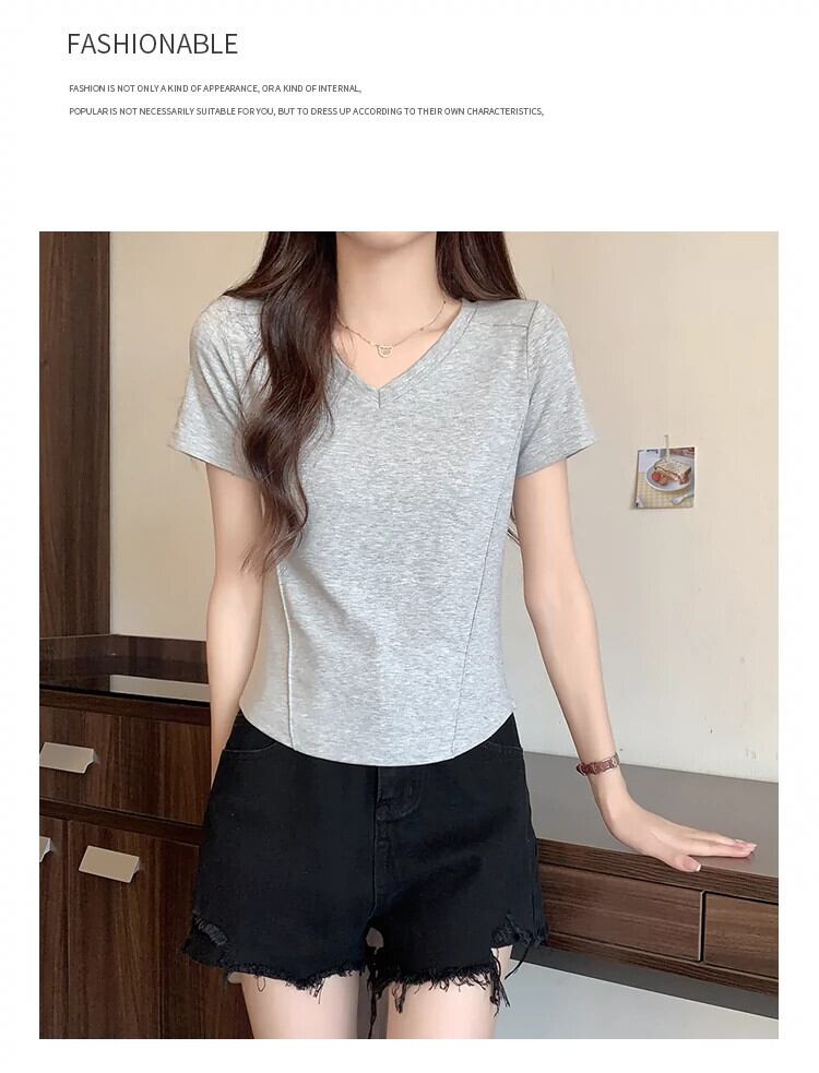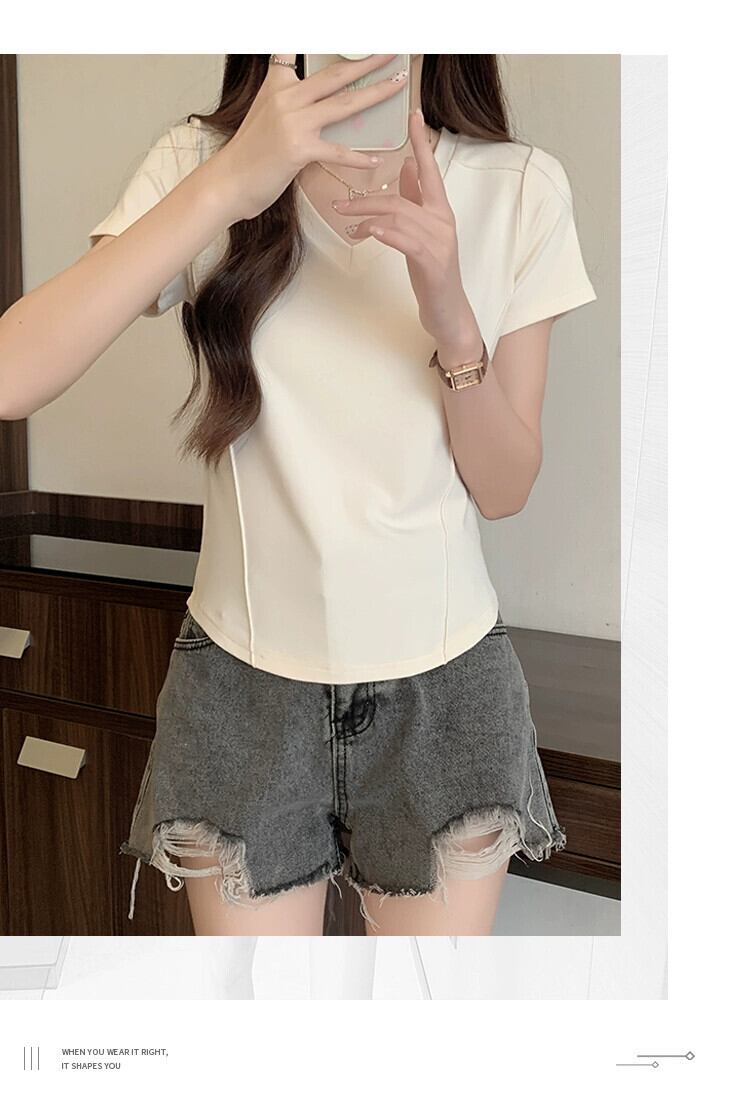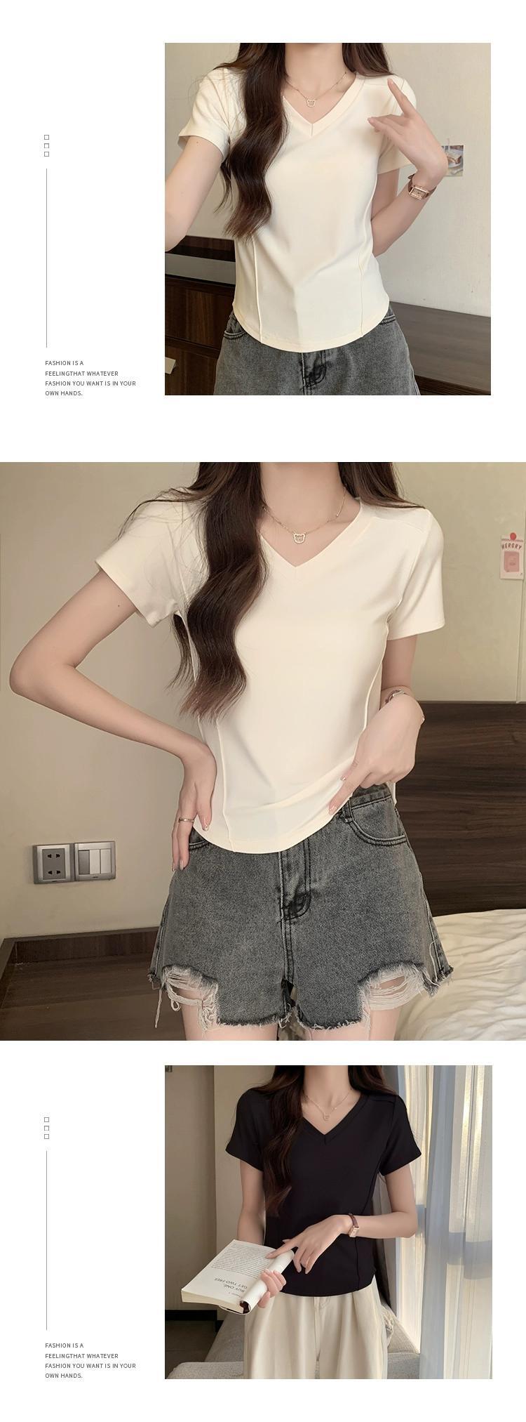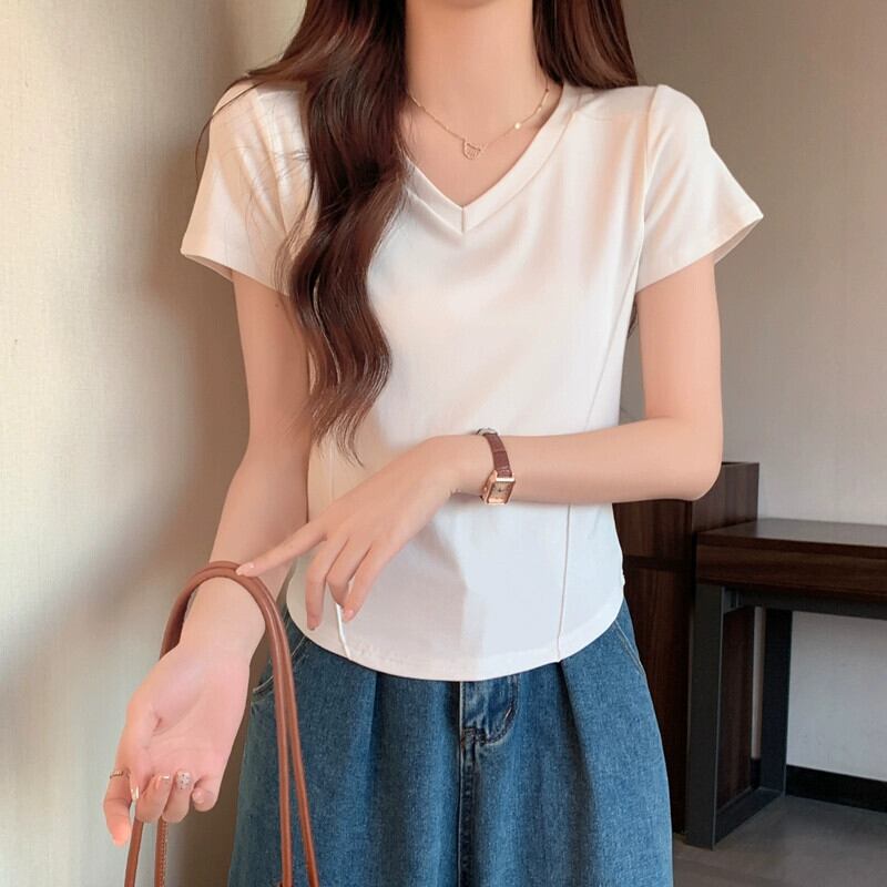 スリムなデザイン、ファッショナブルなカーブした裾、短い V ネックのトップスを備えた夏の不規則な肩の半袖 T シャツの女性 ショート サマー 夏物 Vネック Tシャツ 7460064176322242 | framboise21