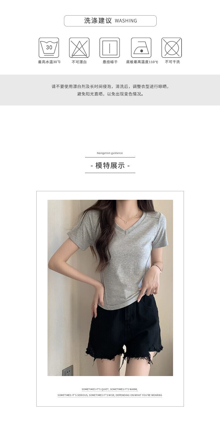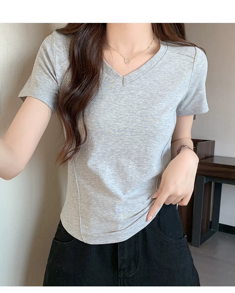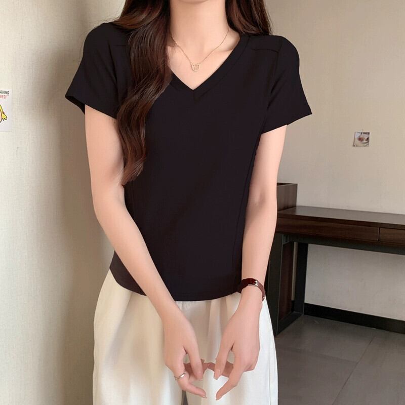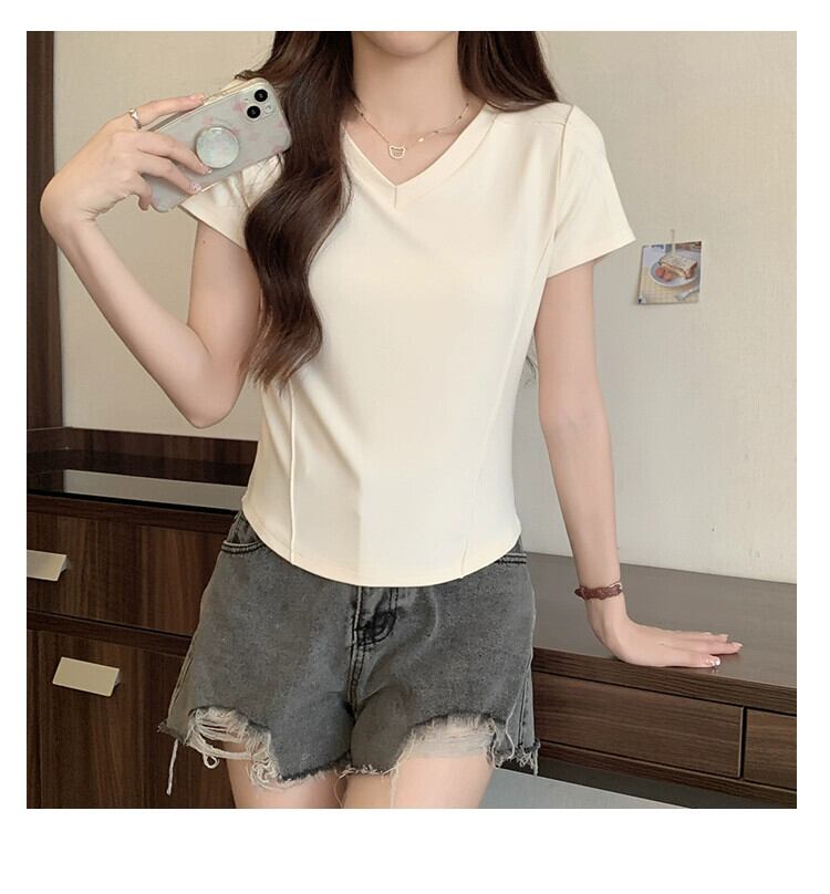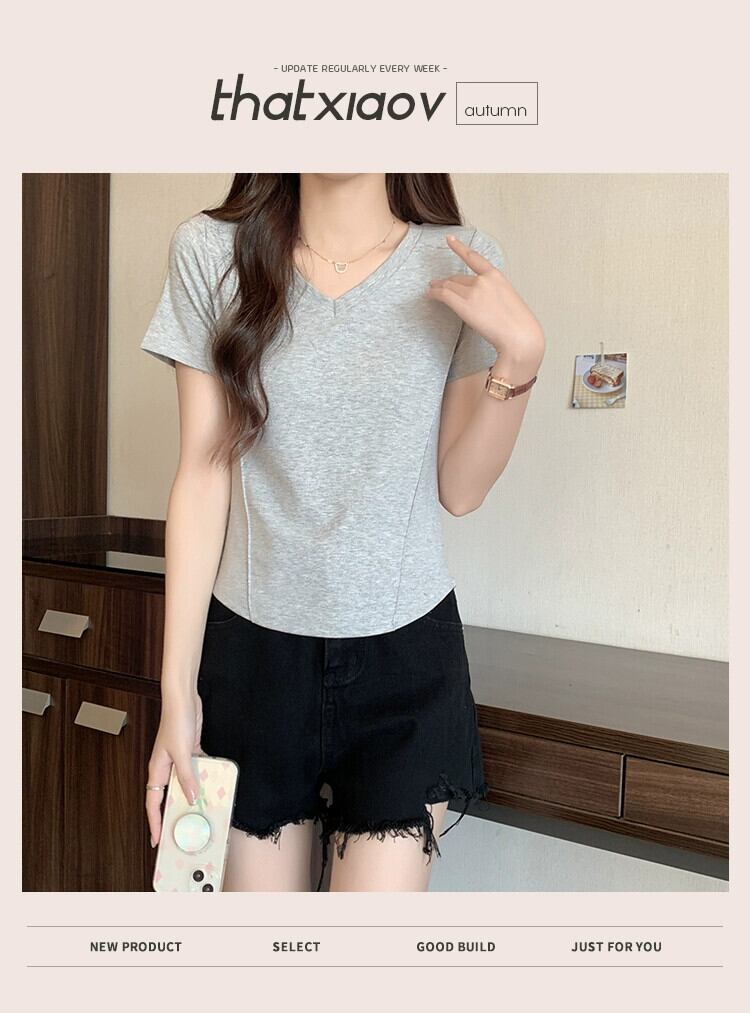 スリムなデザイン、ファッショナブルなカーブした裾、短い V ネックのトップスを備えた夏の不規則な肩の半袖 T シャツの女性 ショート サマー 夏物 Vネック Tシャツ 7460064176322242 | framboise21