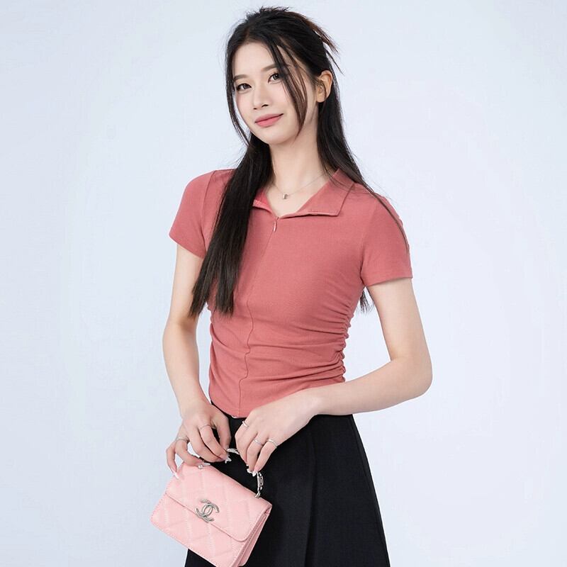 夏の黒い右肩半袖Tシャツの女性、ファッショナブルでスタイリッシュなデザイン、スリムフィット、プリーツジッパーショートトップ ブラック サマー 夏物 7460073561078645 | framboise21