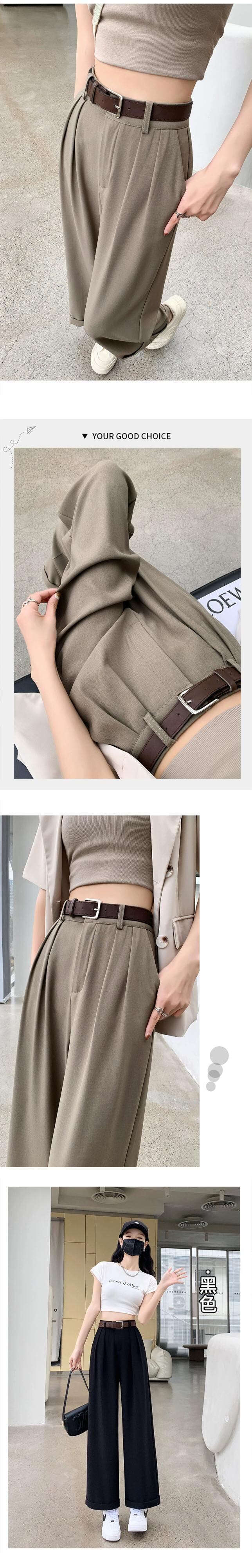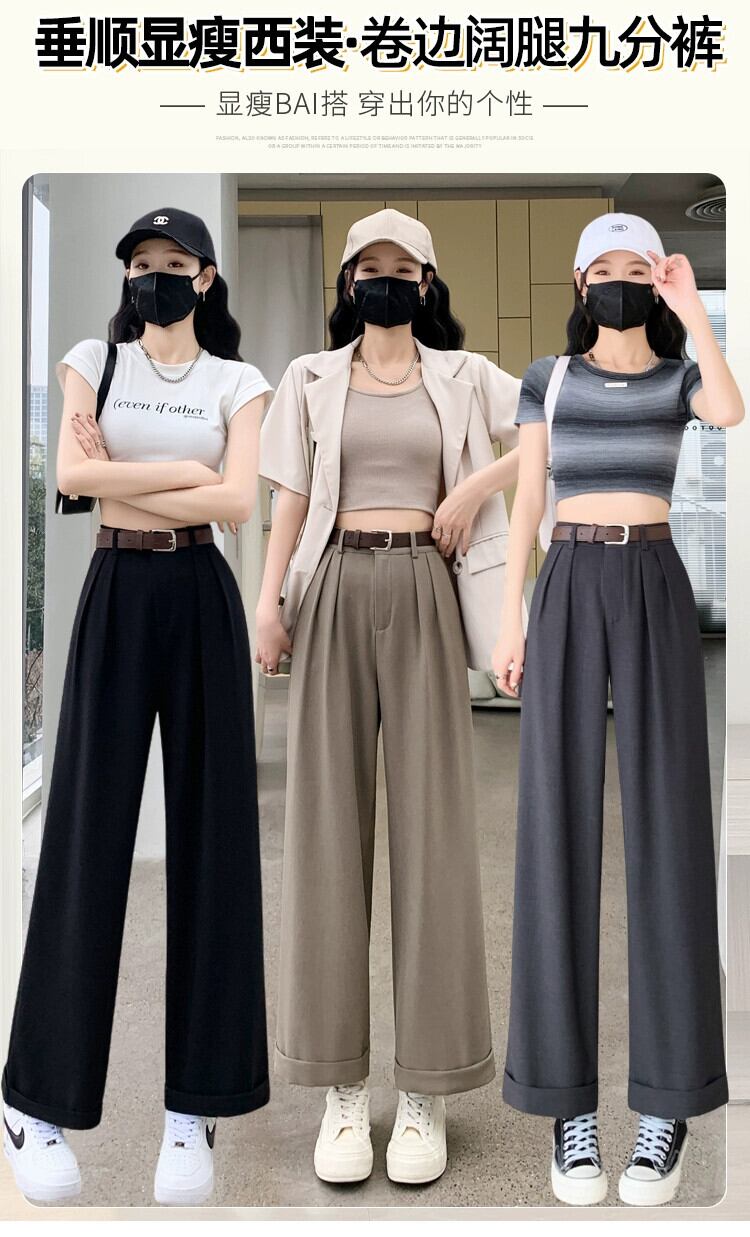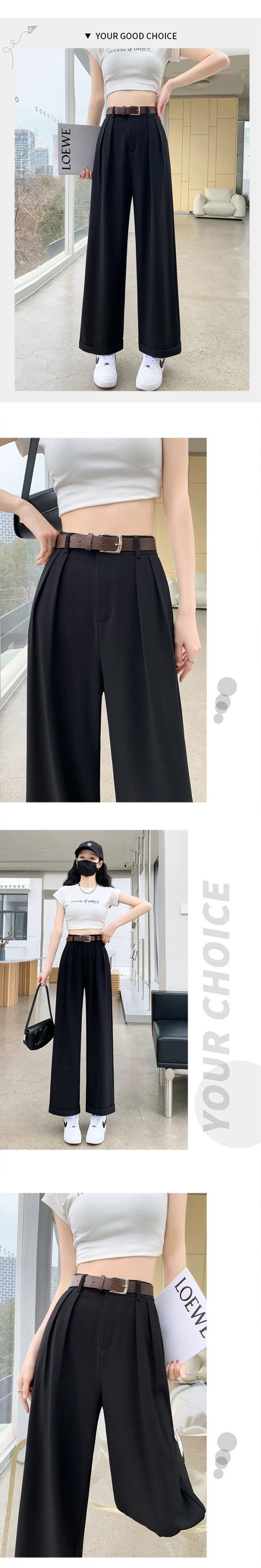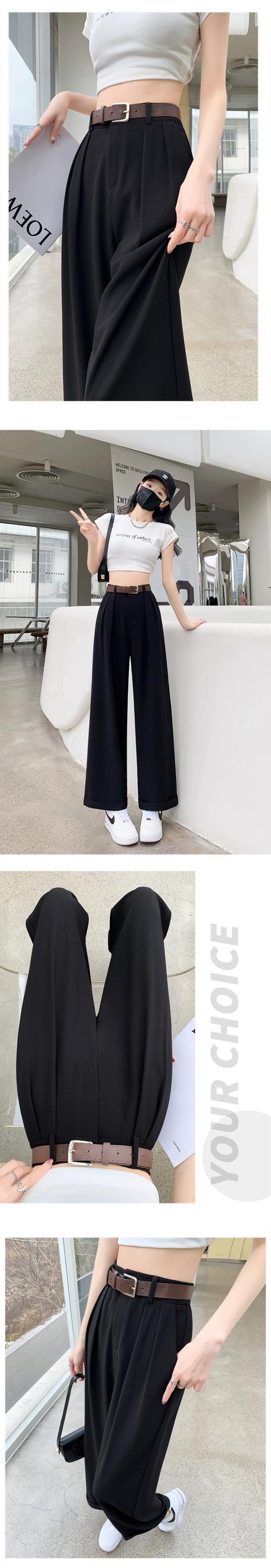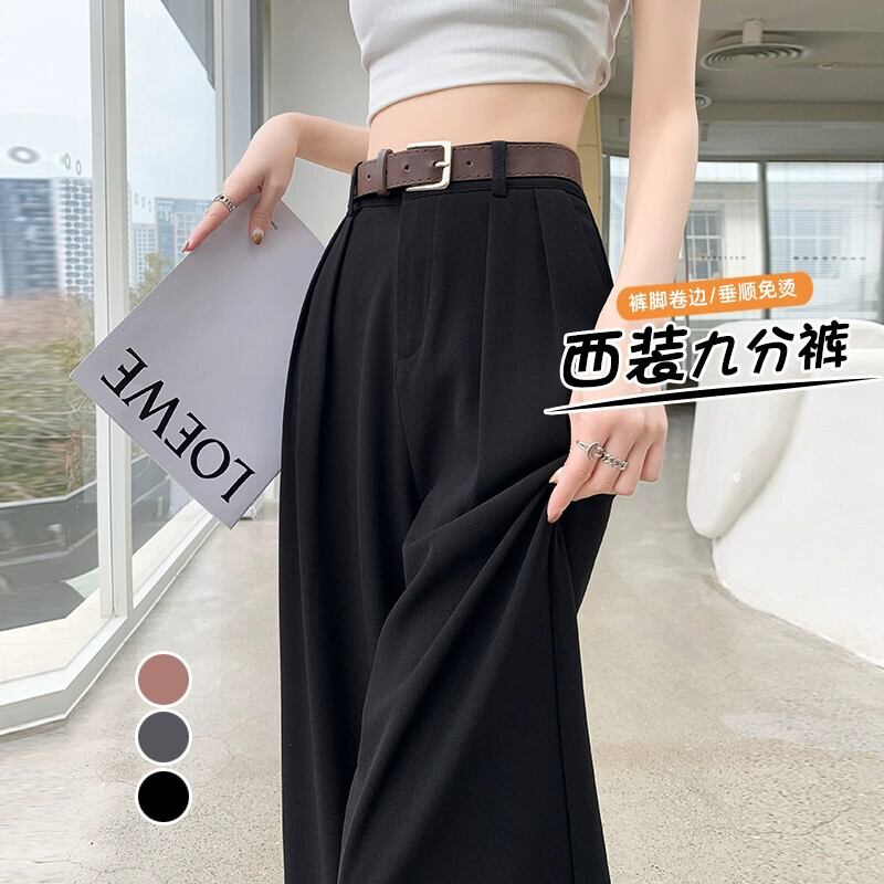 -夏の女性の黒のスーツパンツ、ハイウエスト、ルーズでカジュアル、9ポイントストレートワイドレッグパンツ、小柄な人向け ブラック サマー 夏物 7460053385640219 | framboise21