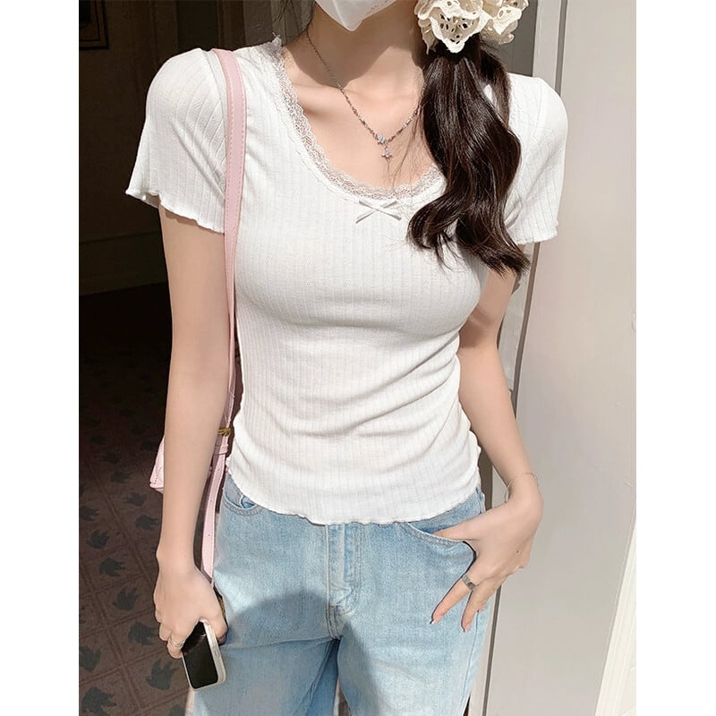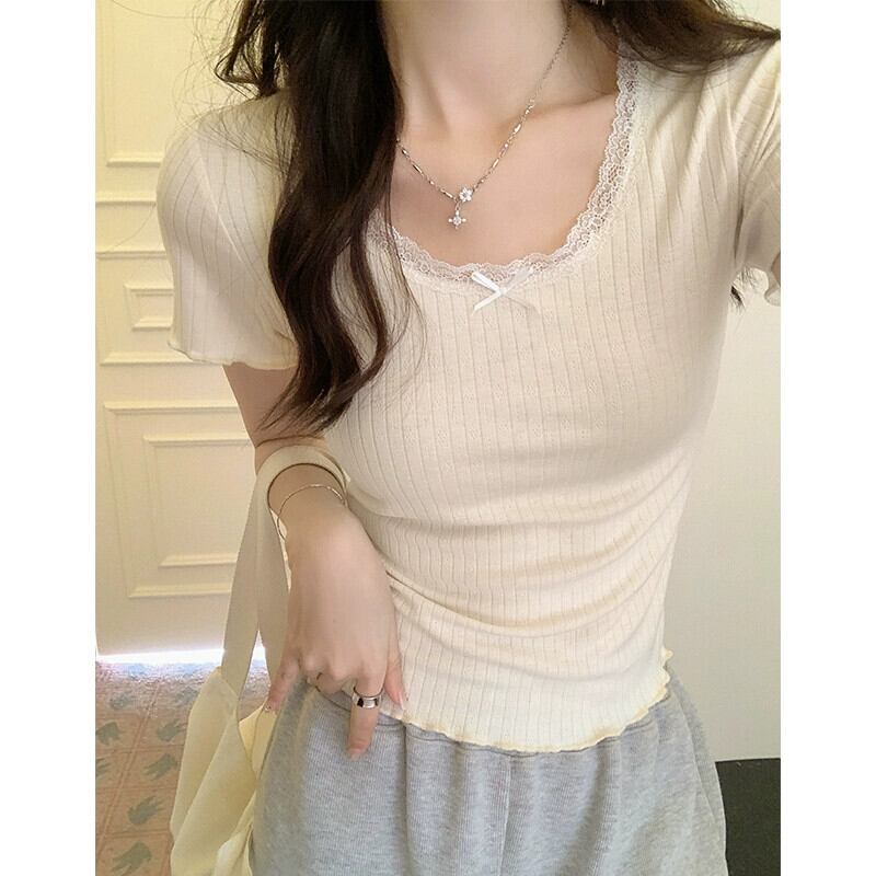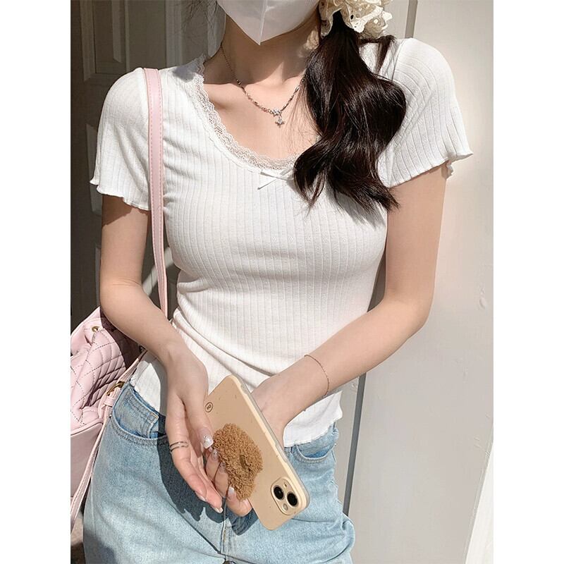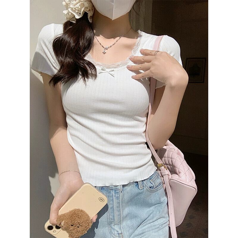 レースエッジ右肩半袖 tシャツ女性 2024 新しい夏のデザインスリムファッション気質ショートトップ白 ホワイト ハーフスリーブ サマー 夏物 7460032173012860 | framboise21