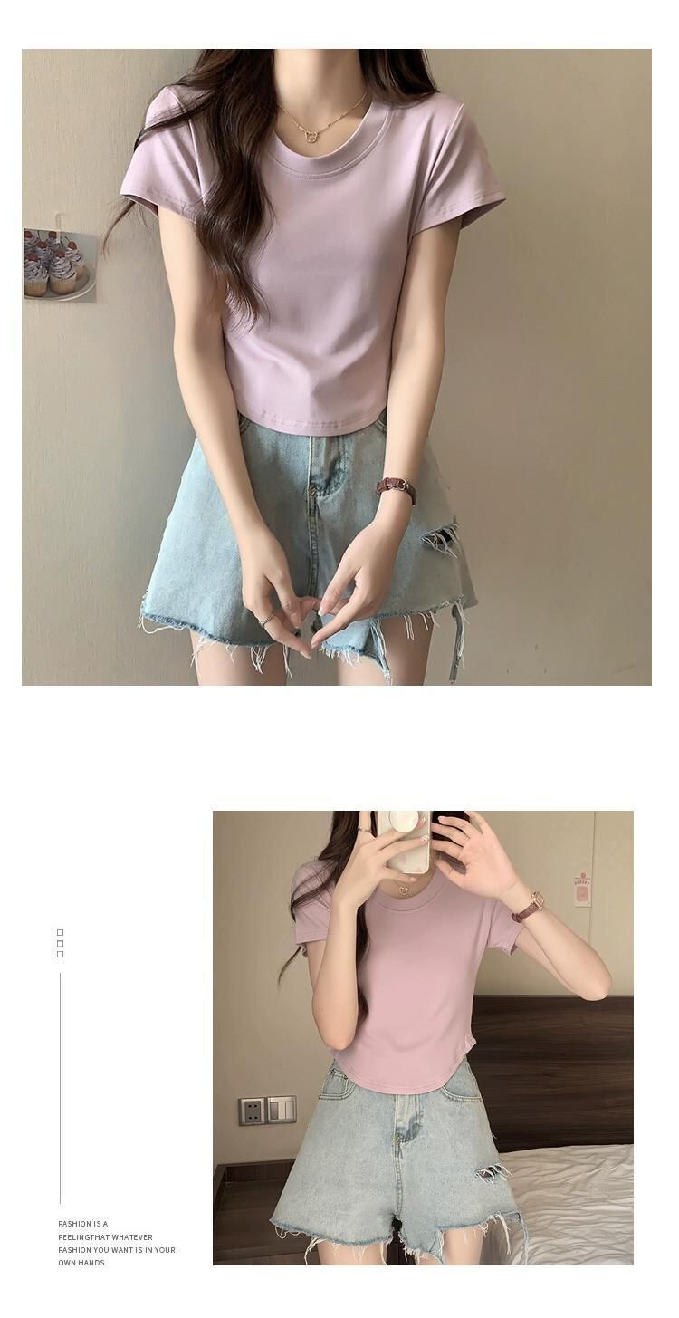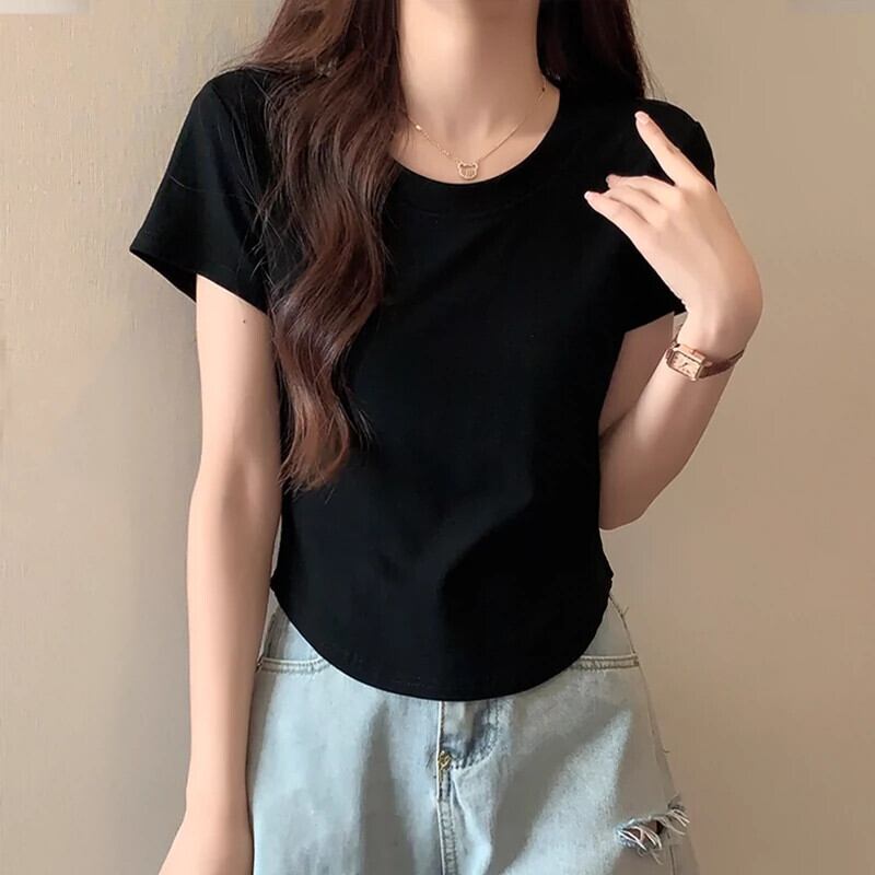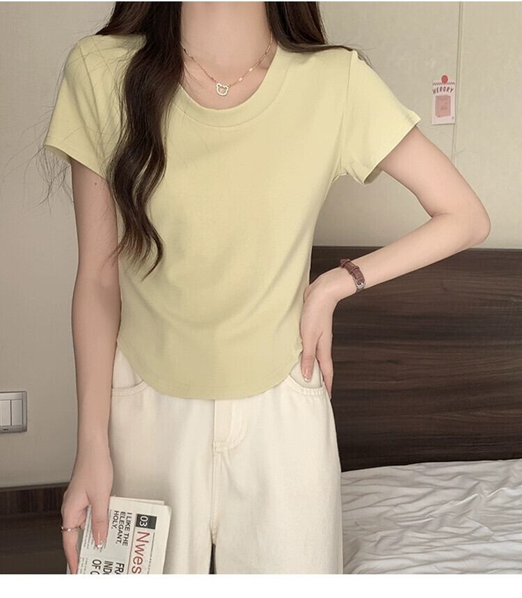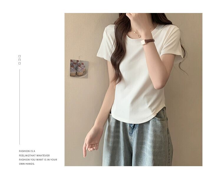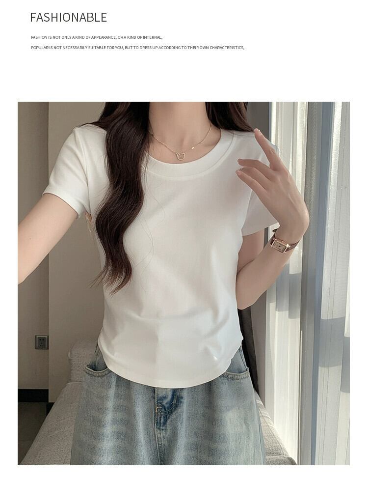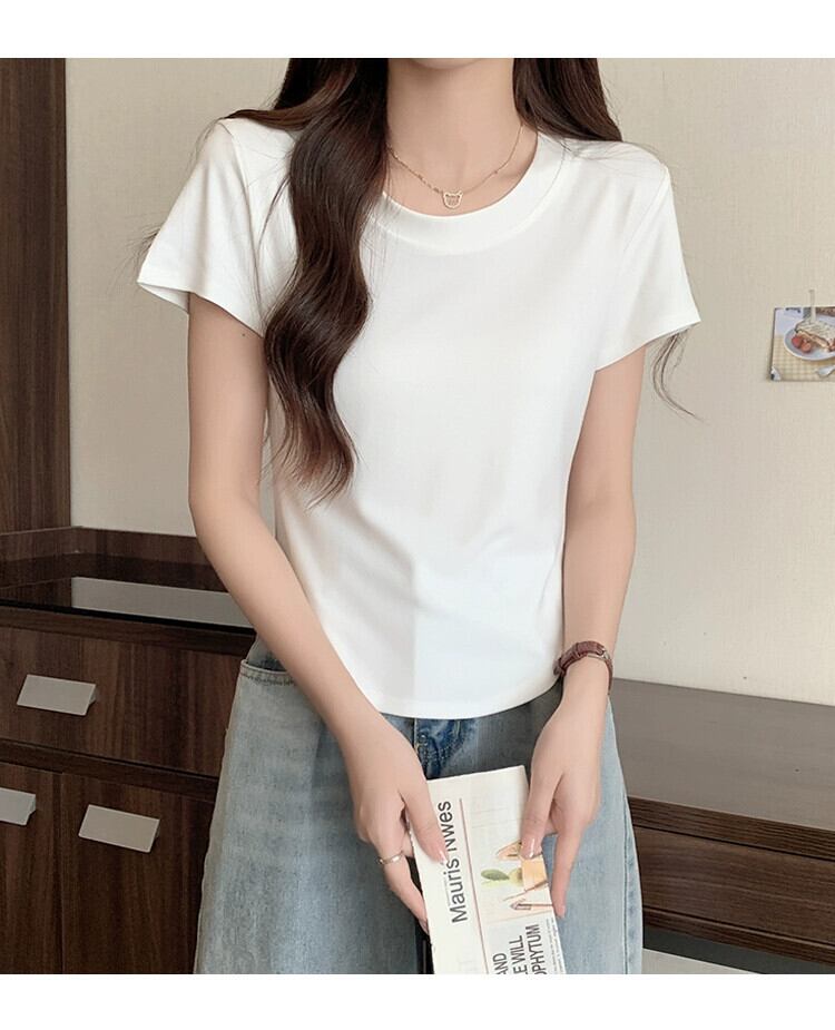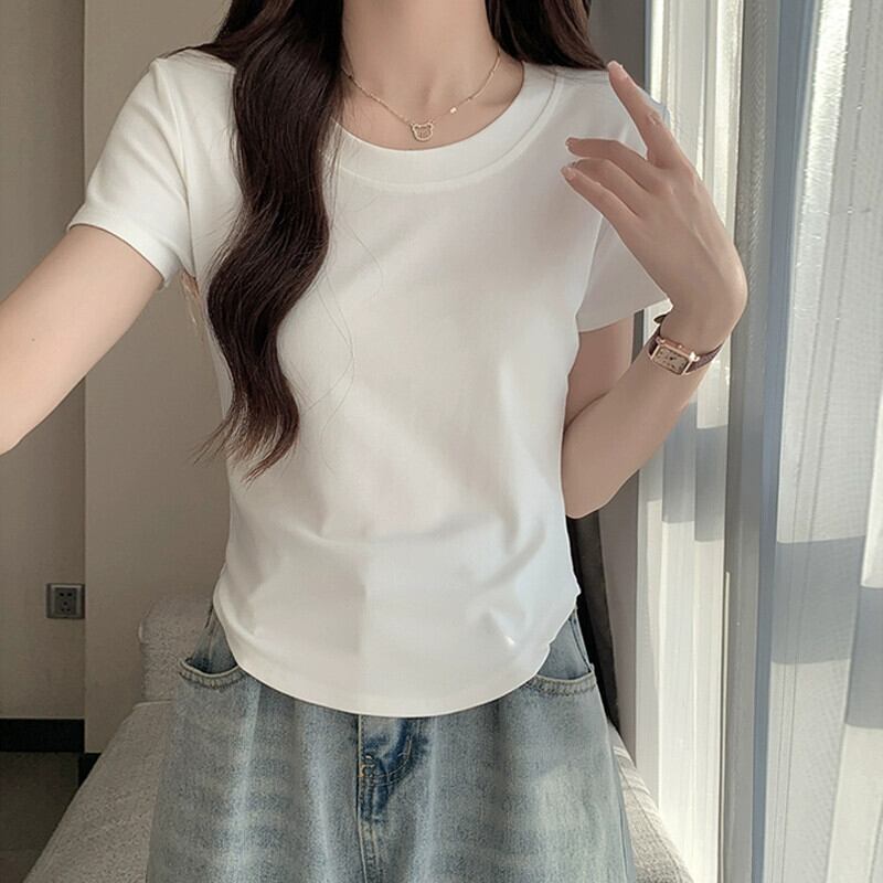 夏の白い右肩半袖 T シャツの女性。スリムでファッショナブルで多用途であることを目指します。イレギュラーなショートトップスがトレンドです。 ホワイト サマー 夏物 Tシャツ 7460022267737297 | framboise21