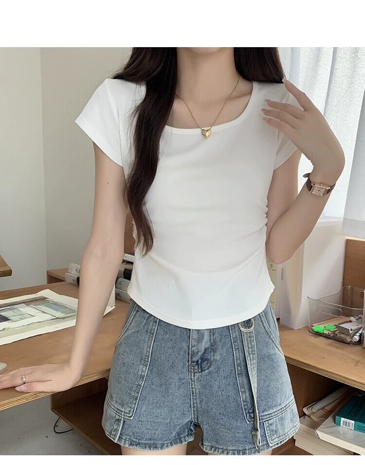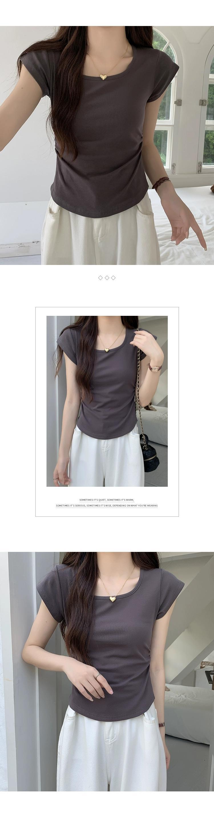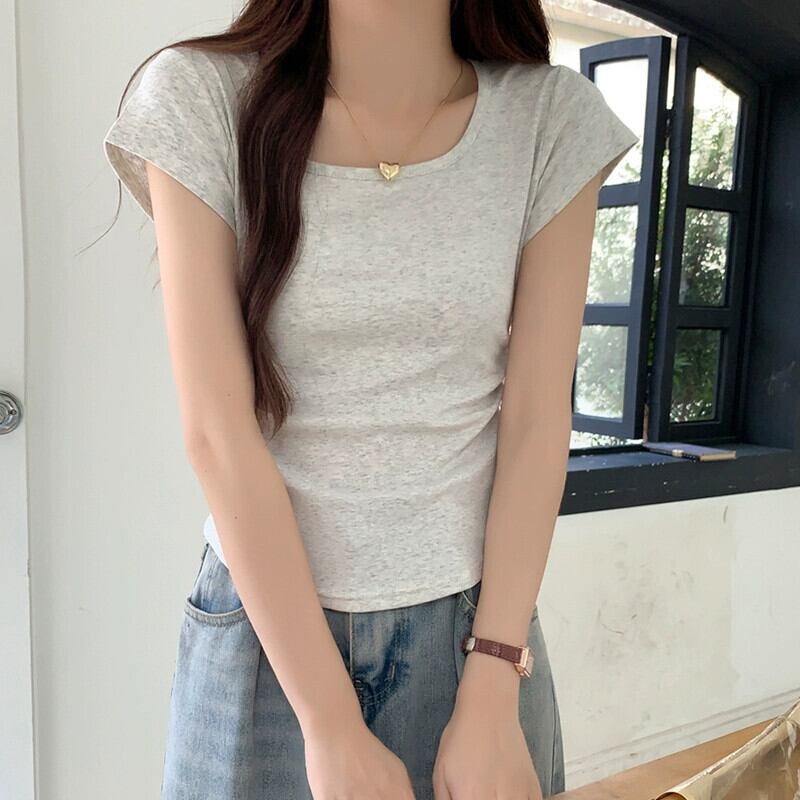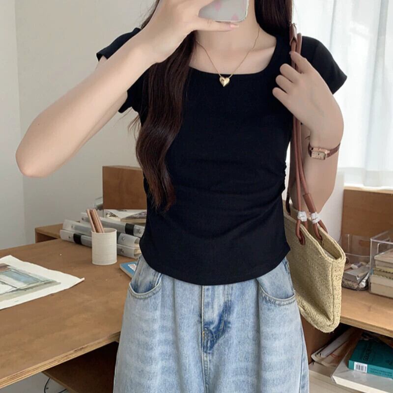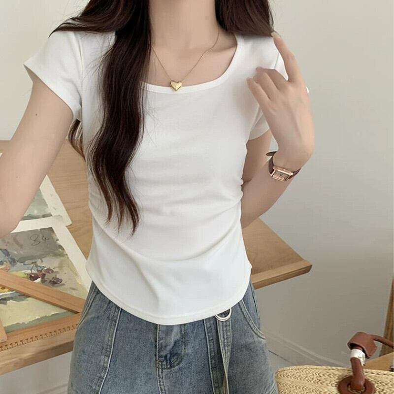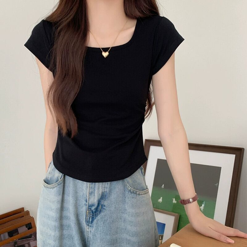 夏のイレギュラーショルダー半袖Tシャツレディース、スリムでファッショナブル、カーブした裾、プリーツスクエアネックショートトップ サマー 夏物 スクウェア 7460045285446261 | framboise21
