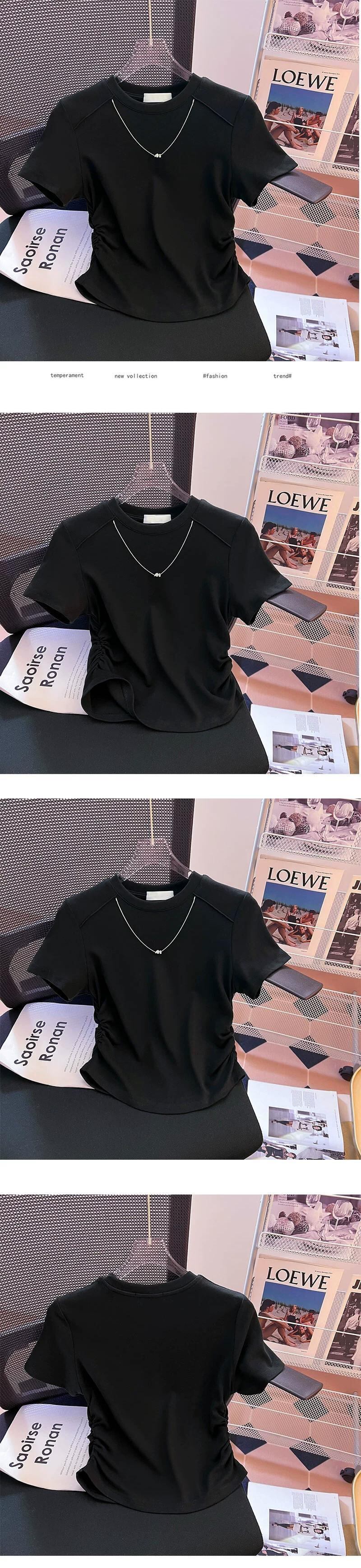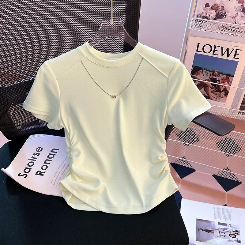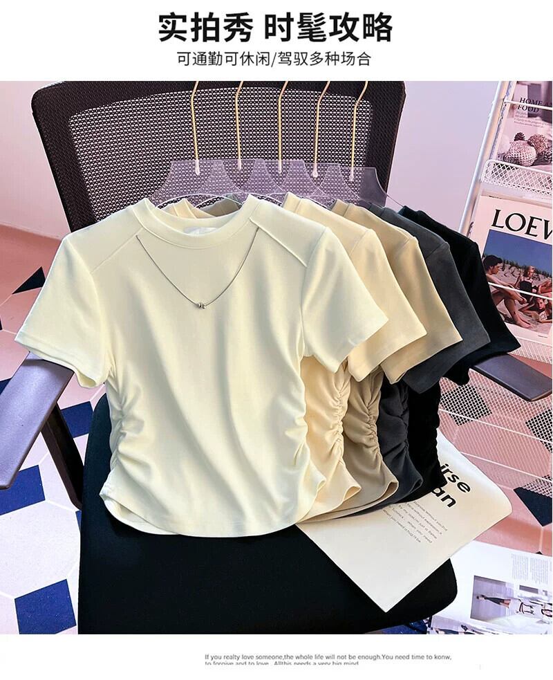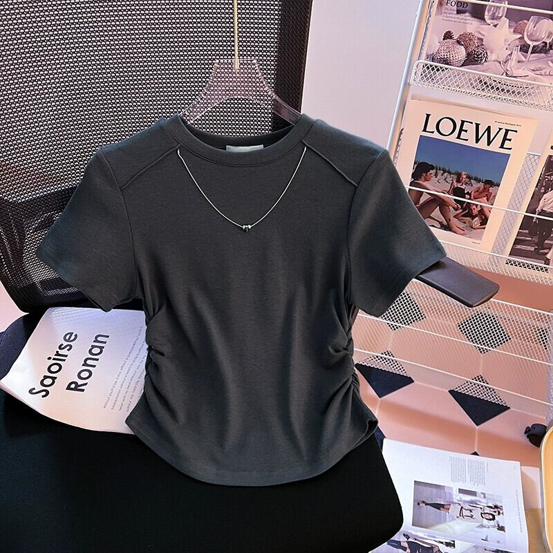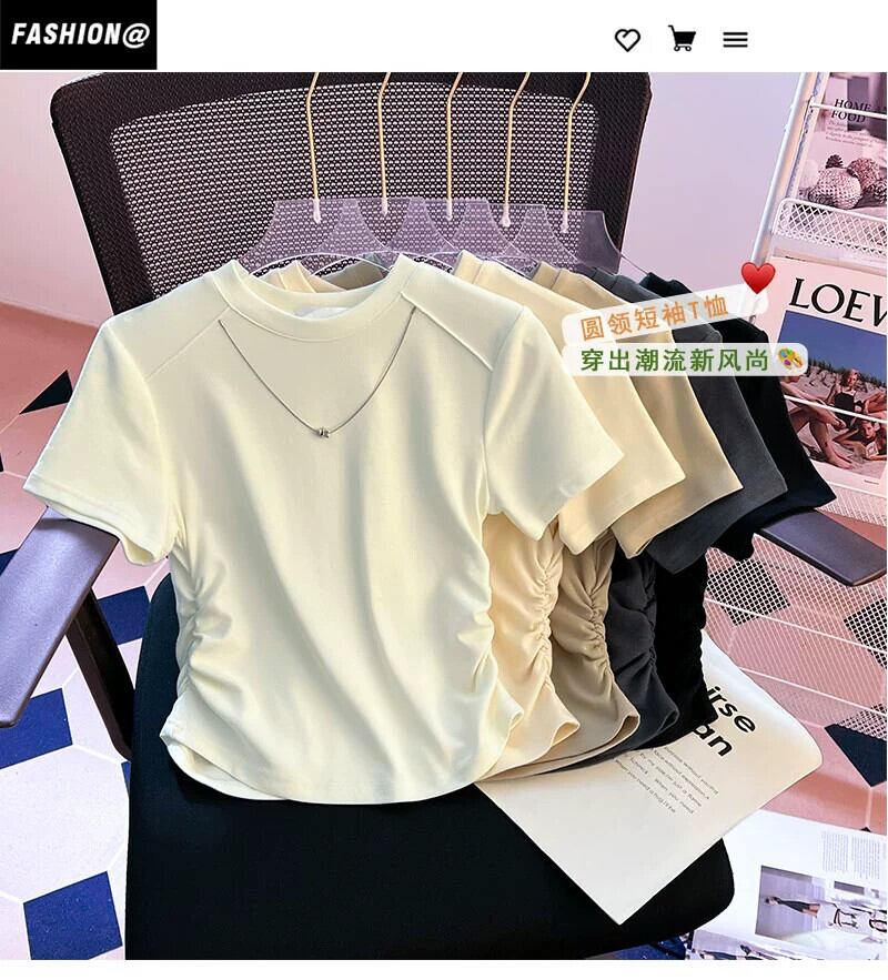 夏の純綿右肩半袖 T シャツの女性、スリムフィット、ファッショナブルでユニークな不規則なプリーツのショート トップ ホワイト コットン サマー 夏物 Tシャツ 7460074461770217 | framboise21