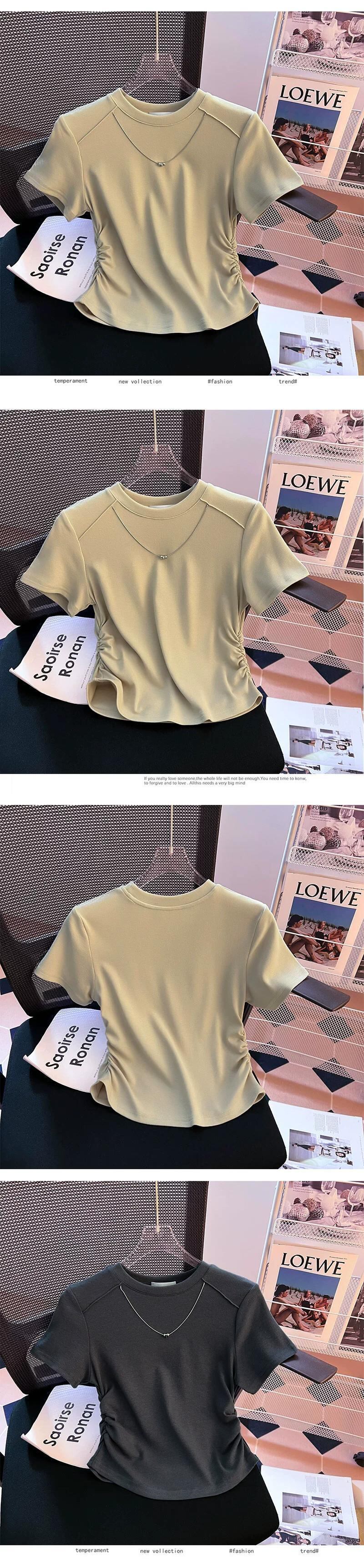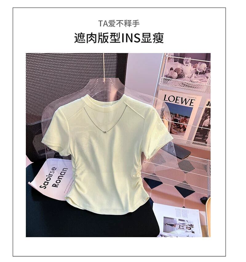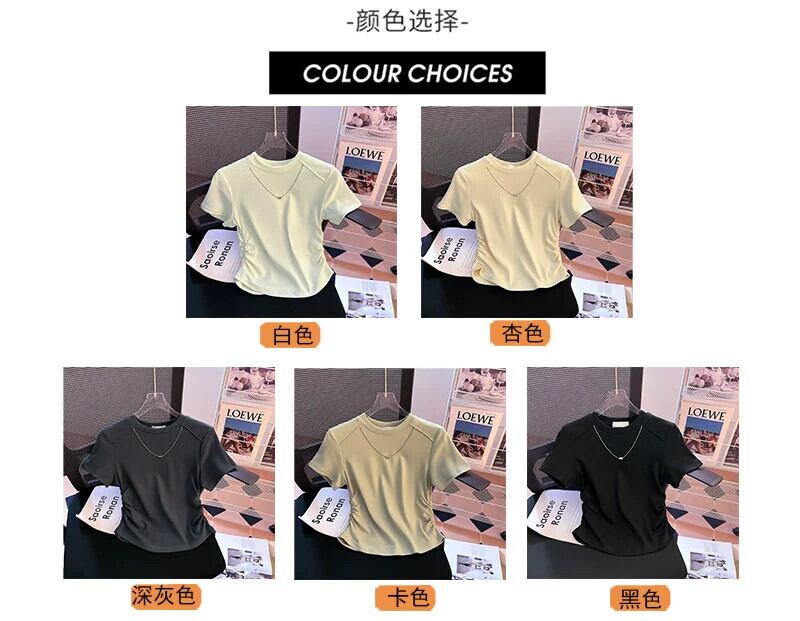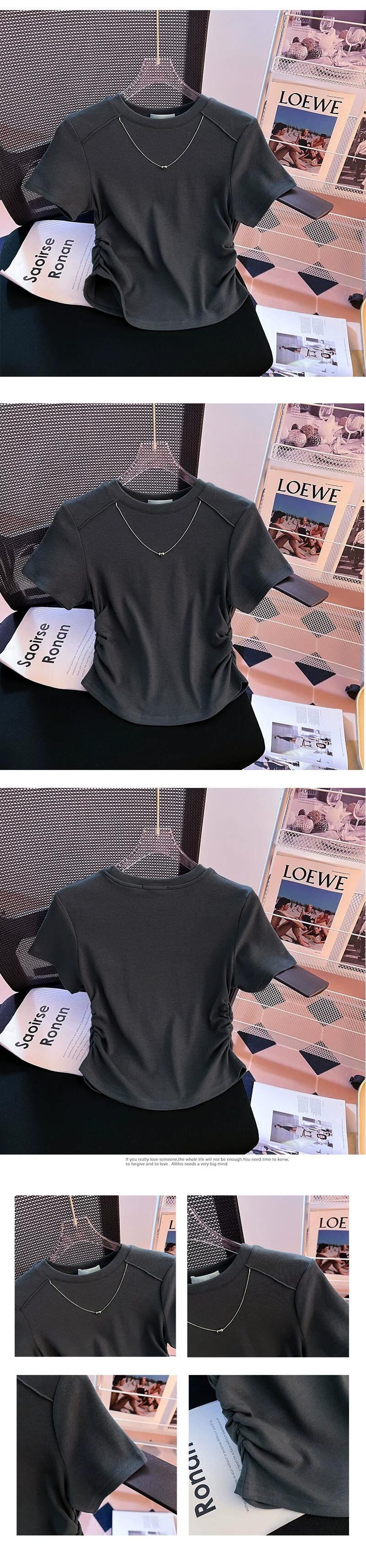 夏の純綿右肩半袖 T シャツの女性、スリムフィット、ファッショナブルでユニークな不規則なプリーツのショート トップ ホワイト コットン サマー 夏物 Tシャツ 7460074461770217 | framboise21