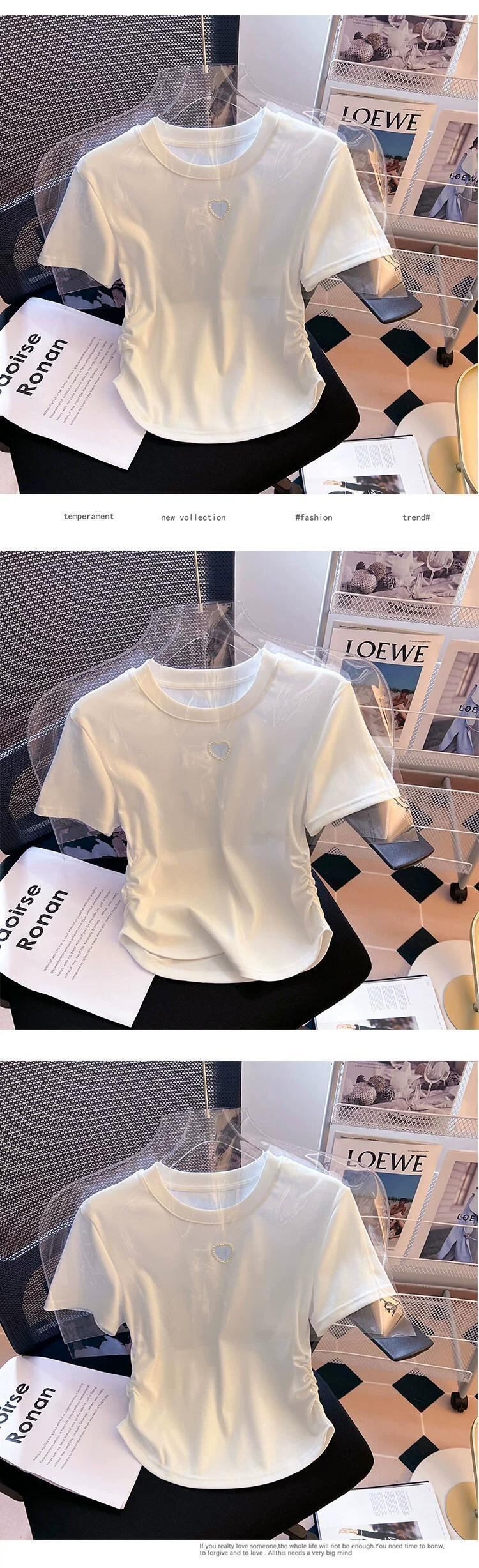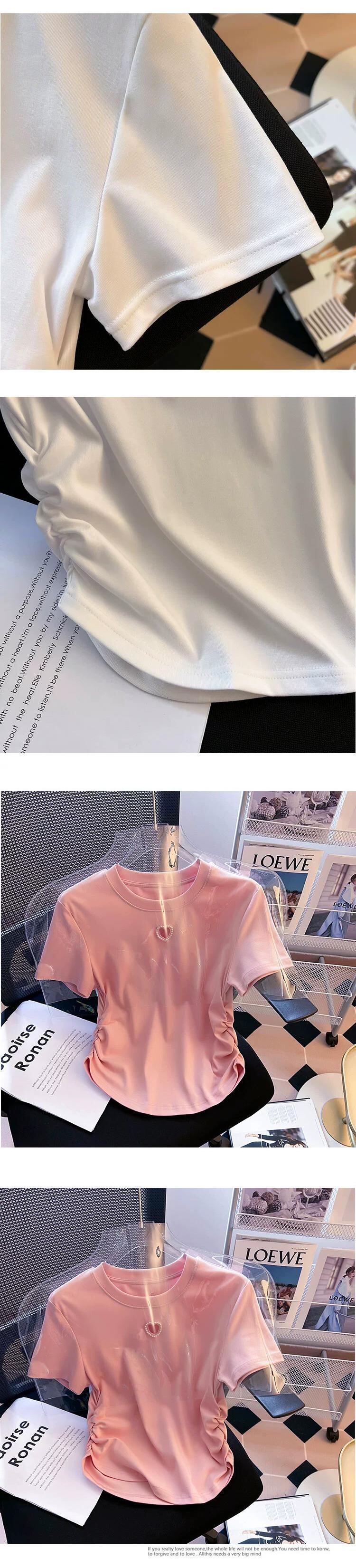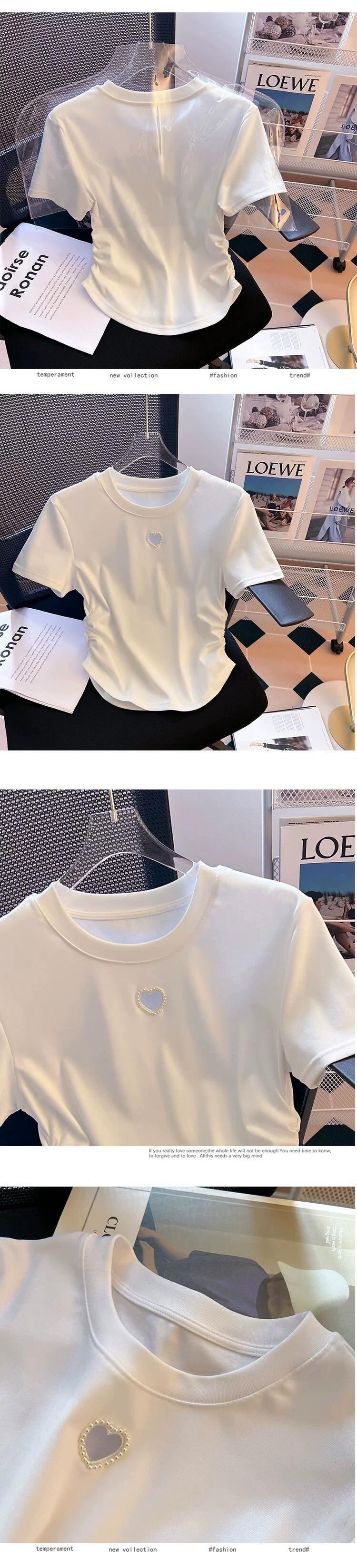 ラブホロウ 右肩半袖Tシャツ レディース 夏 スリム 不規則プリーツ ピュアコットン ショートトップ ホワイト ハーフスリーブ サマー 夏物 7460072595386568 | framboise21