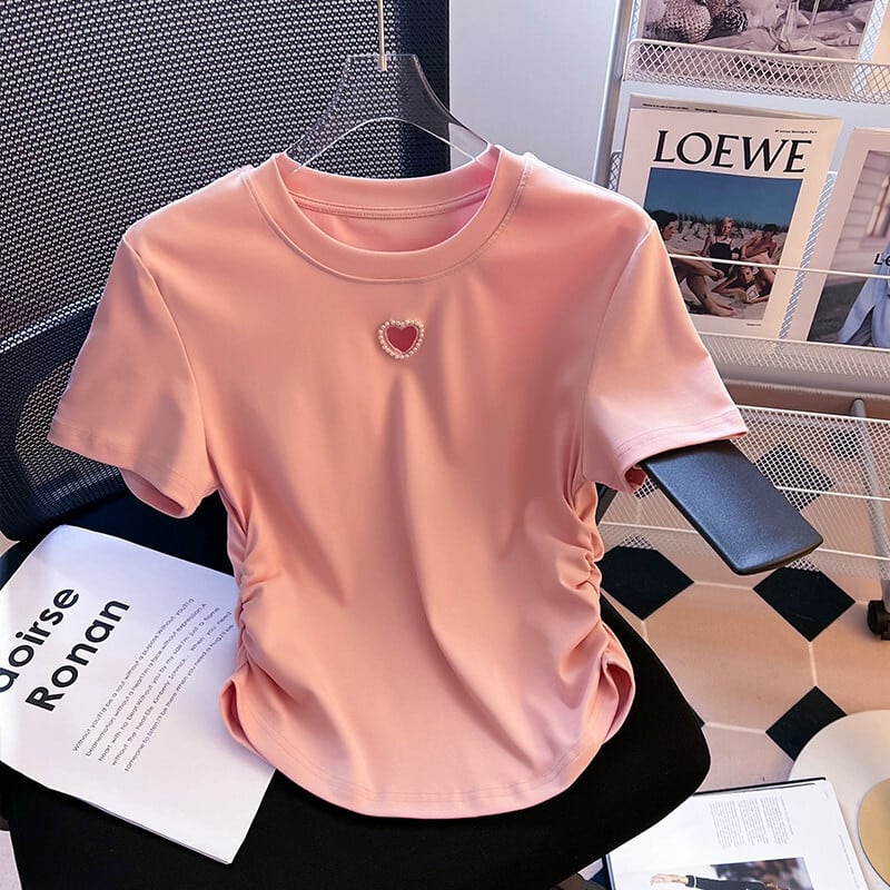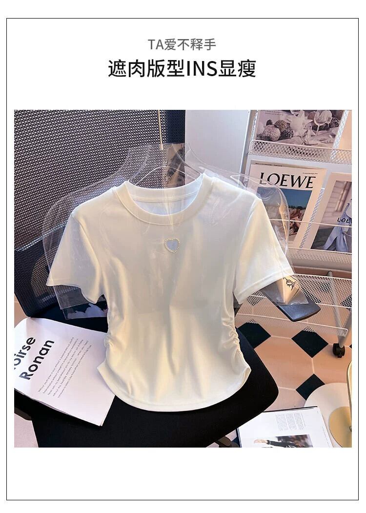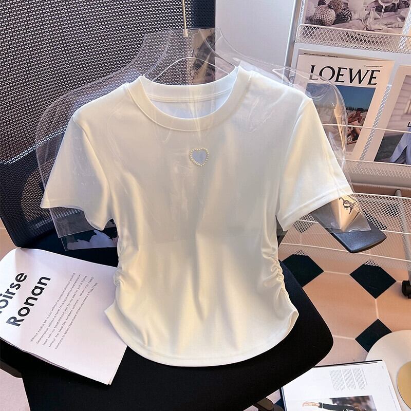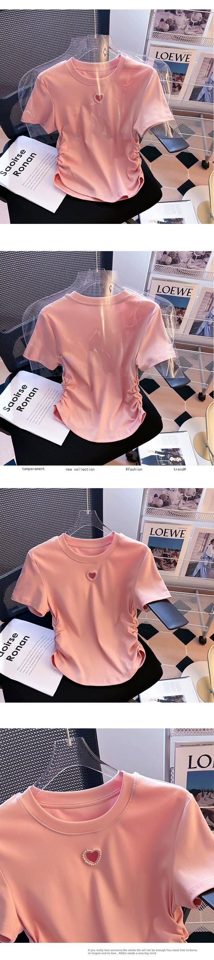 ラブホロウ 右肩半袖Tシャツ レディース 夏 スリム 不規則プリーツ ピュアコットン ショートトップ ホワイト ハーフスリーブ サマー 夏物 7460072595386568 | framboise21