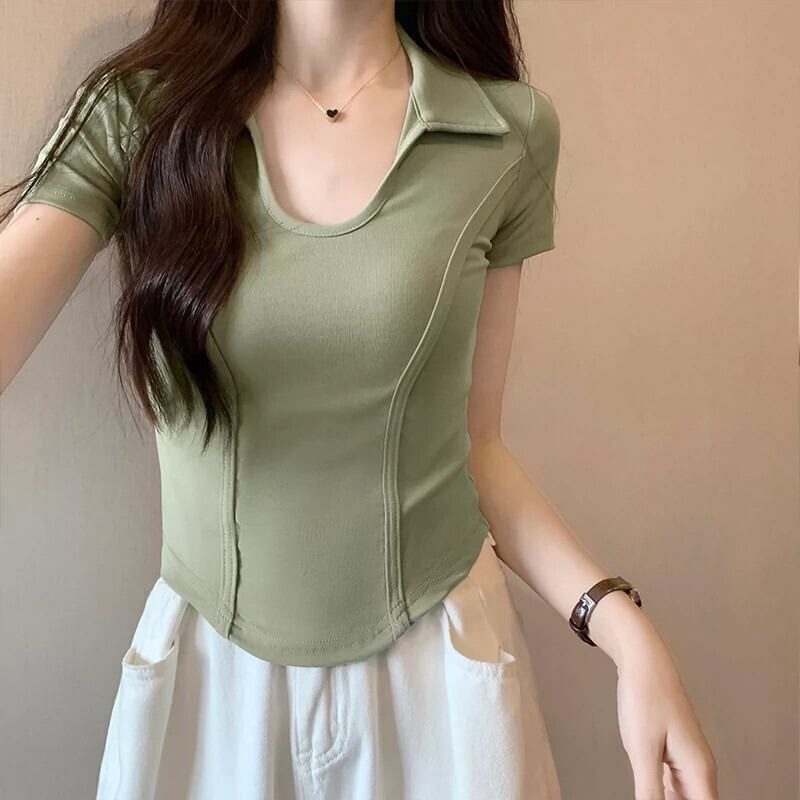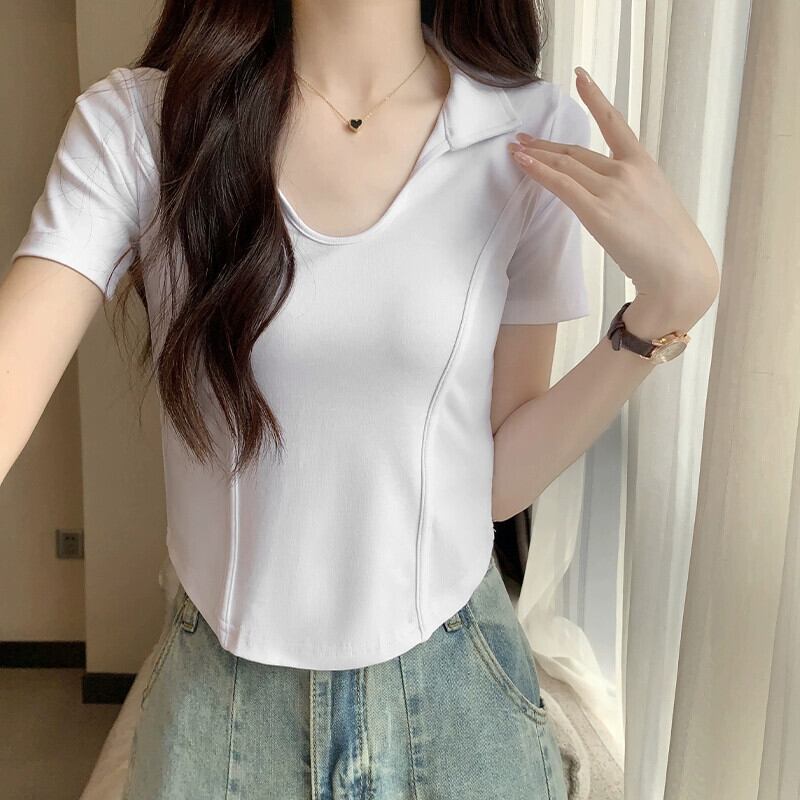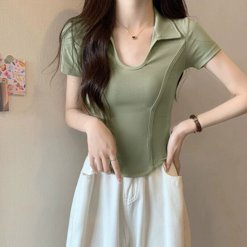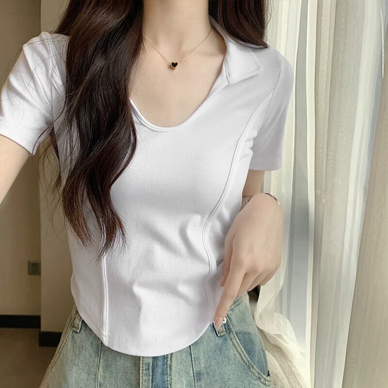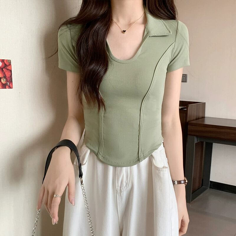 夏の不規則な半袖コットン T シャツの女性、ファッショナブルでスタイリッシュなデザイン、スリムフィットのフィッシュボーン ショート ポロカラー トップ サマー 夏物 Tシャツ 746004752969965 | framboise21