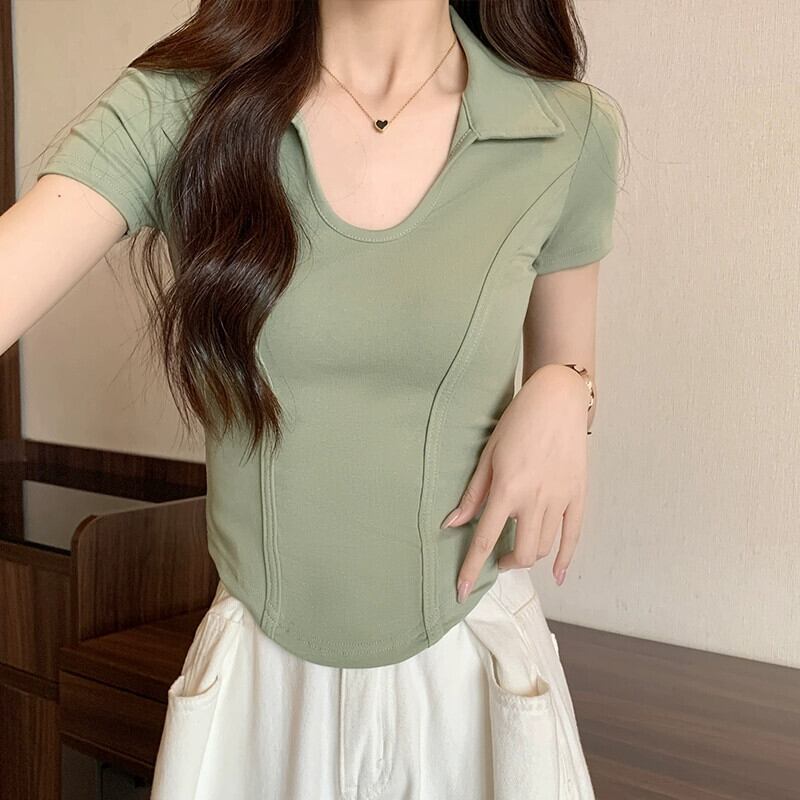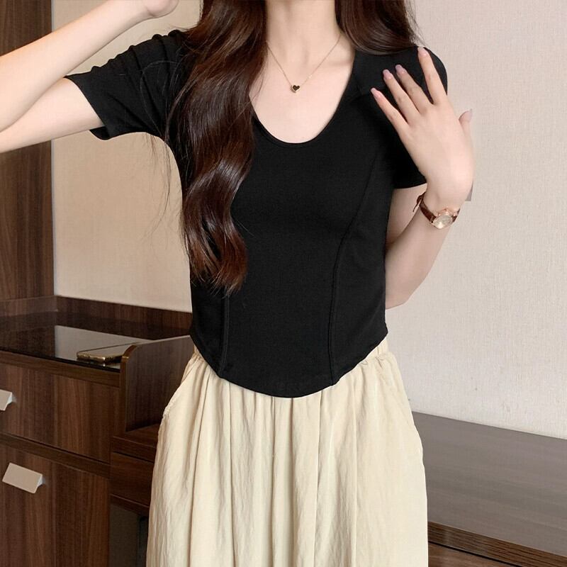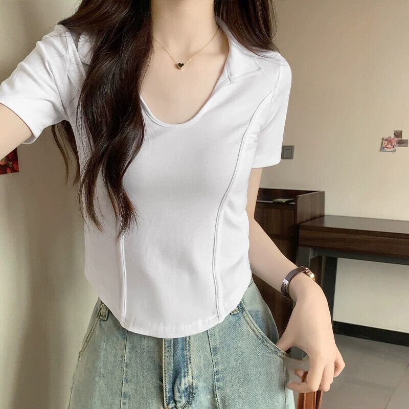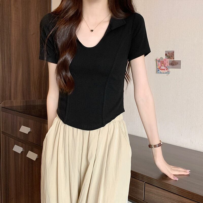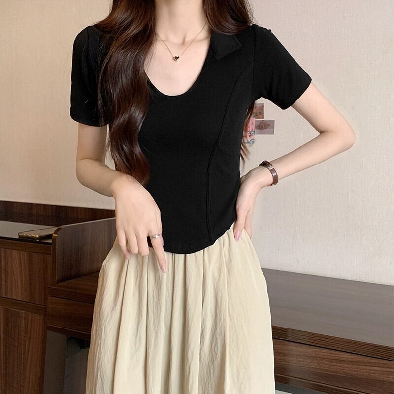夏の不規則な半袖コットン T シャツの女性、ファッショナブルでスタイリッシュなデザイン、スリムフィットのフィッシュボーン ショート ポロカラー トップ サマー 夏物 Tシャツ 746004752969965 | framboise21