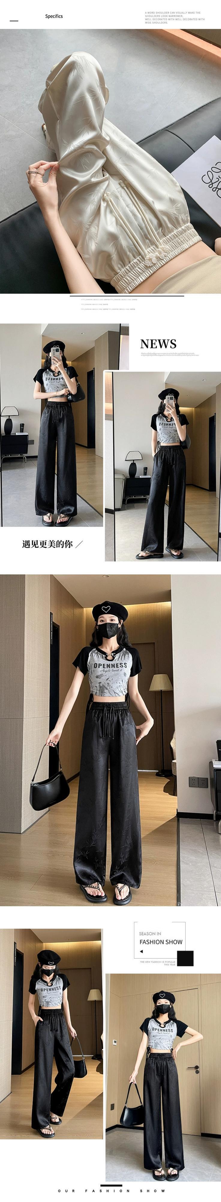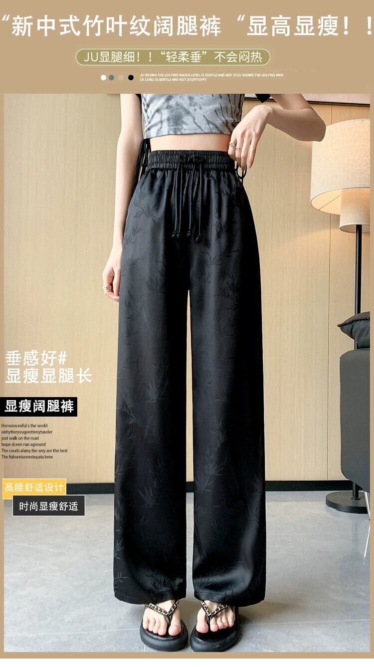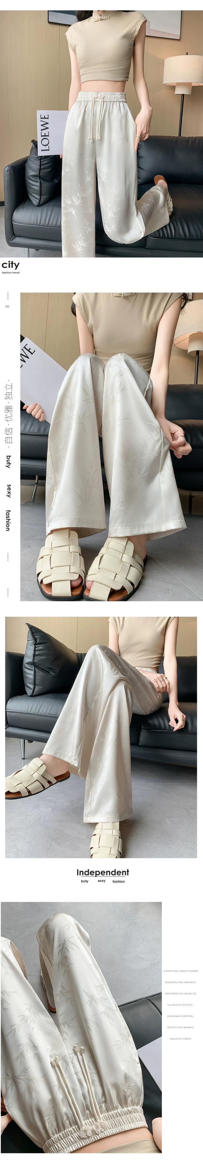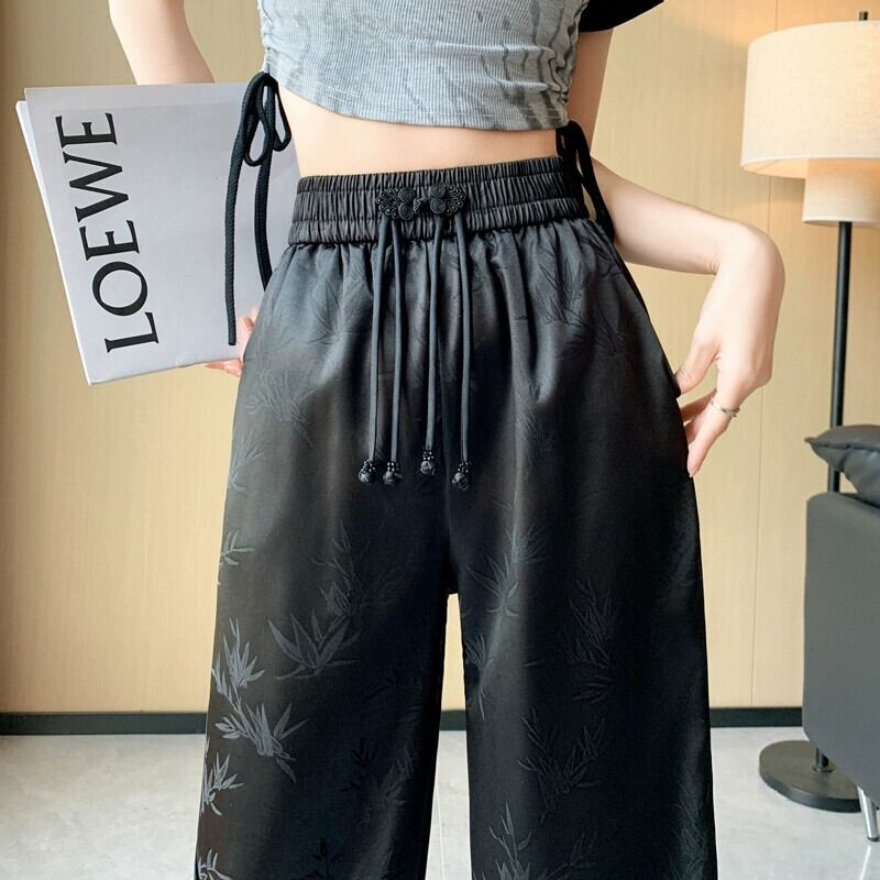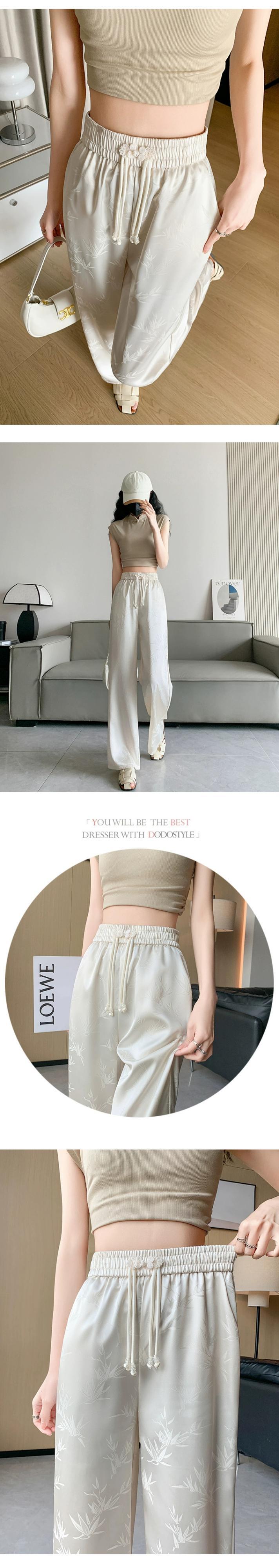 中国風の中国風のボタンアップパンツの女性の夏、薄いジャカードシルクのワイドレッグパンツ、ハイウエストのドレープストレートカジュアルパンツ サマー 夏物 7460025208524515 | framboise21