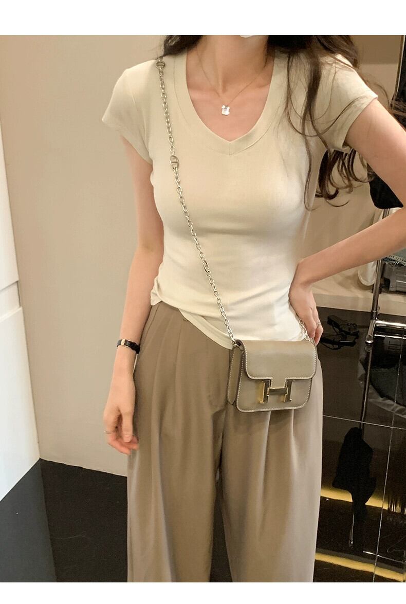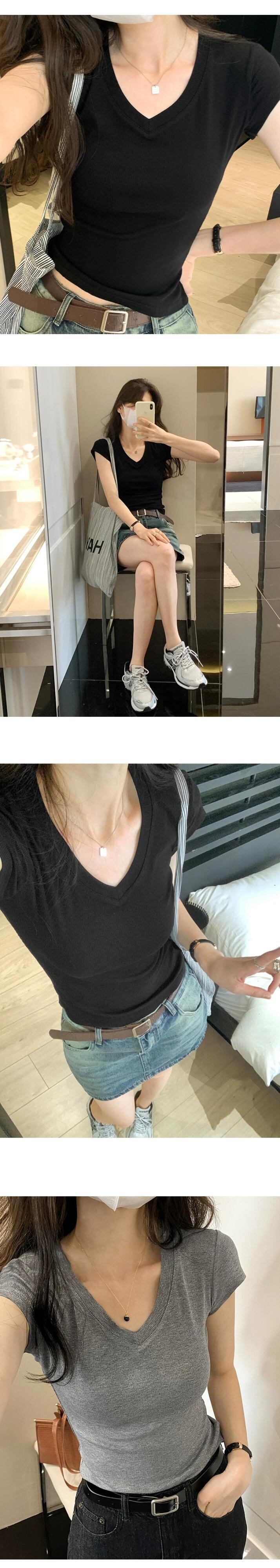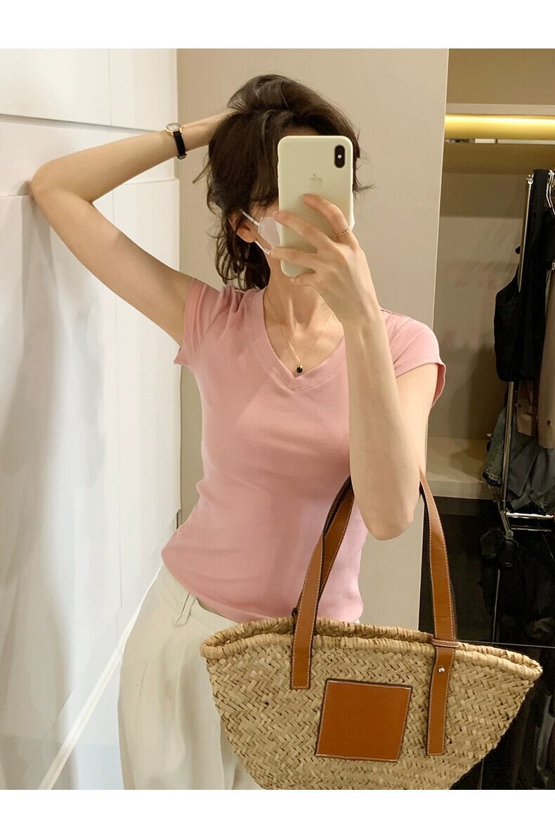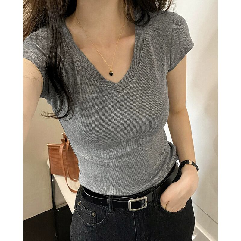 純粋な綿の右肩半袖 T シャツの女性の夏、ハイエンド、スリムで多用途、基本的なロー V ネック トップ グレー コットン サマー 夏物 Vネック Tシャツ 7460050657604333 | framboise21