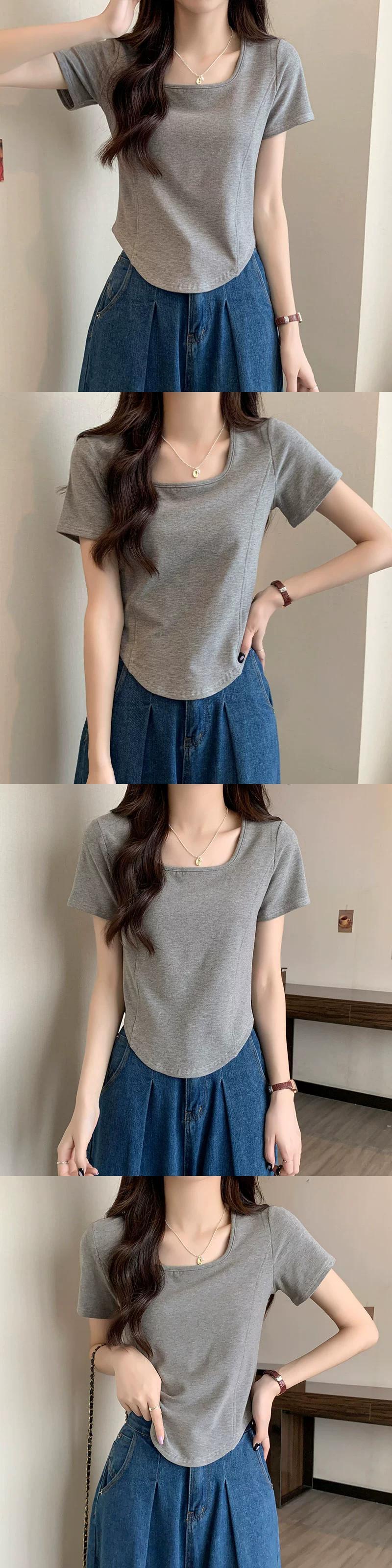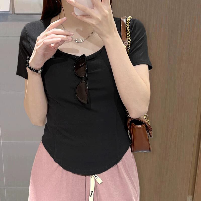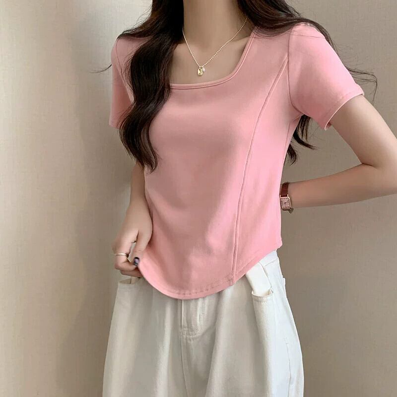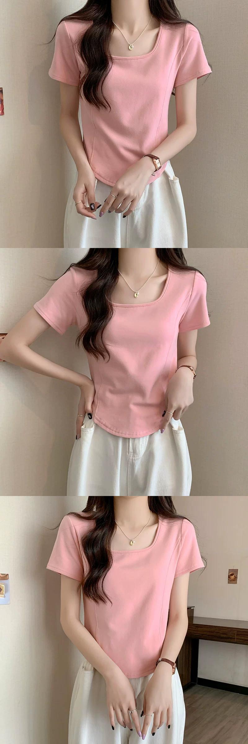 夏のピンクの綿半袖Tシャツの女性、シックで美しいデザイン、スリムで不規則な曲線のショートスクエアネックトップ コットン サマー 夏物 スクウェア 7460066678268868 | framboise21
