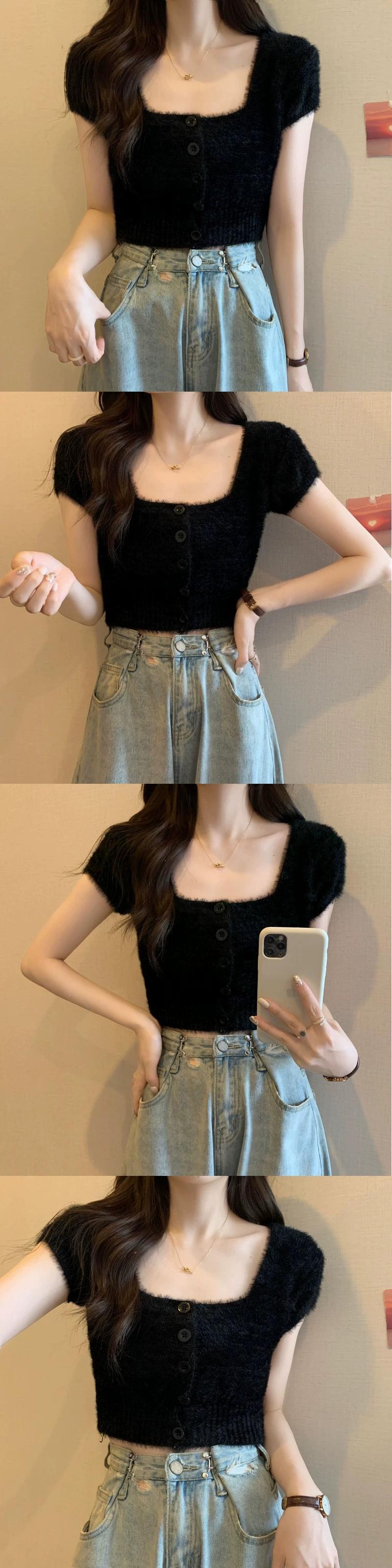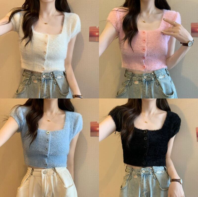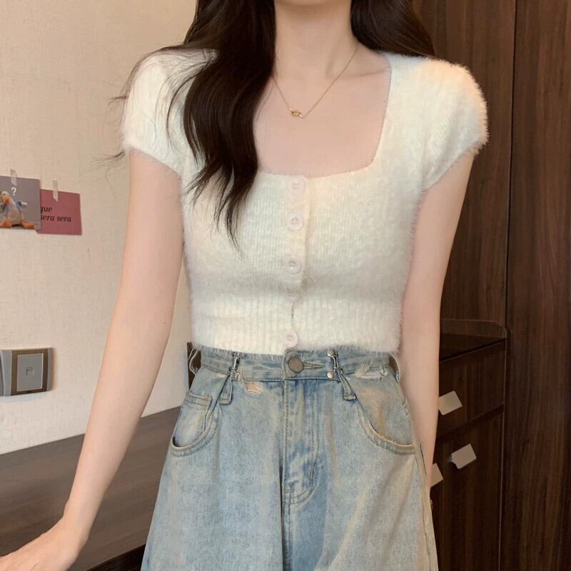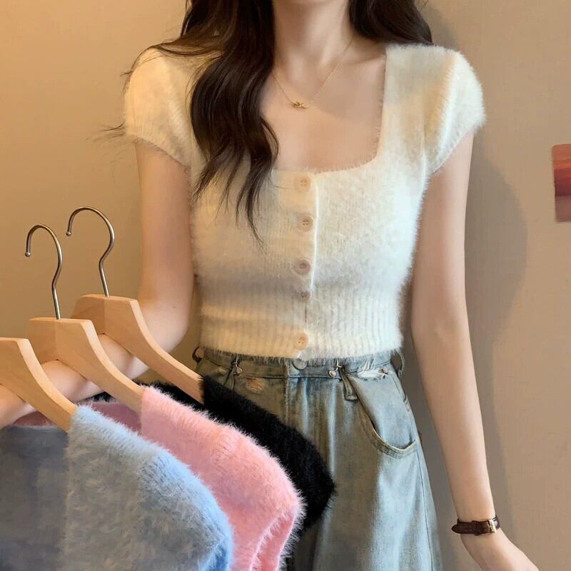 ショート半袖トップ女性の夏薄いスリムフィット甘くてスパイシーなモヘアセータースクエアネックtシャツ 大人ガーリー スウィート キュート カジュアル サマー 夏物 スクウェア 746009817128939 | framboise21