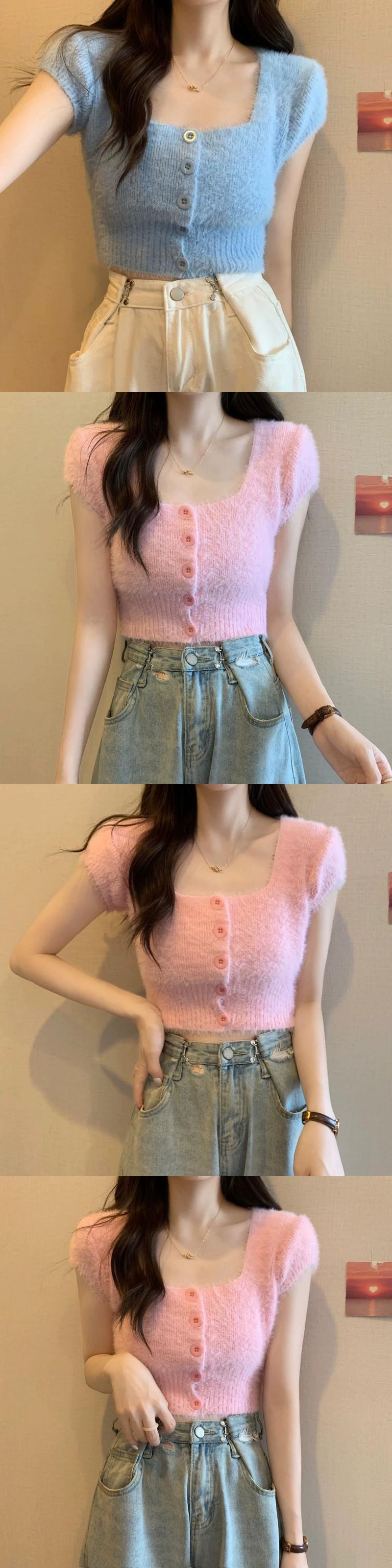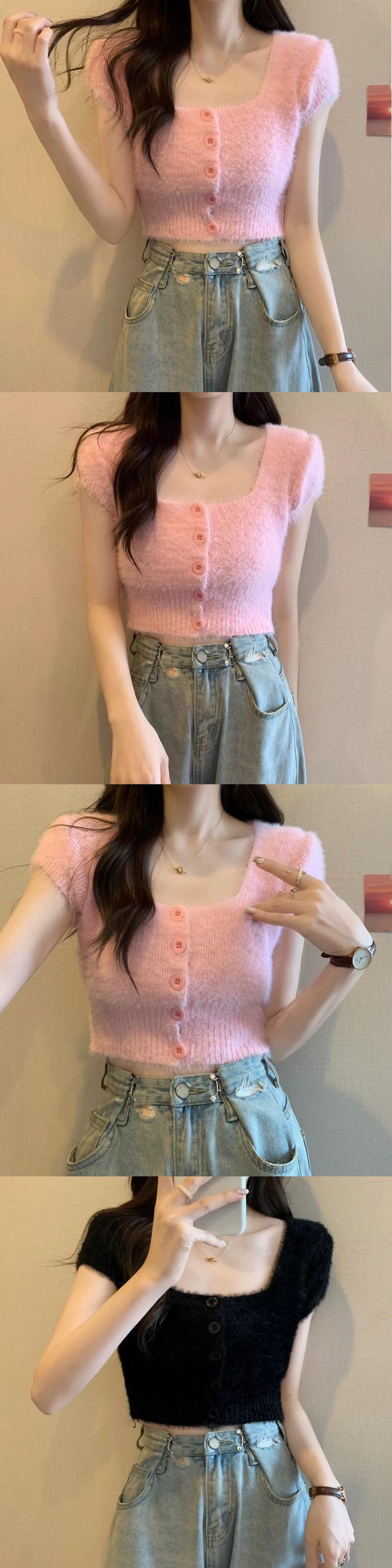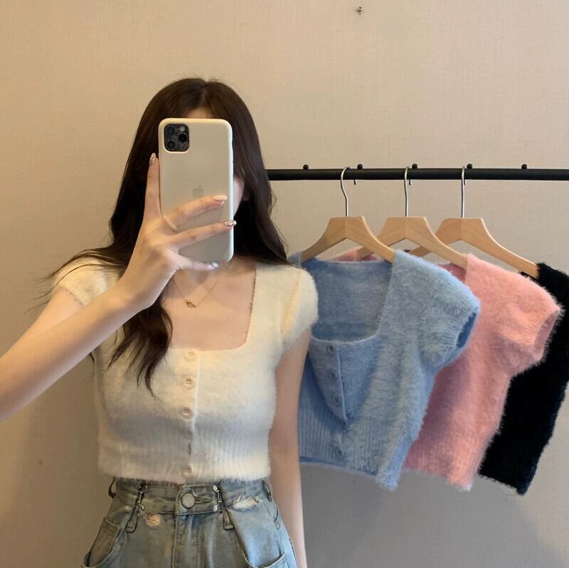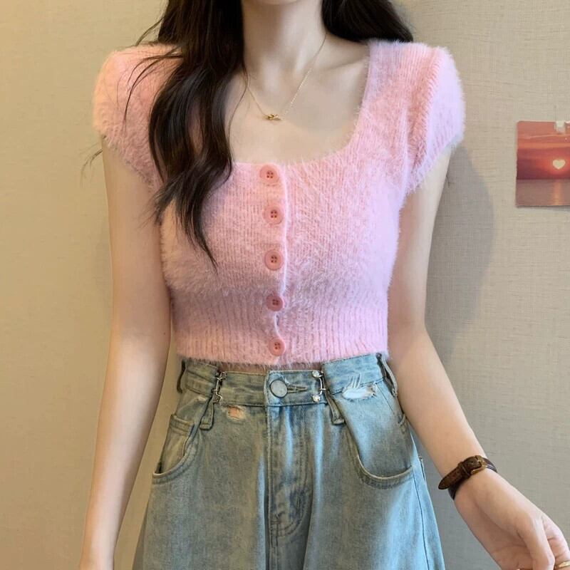 ショート半袖トップ女性の夏薄いスリムフィット甘くてスパイシーなモヘアセータースクエアネックtシャツ 大人ガーリー スウィート キュート カジュアル サマー 夏物 スクウェア 746009817128939 | framboise21
