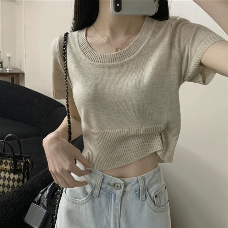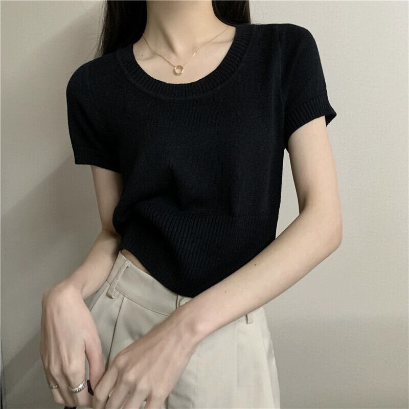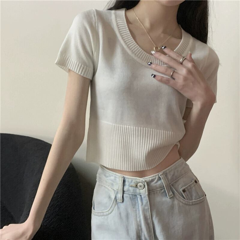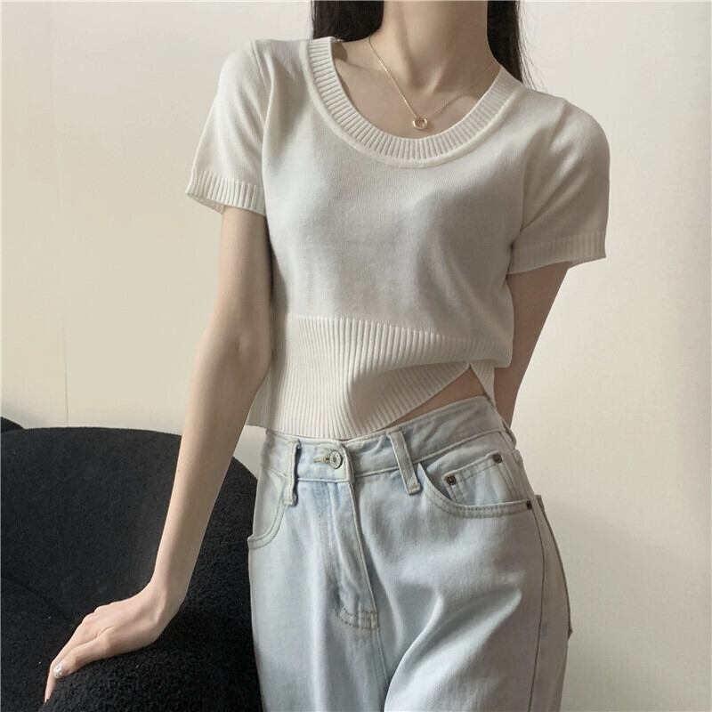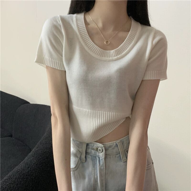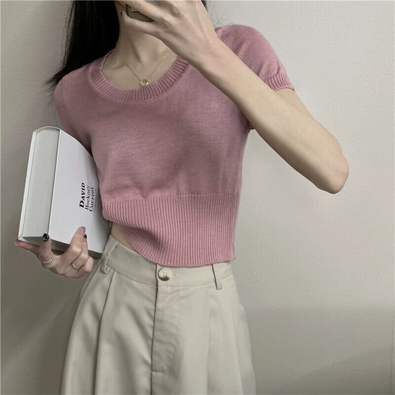 夏の薄いアイスシルクニット半袖Tシャツレディース、ゆったり、ファッショナブルでスタイリッシュ、おへそが露出した半袖トップネクタイ サマー 夏物 7460055481731637 | framboise21