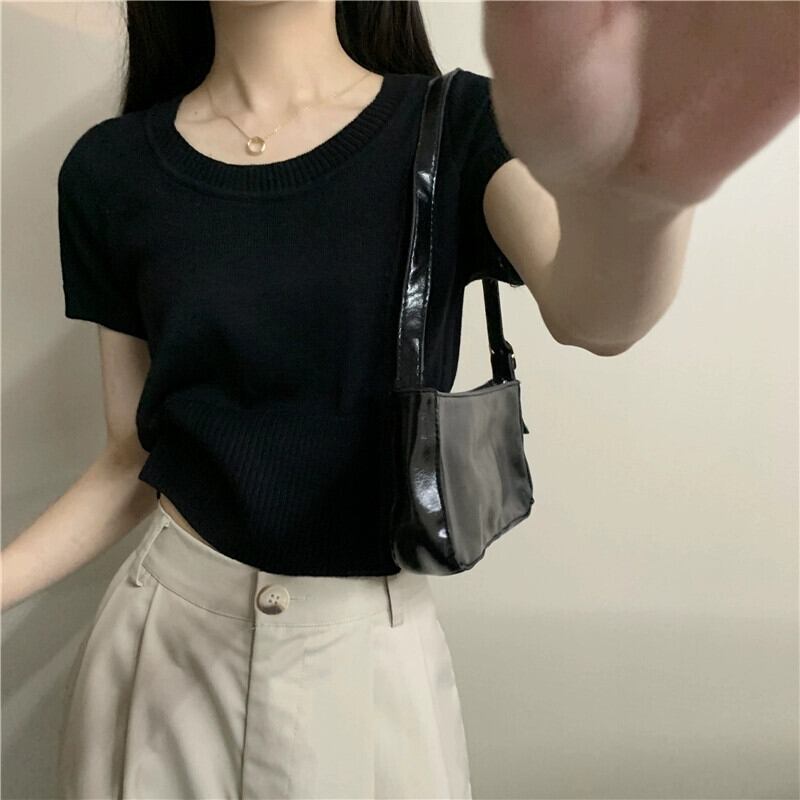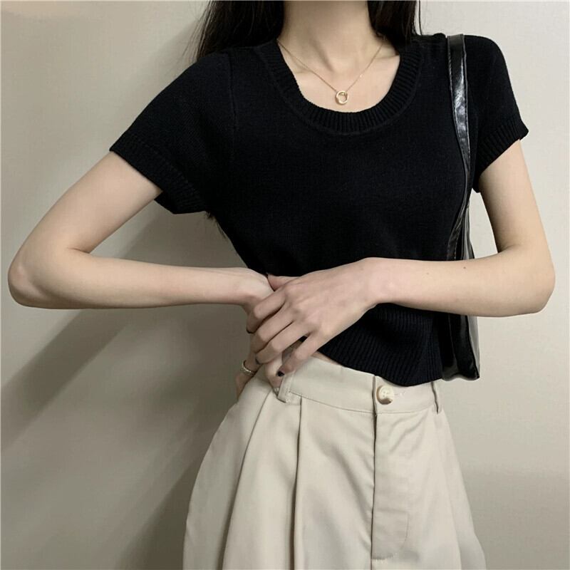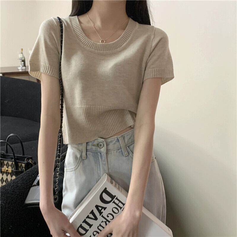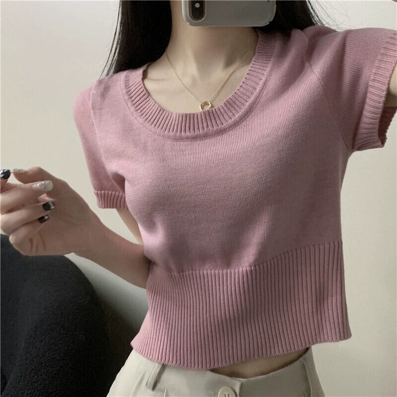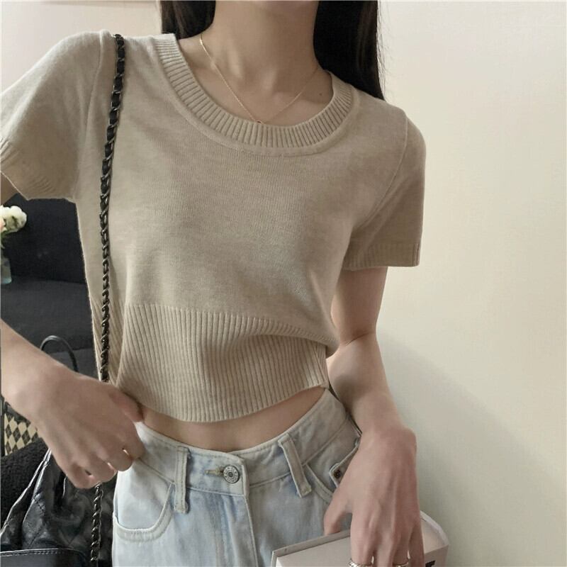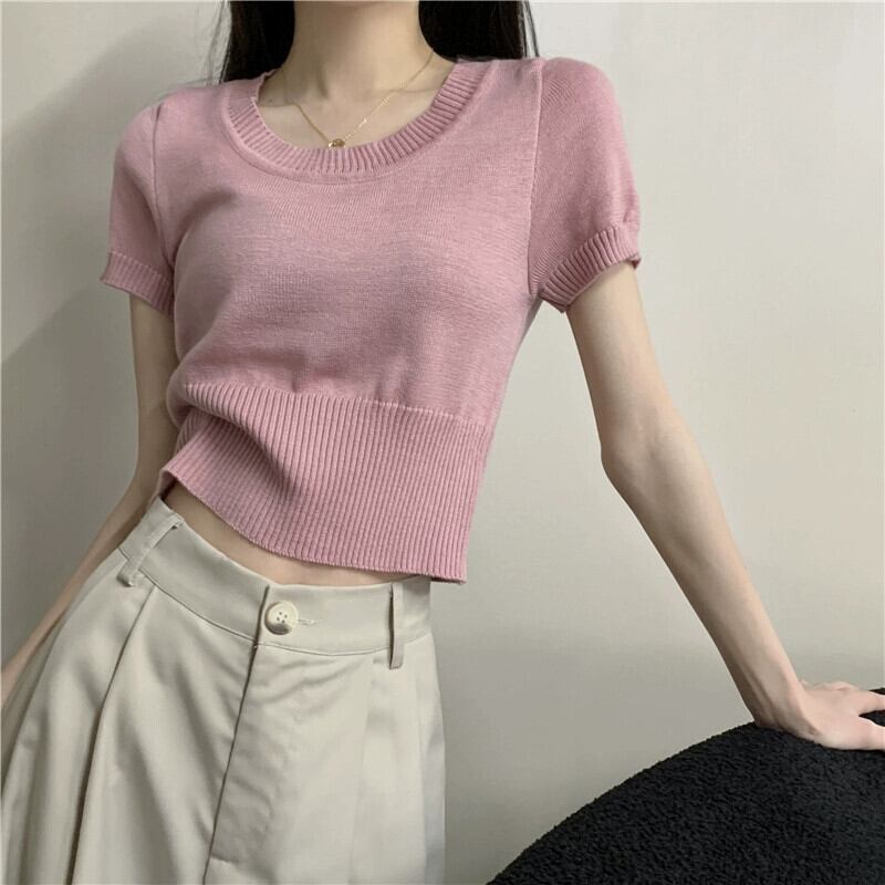 夏の薄いアイスシルクニット半袖Tシャツレディース、ゆったり、ファッショナブルでスタイリッシュ、おへそが露出した半袖トップネクタイ サマー 夏物 7460055481731637 | framboise21