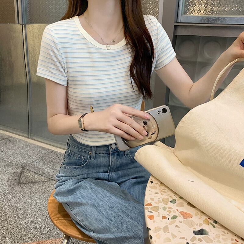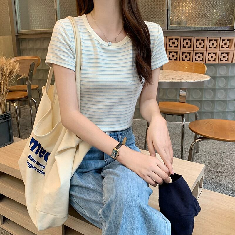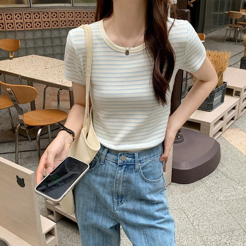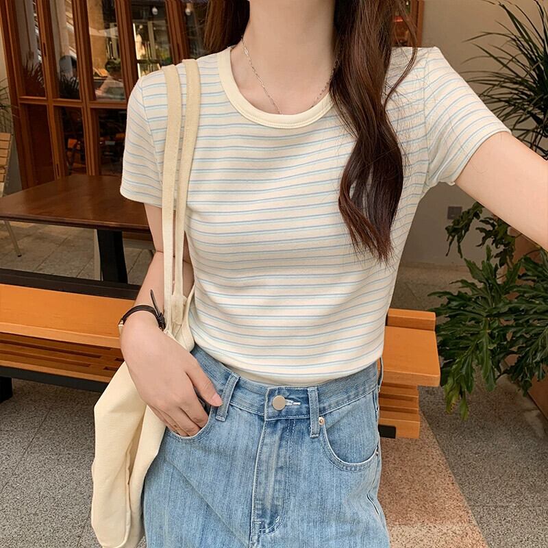純綿ストライプ右肩半袖 tシャツの女性 2024 新しい夏スリムでファッショナブルなラウンドネックショートトップ コットン サマー 夏物 Oネック 7460019715665653 | framboise21