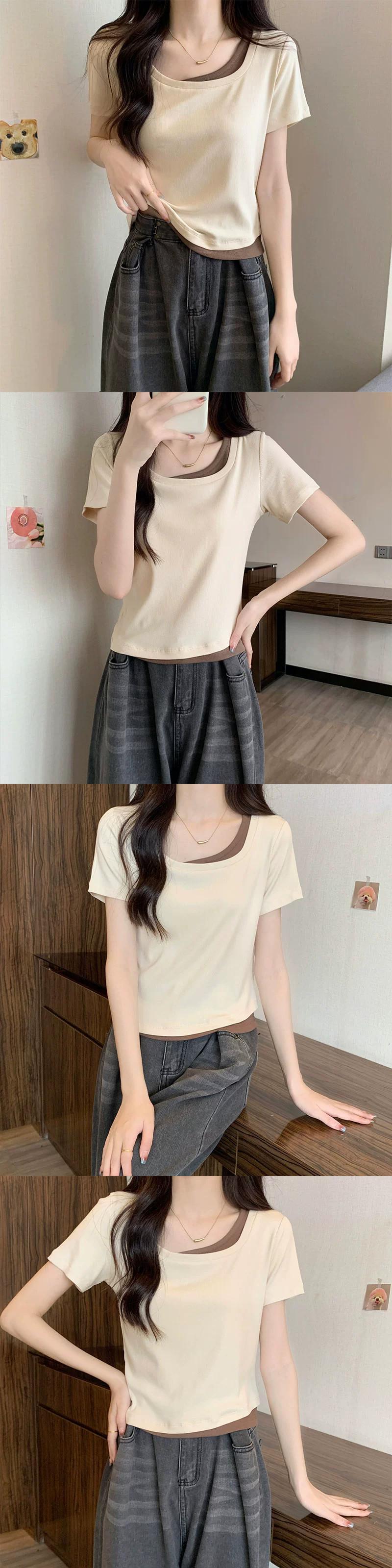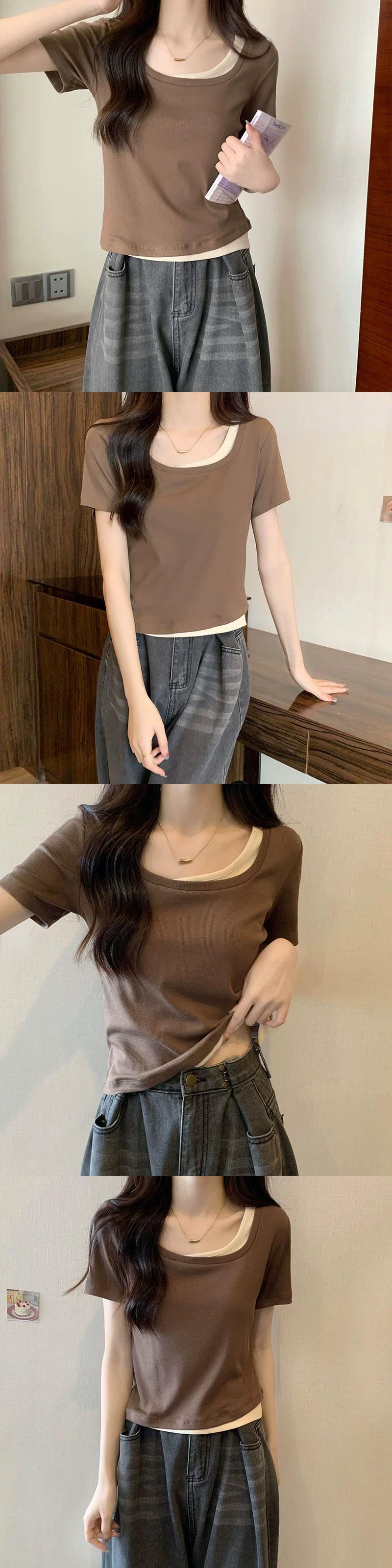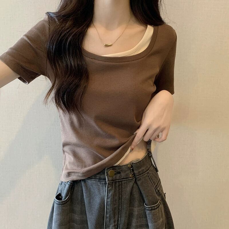 夏用コーヒー色のフェイクツーピース半袖Tシャツレディース。スリムでファッショナブルになるために。スクエアカラー、右肩、ショートトップ、トレンド。 レッド サマー 夏物 スクウェア 7460051147647356 | framboise21