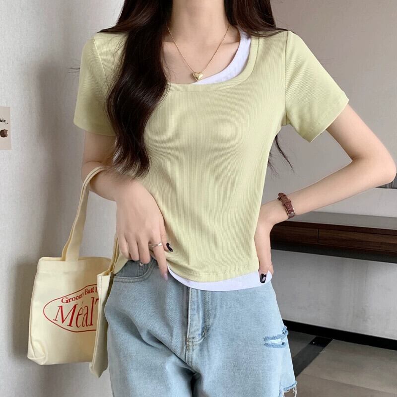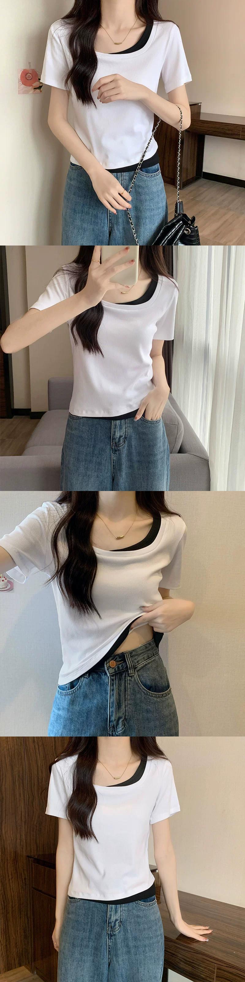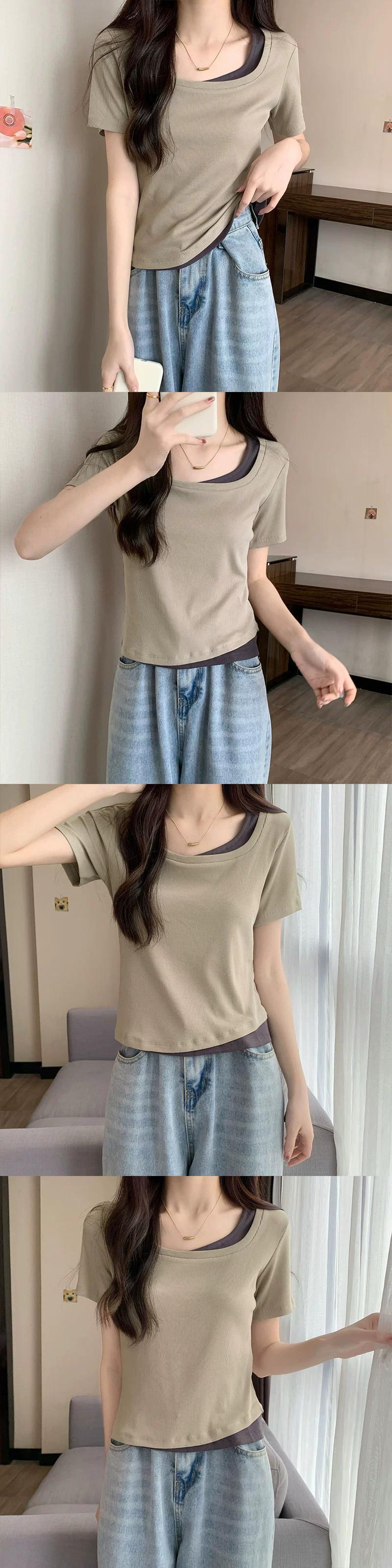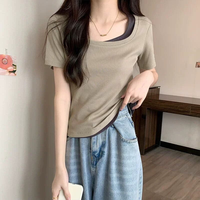 夏用コーヒー色のフェイクツーピース半袖Tシャツレディース。スリムでファッショナブルになるために。スクエアカラー、右肩、ショートトップ、トレンド。 レッド サマー 夏物 スクウェア 7460051147647356 | framboise21