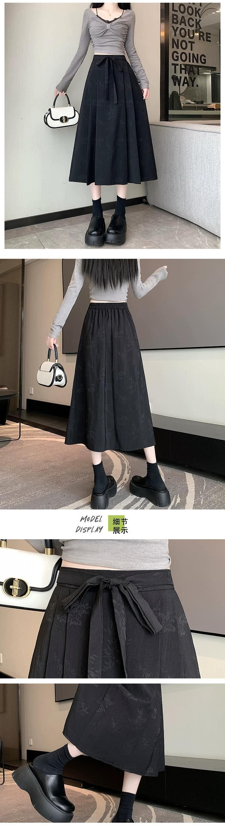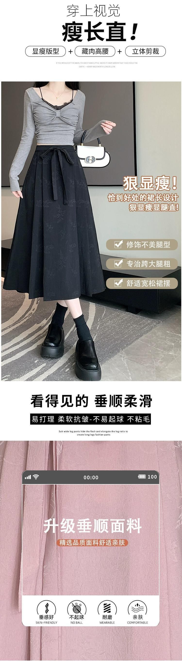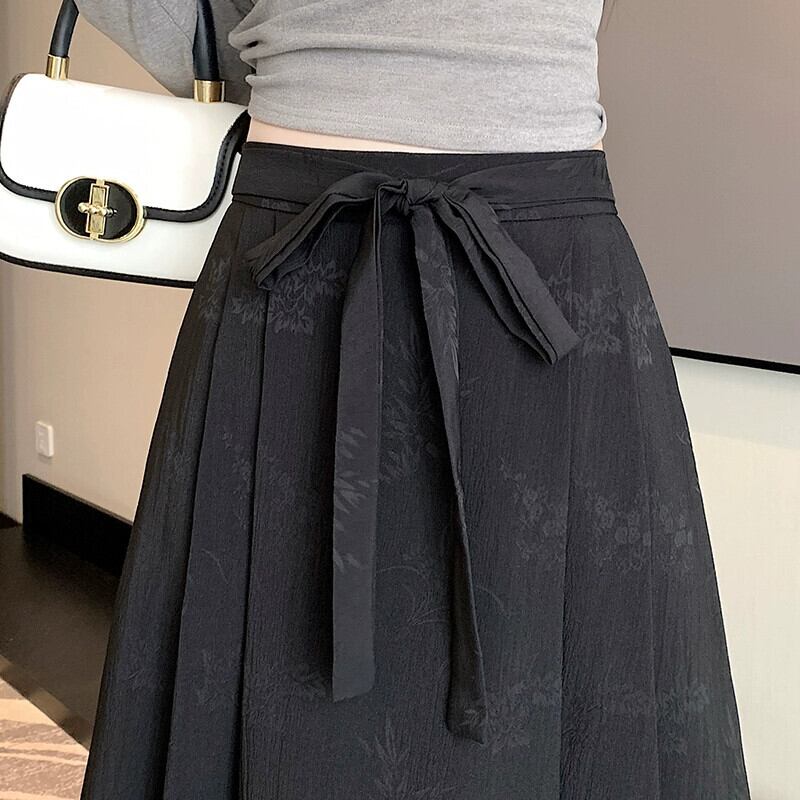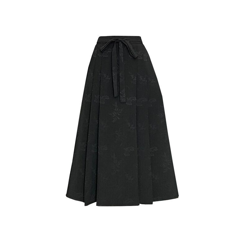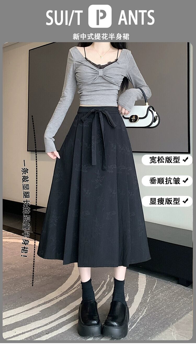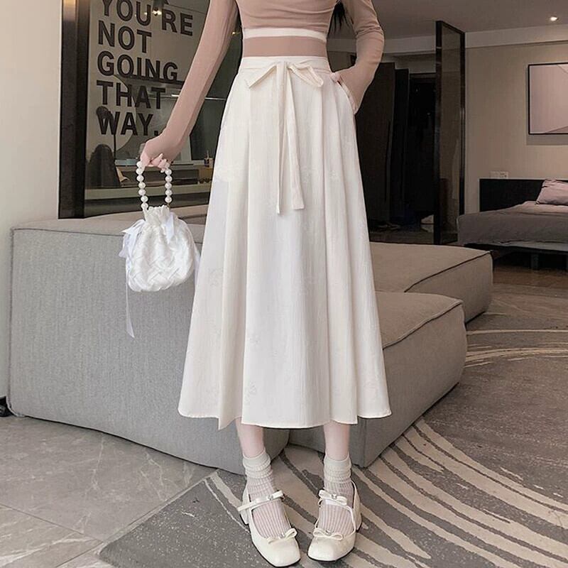 中国風国民風ジャカードスカート女性春と夏の弓ハイウエスト股間カバーと痩身ミッドレングスaラインプリーツスカート ハイウェスト リボン スプリング 春物 サマー 夏物 7460021542278934 | framboise21