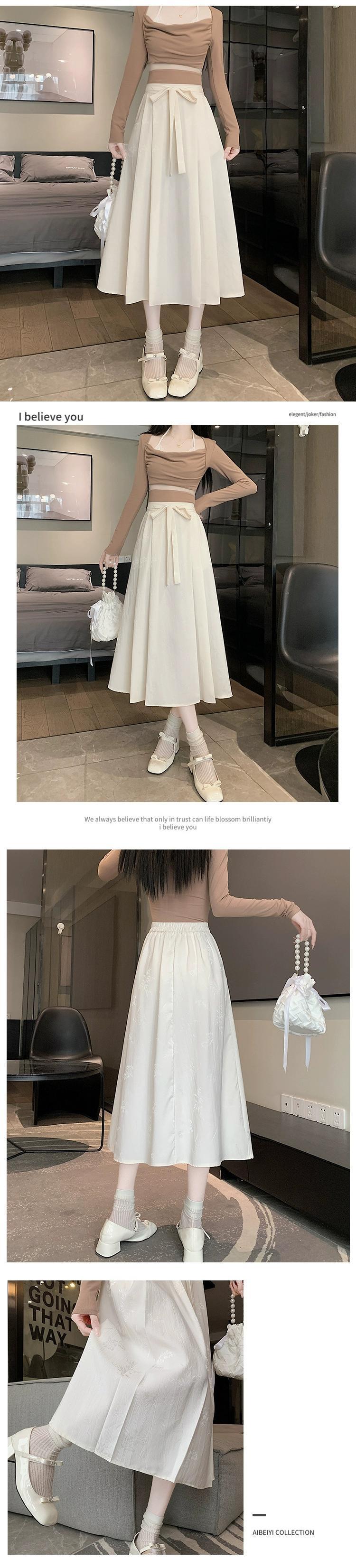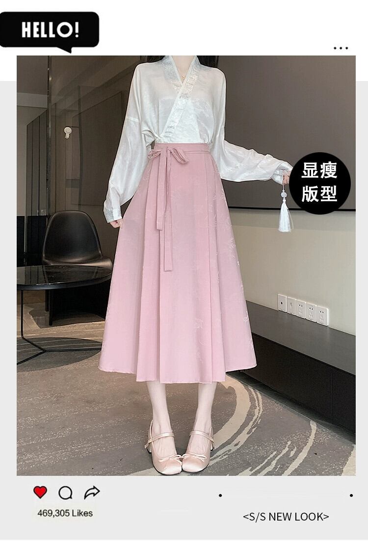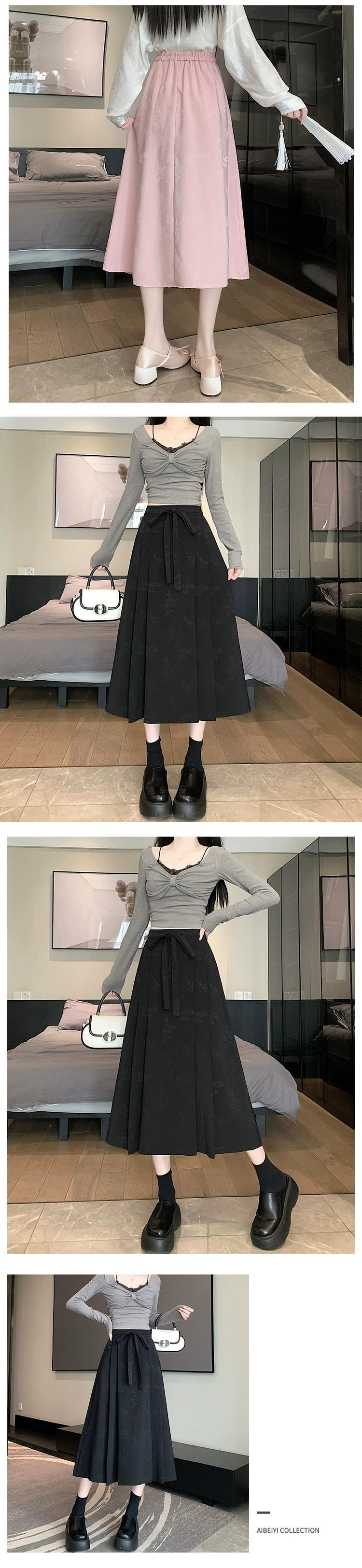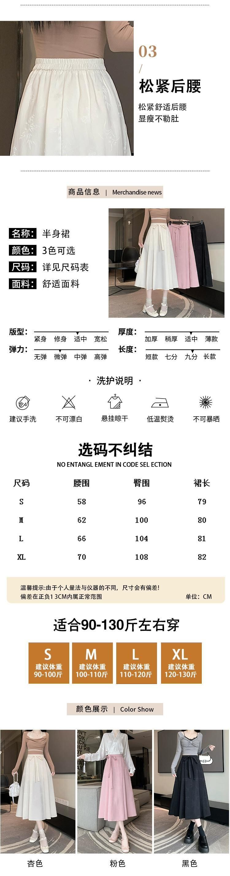 中国風国民風ジャカードスカート女性春と夏の弓ハイウエスト股間カバーと痩身ミッドレングスaラインプリーツスカート ハイウェスト リボン スプリング 春物 サマー 夏物 7460021542278934 | framboise21