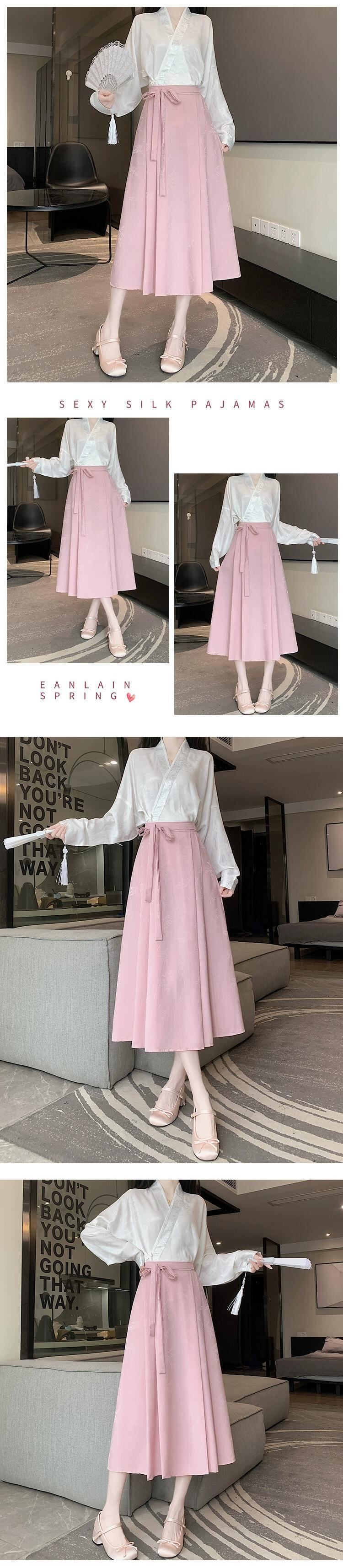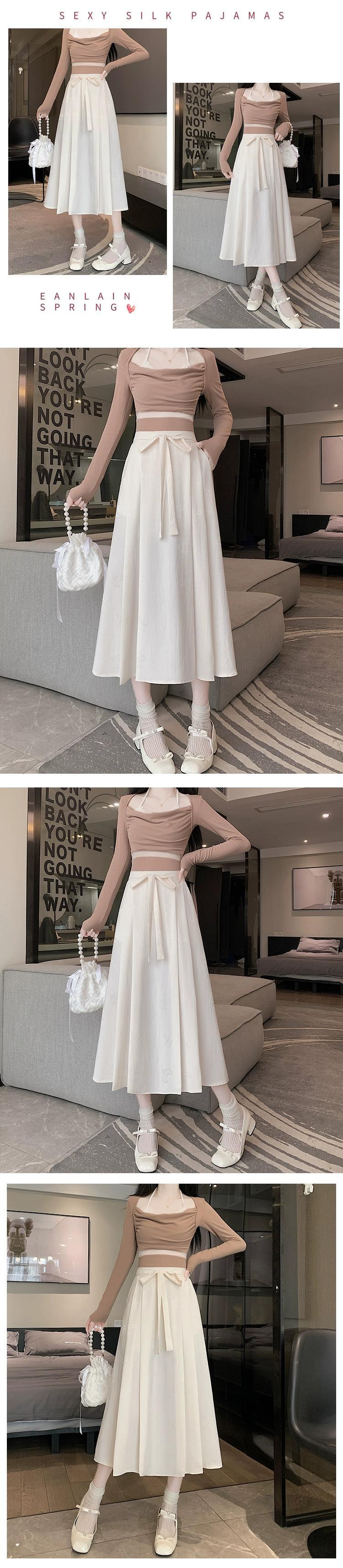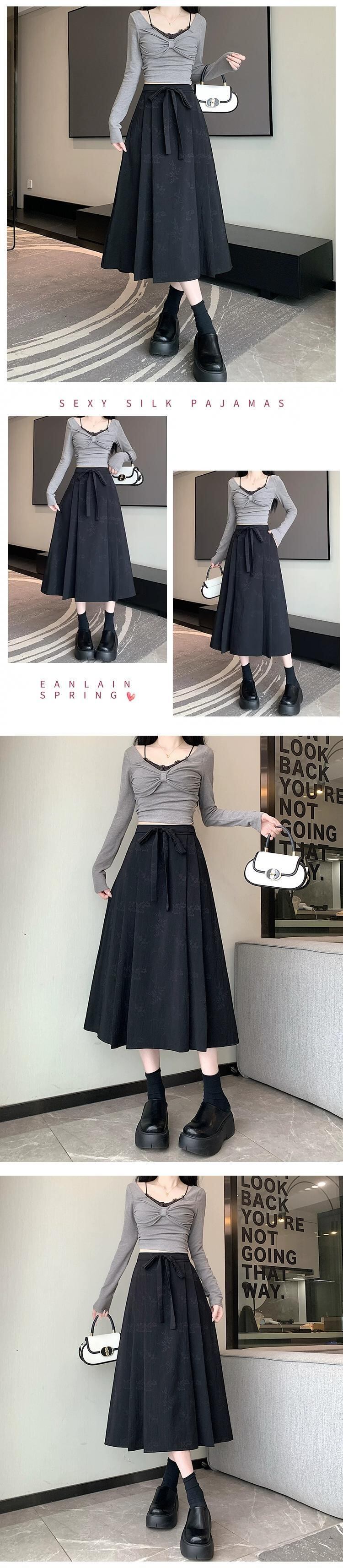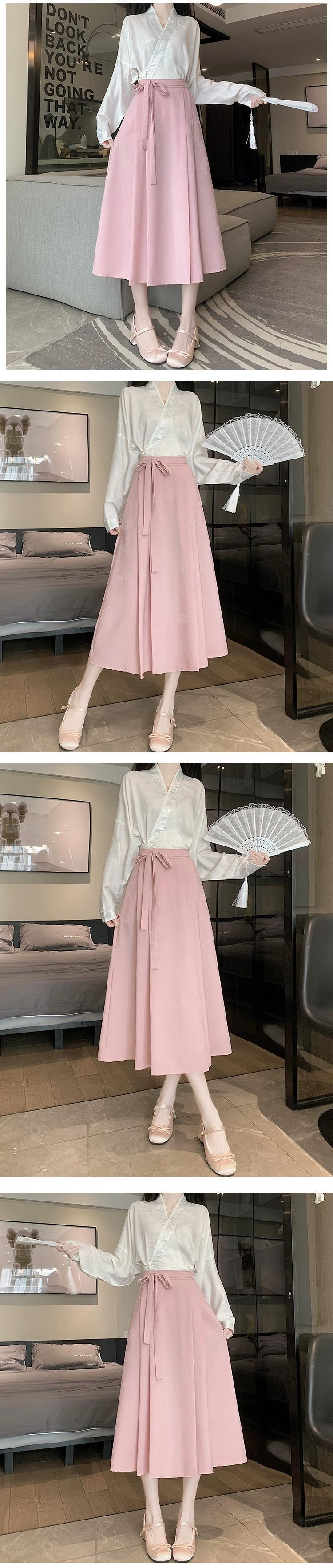 中国風国民風ジャカードスカート女性春と夏の弓ハイウエスト股間カバーと痩身ミッドレングスaラインプリーツスカート ハイウェスト リボン スプリング 春物 サマー 夏物 7460021542278934 | framboise21