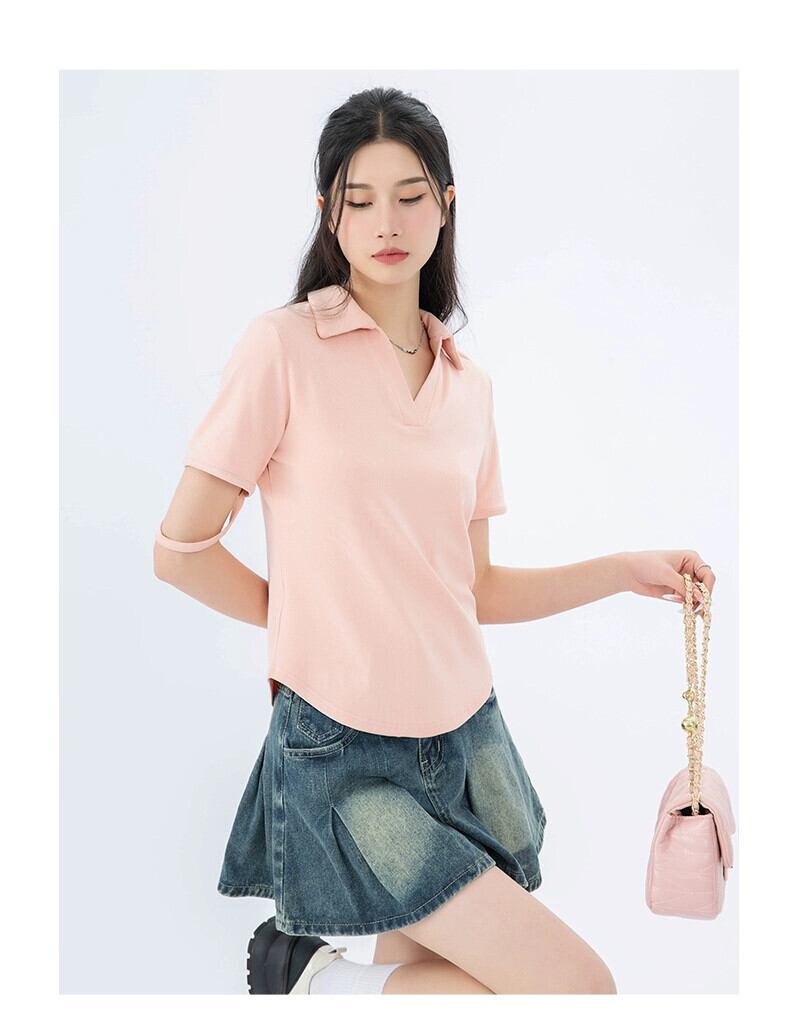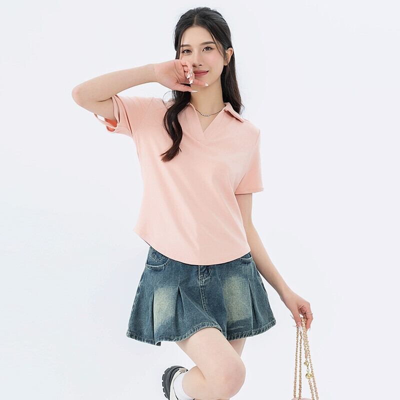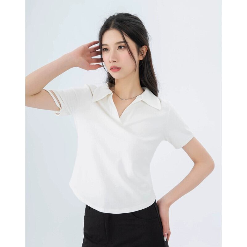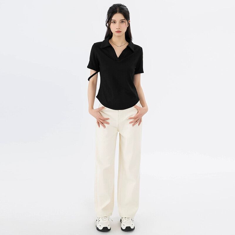 夏の白い右肩ポロカラー半袖Tシャツの女性、ファッショナブルでスタイリッシュなデザイン、美しいイレギュラーヘムトップス ホワイト サマー 夏物 7460033585611418 | framboise21