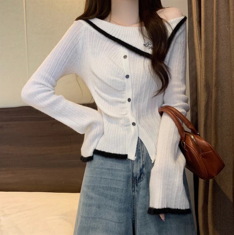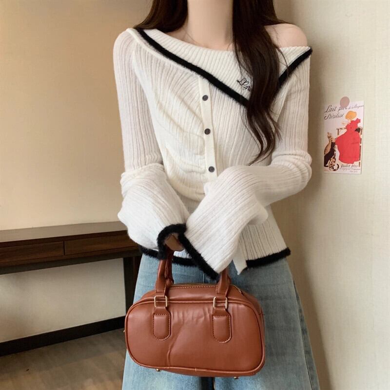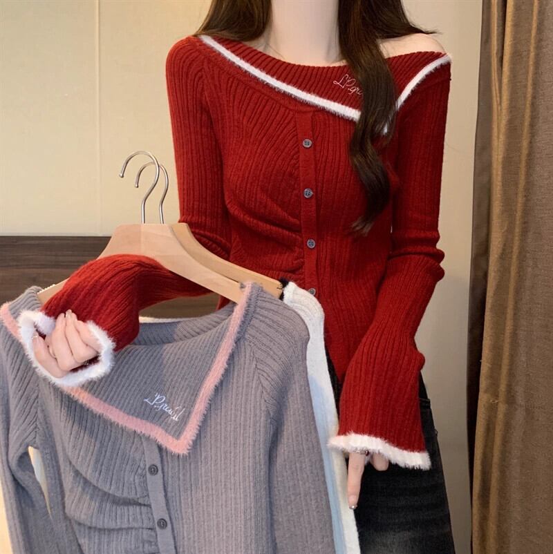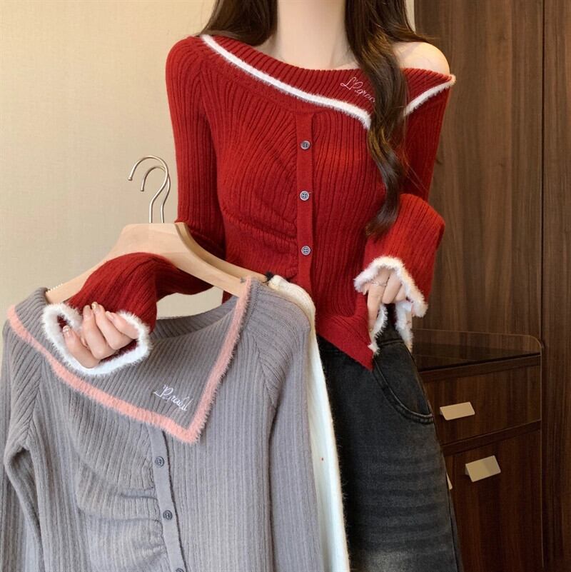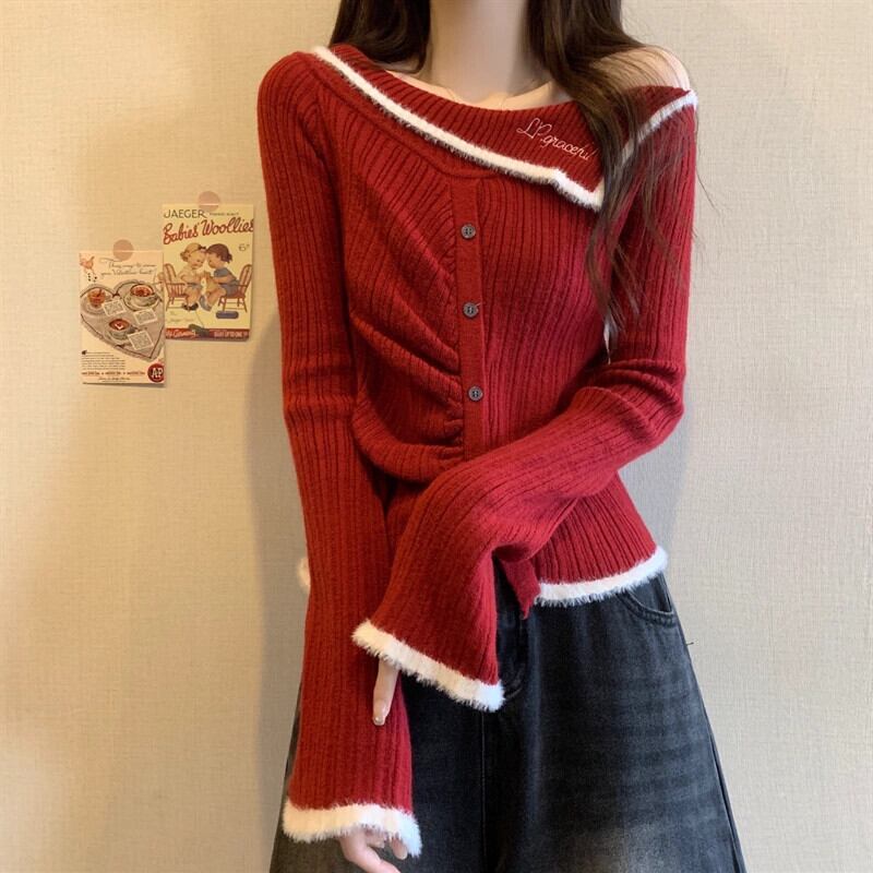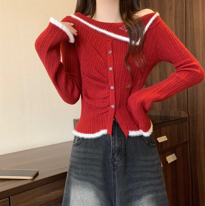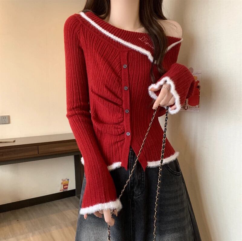 冬のワンショルダーの赤いニットボトムシャツの女性、ファッショナブルでハイエンド、スリムフィット、年のショートセーター付き レッド ウィンター 冬物 7460022317811373 | framboise21