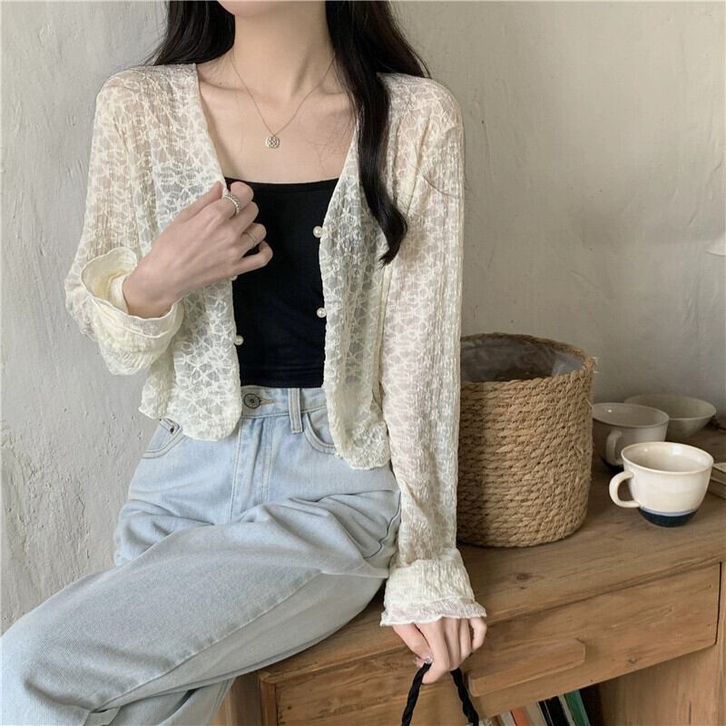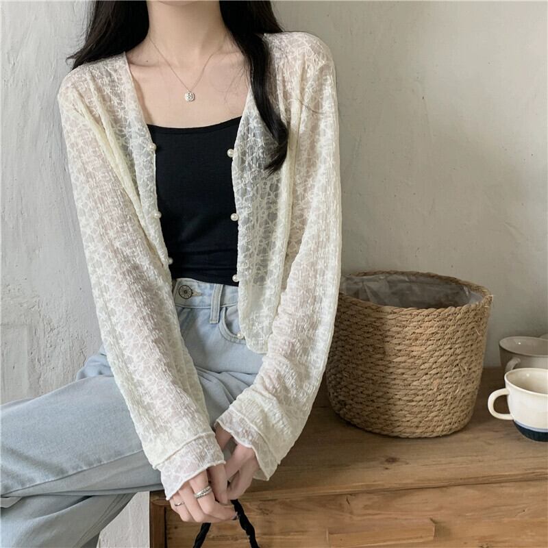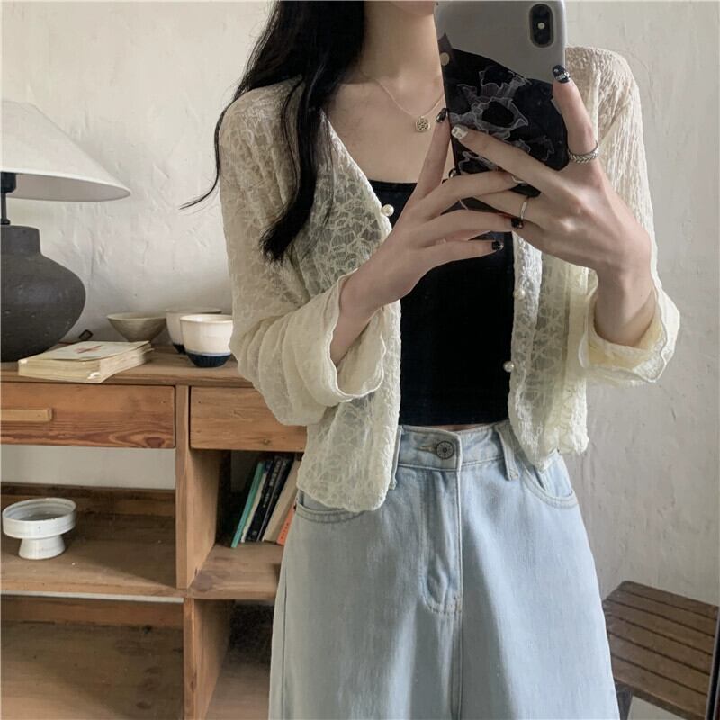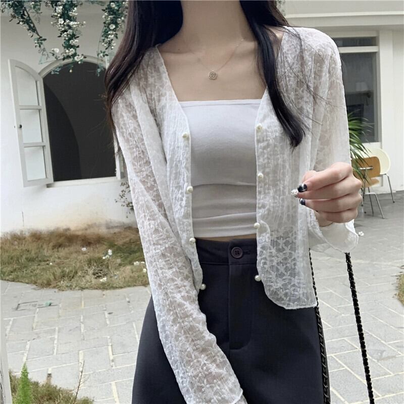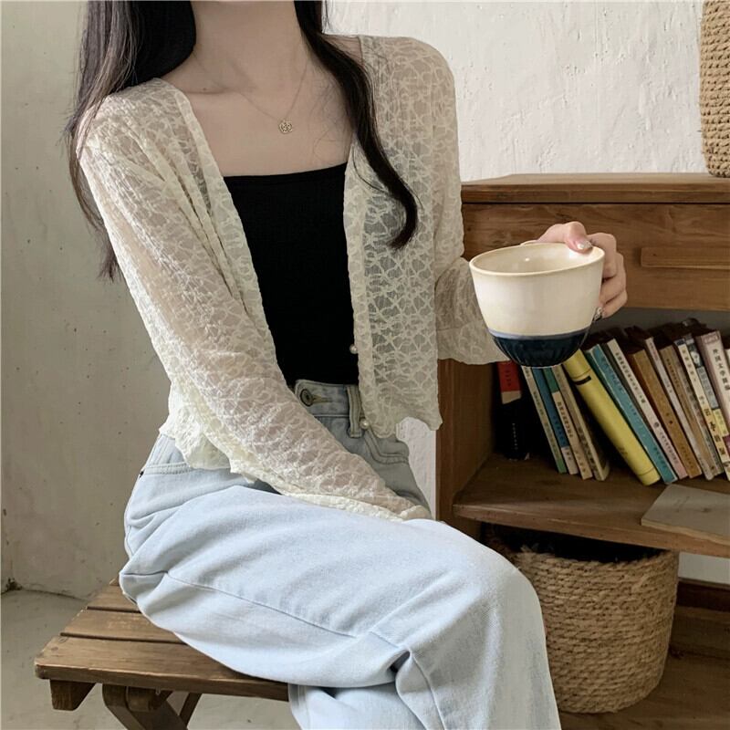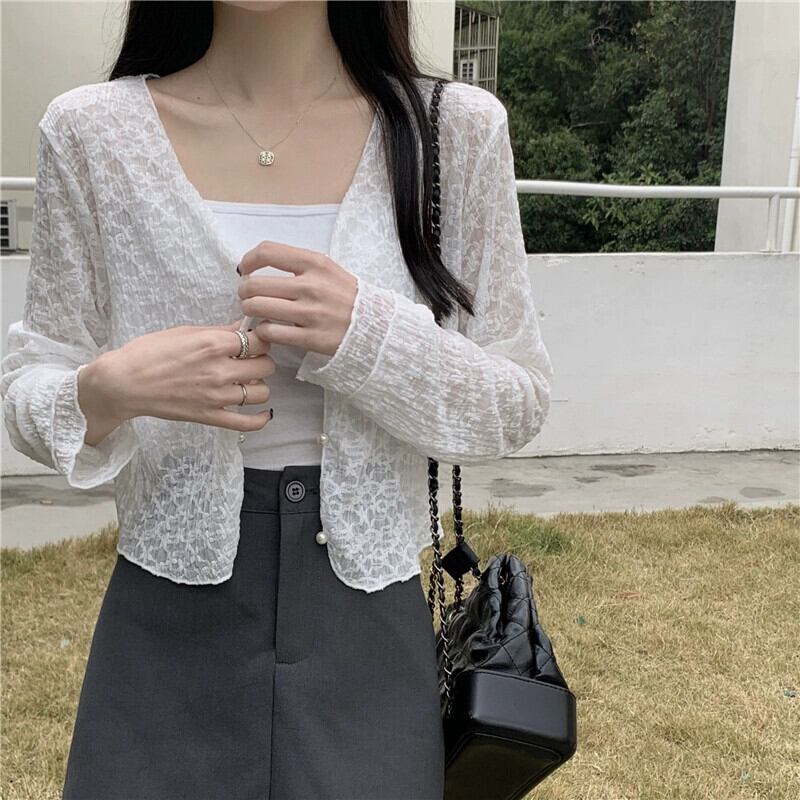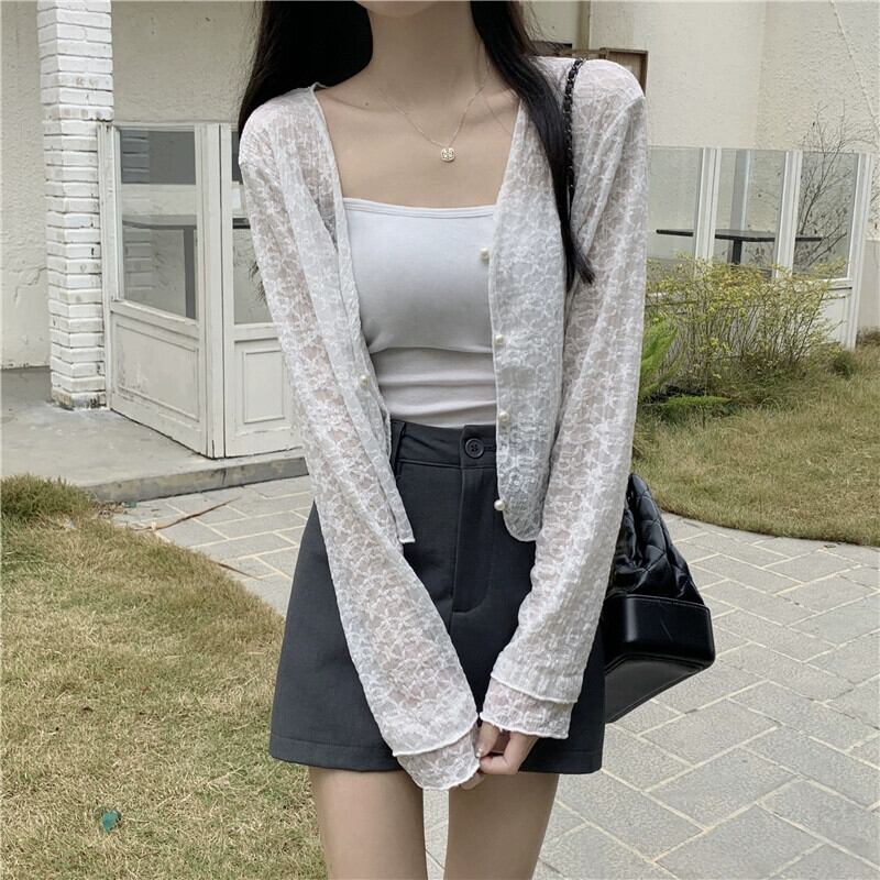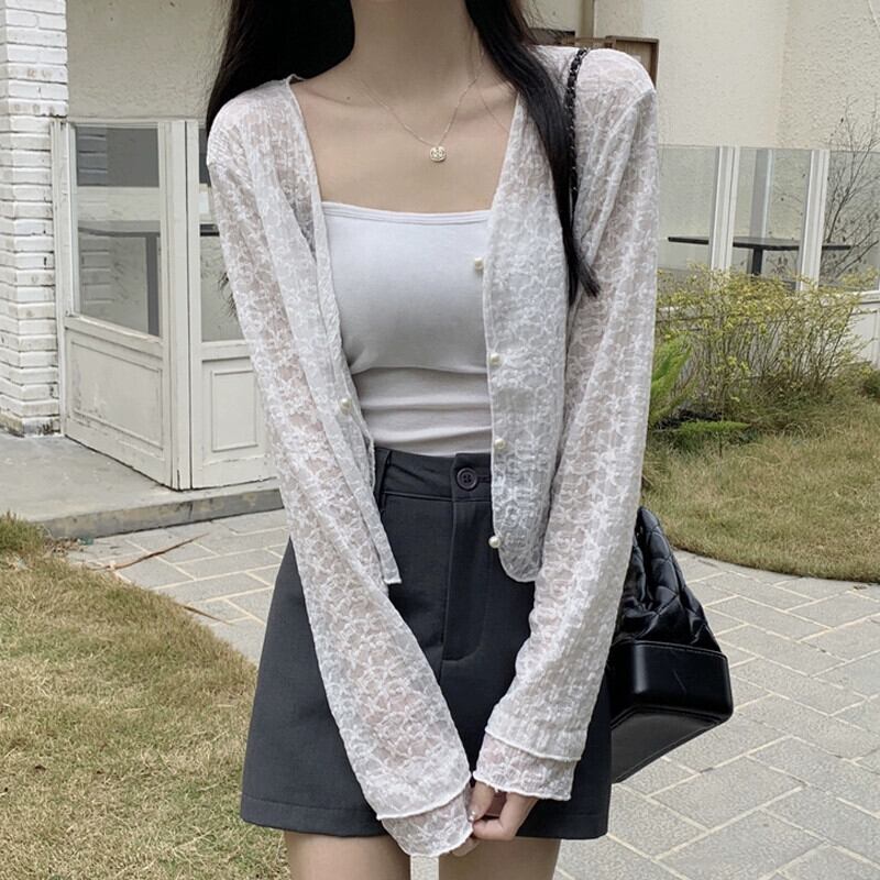 夏のデザインの白いレースの日焼け止めカーディガン女性、緩いサスペンダー、短い薄いショール ブラウス ジャケット ショート ホワイト サマー 夏物 7460030624084791 | framboise21