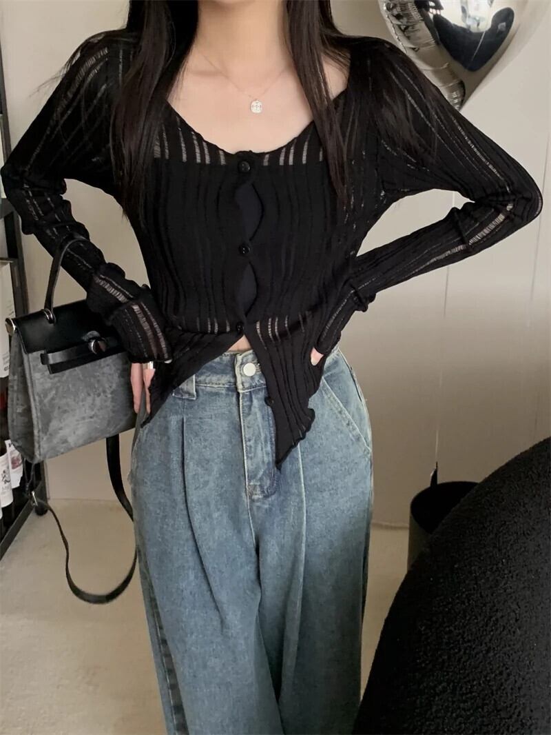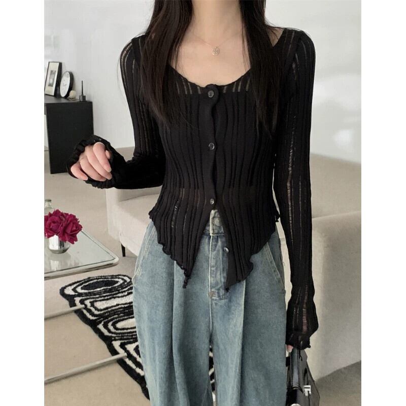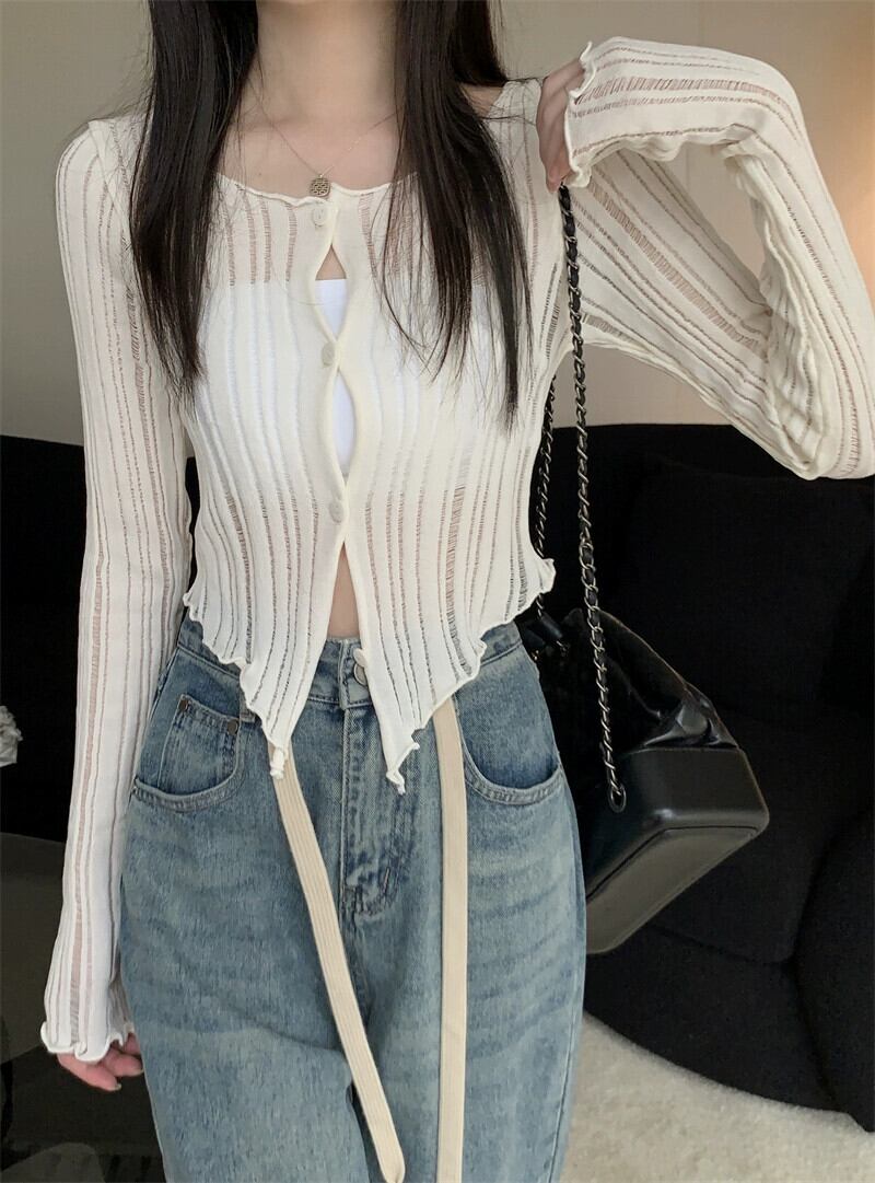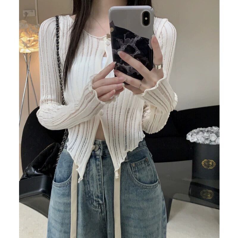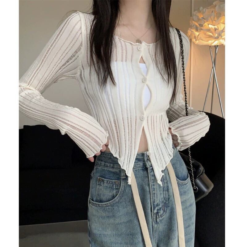 スタイリッシュなサスペンダーと不規則な菌のエッジが付いたショート トップを備えた夏のオフホワイトのニット日焼け止めカーディガン女性 サマー 夏物 7460038595493445 | framboise21