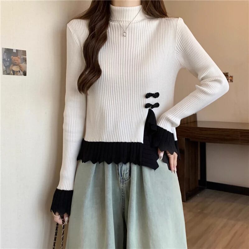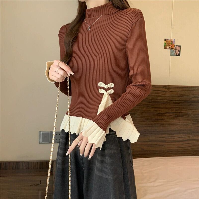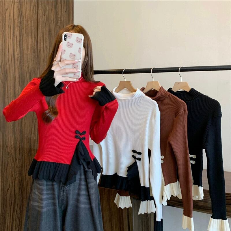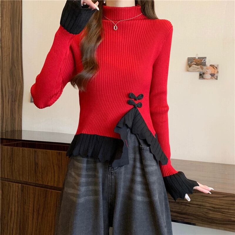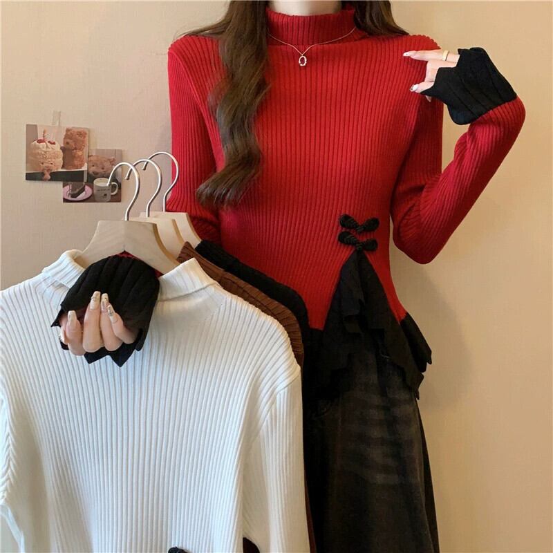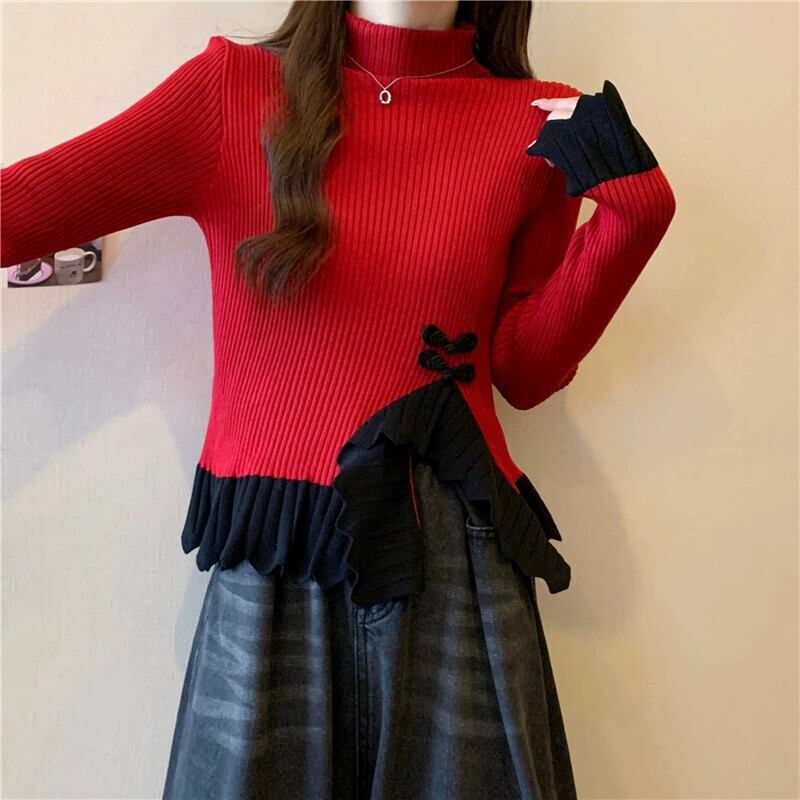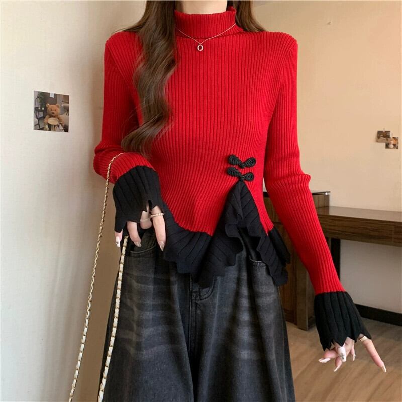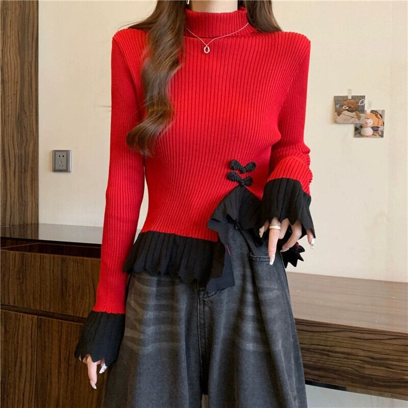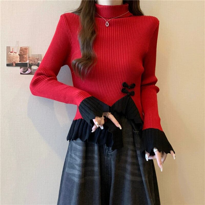 誕生年の大きな赤いニットボトムシャツ女性、冬、高級、スリムフィットインナーハーフタートルネック、トランペット長袖セーター ロング レッド ウィンター 冬物 7460035476954154 | framboise21