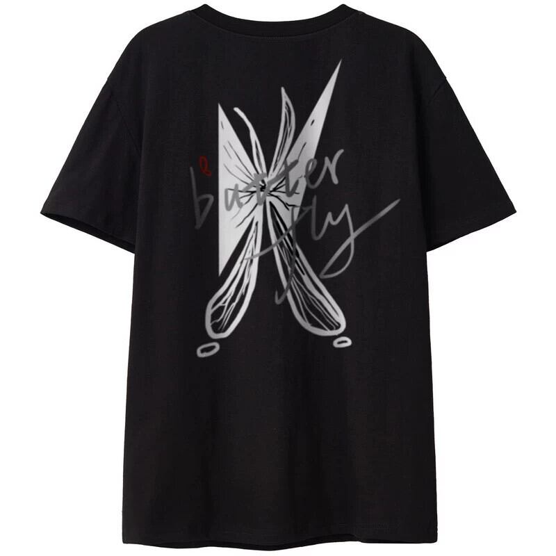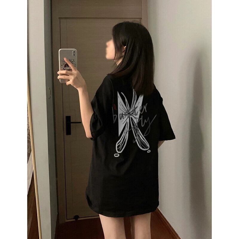 夏用のアメリカのハイストリート半袖Tシャツ、ゆったりとした万能なブラックコットンバタフライプリントラウンドネックトップ サマー 夏物 Oネック 7460094032934013 | framboise21