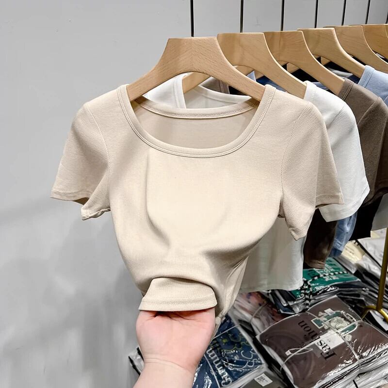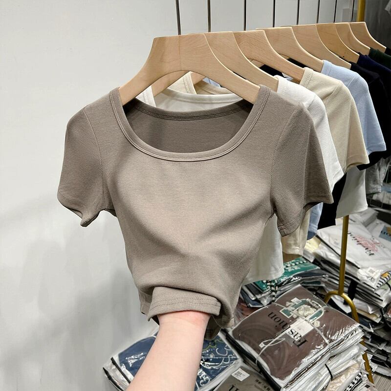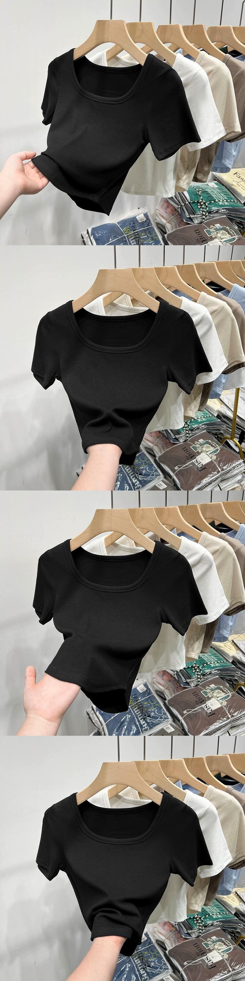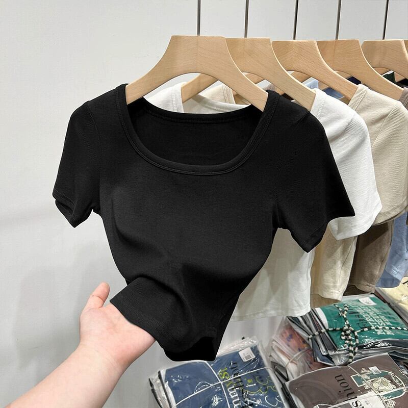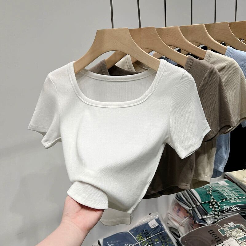 イレギュラーショルダー半袖Tシャツレディース、夏デザイン、スリムフィット、カーブ裾、スクエアネックショートトップ、トレンディ サマー 夏物 スクウェア 7460012088809835 | framboise21