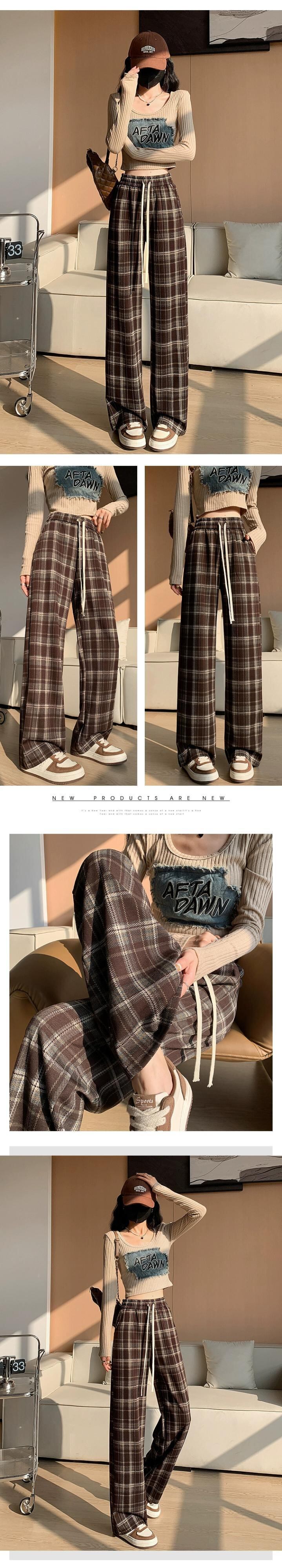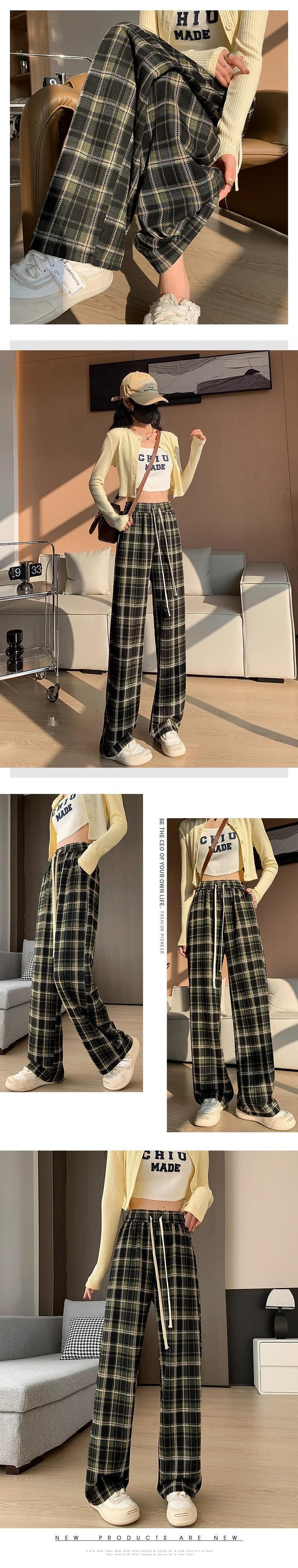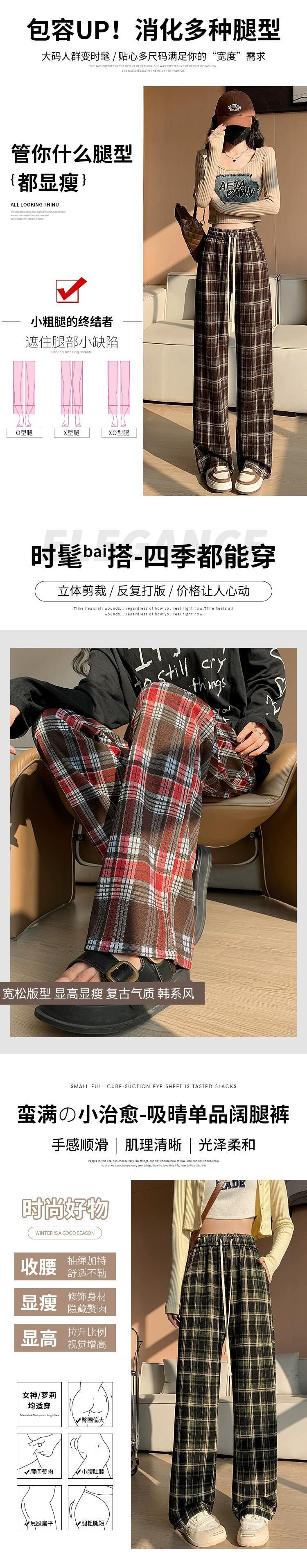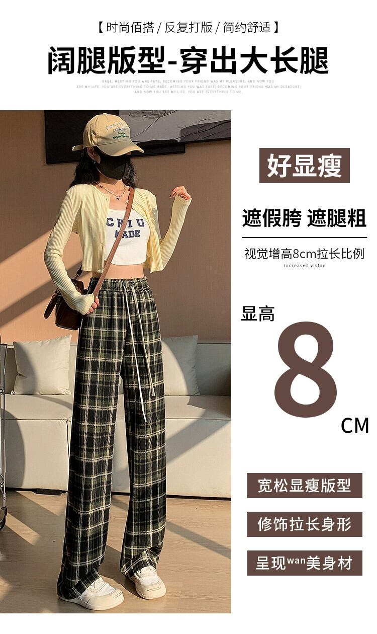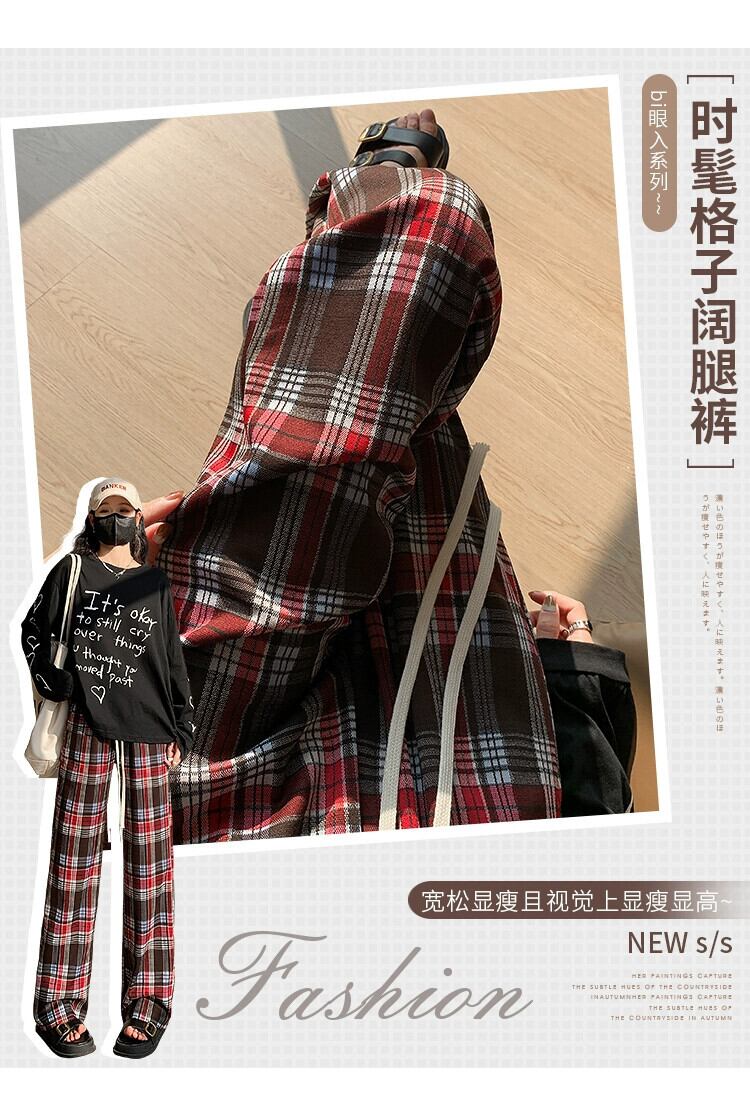 細いチェック柄ワイドレッグパンツレディース、春と秋のアメリカンレトロストレートレッグカジュアルパンツ、ハイウエスト、スリム、フロアレングスパンツ スプリング 春物 オータム 秋物 7460014023010140 | framboise21